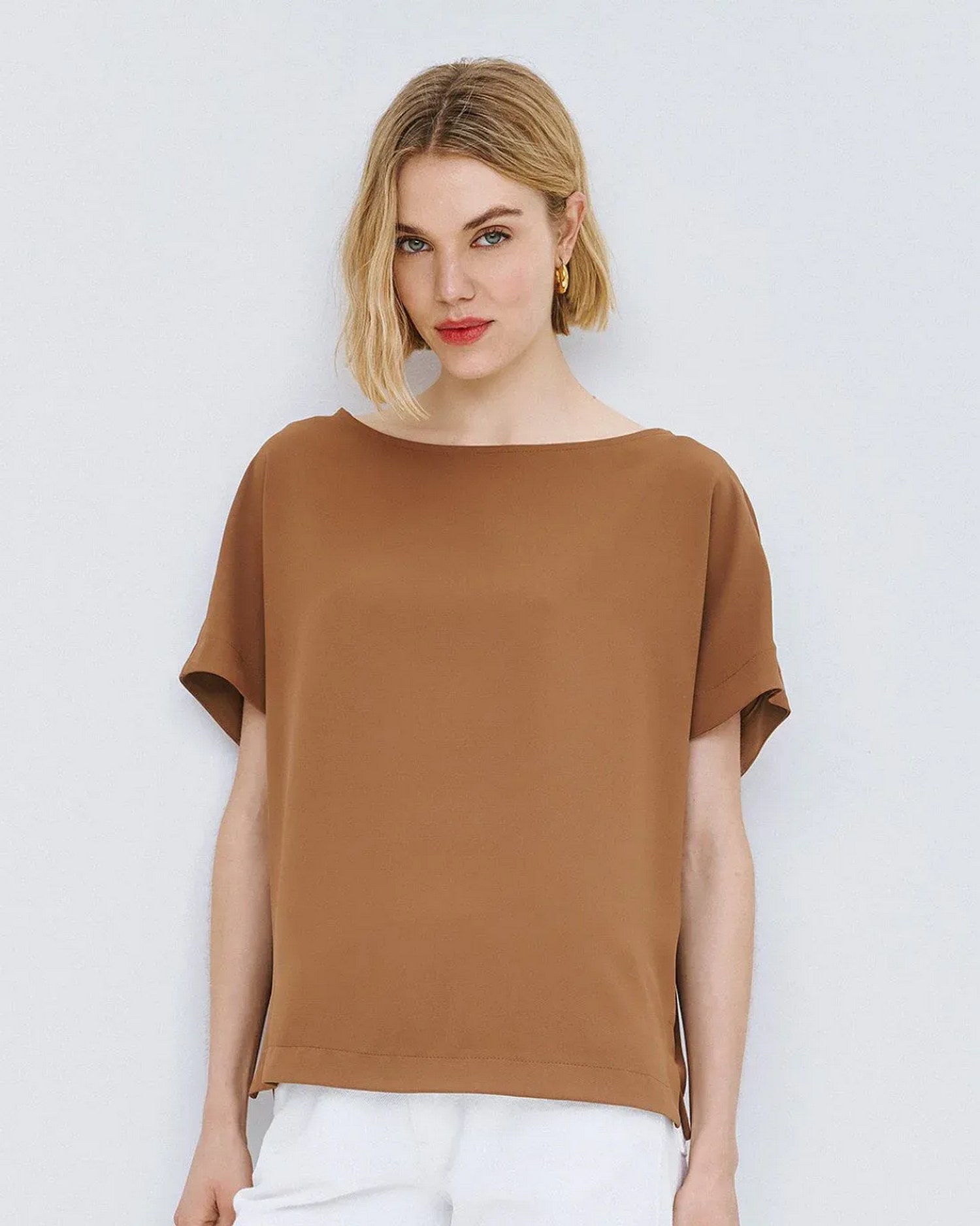 Camicetta con maniche corte, scollo a barca, pieghe sul retro e piccoli spacchi laterali.