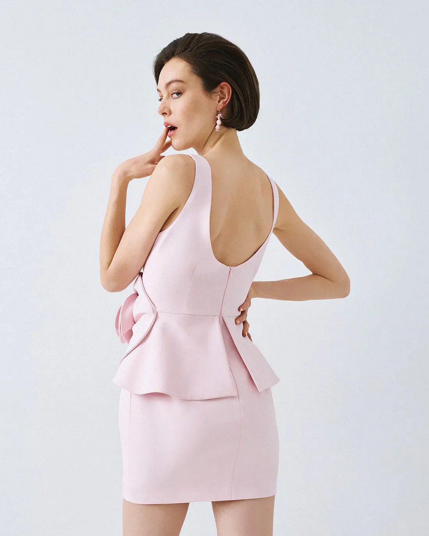 Mini abito senza maniche con scollo a barca, schiena scoperta, dettaglio con volant a forma di fiore sul davanti e chiusura posteriore con zip.