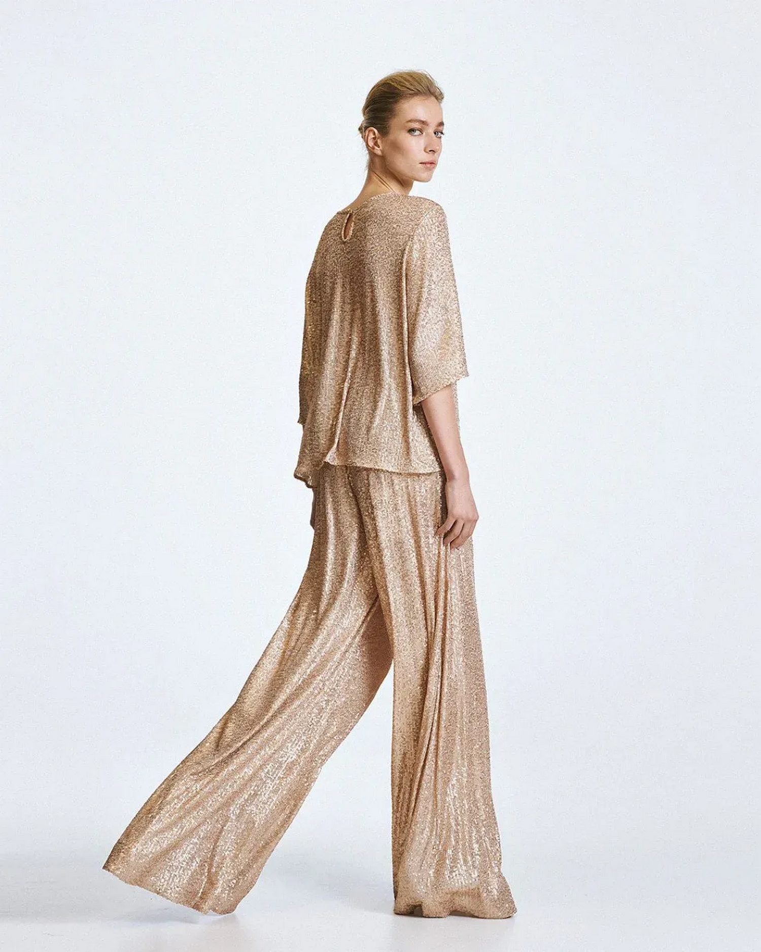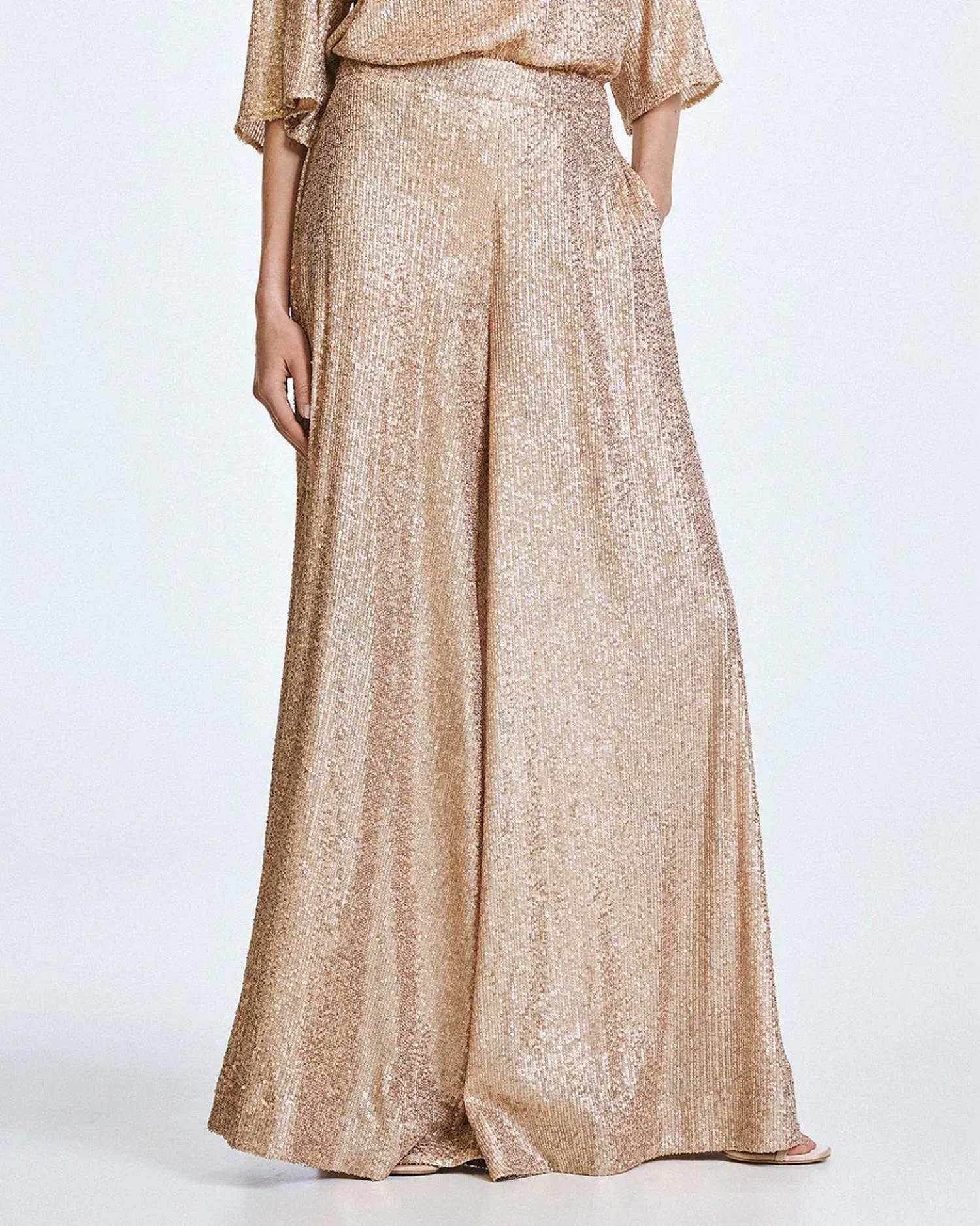 Pantaloni a gamba larga con paillettes, elastico in vita e cintura removibile.