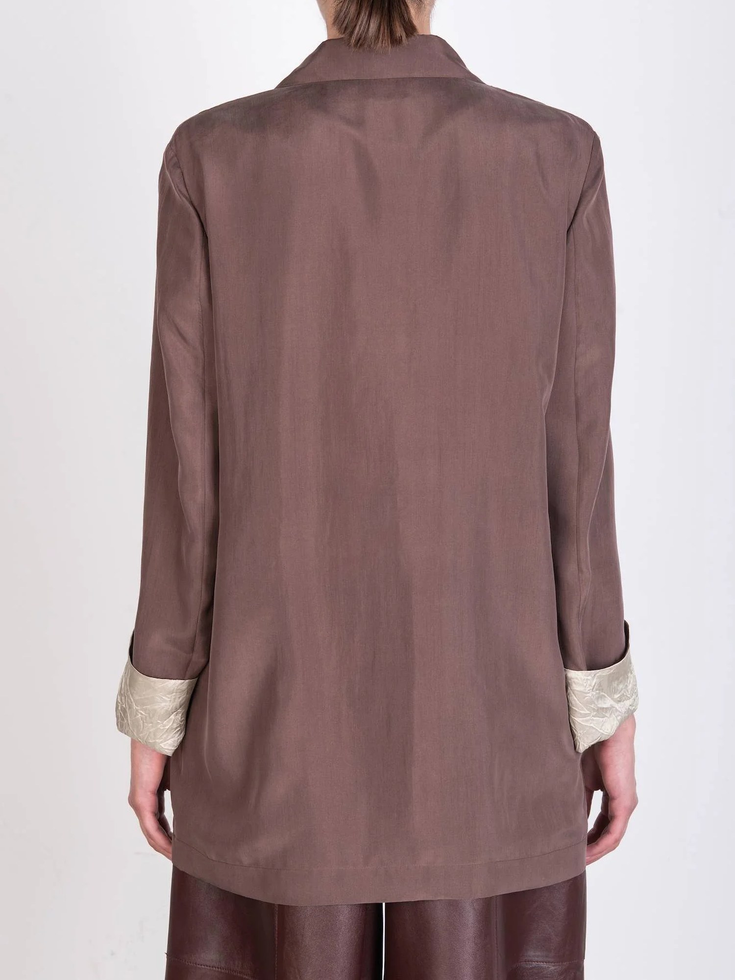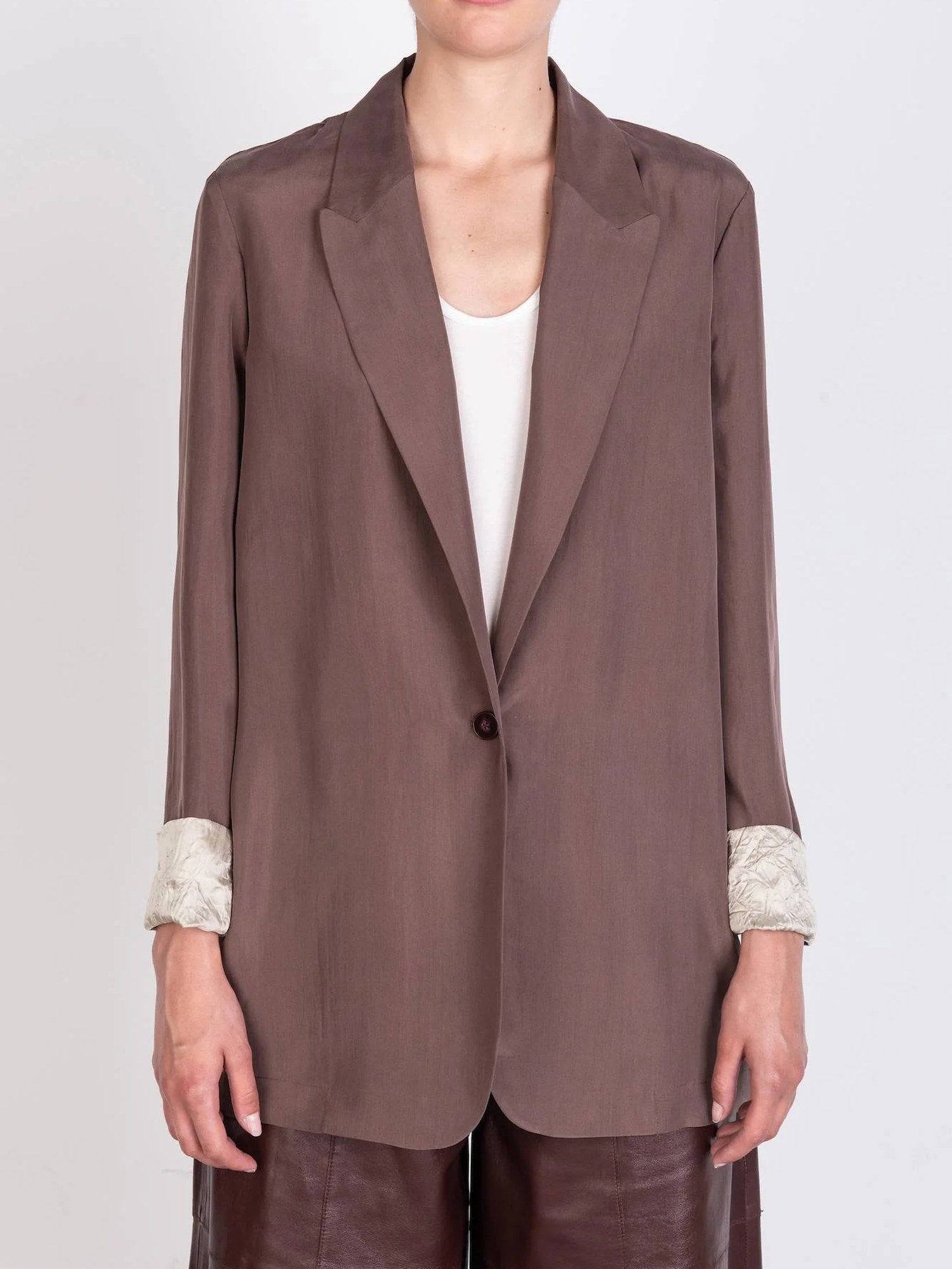 Blazer monopetto in 100 % seta con rever a lancia, chiusura frontale con un bottone e polsini con fodera interna a contrasto.