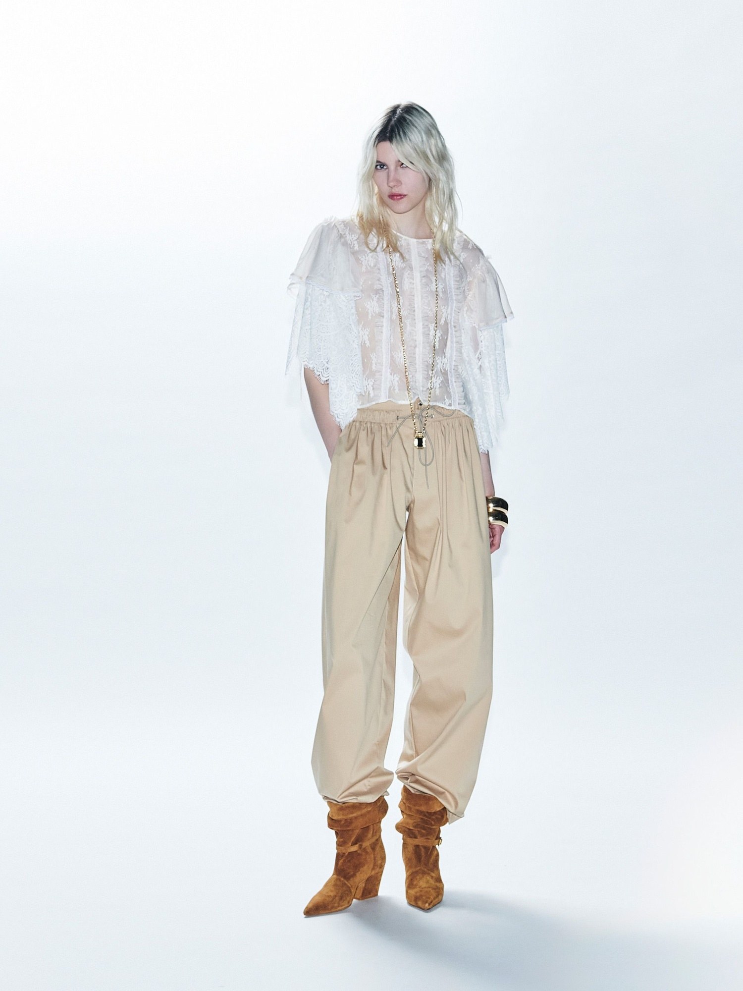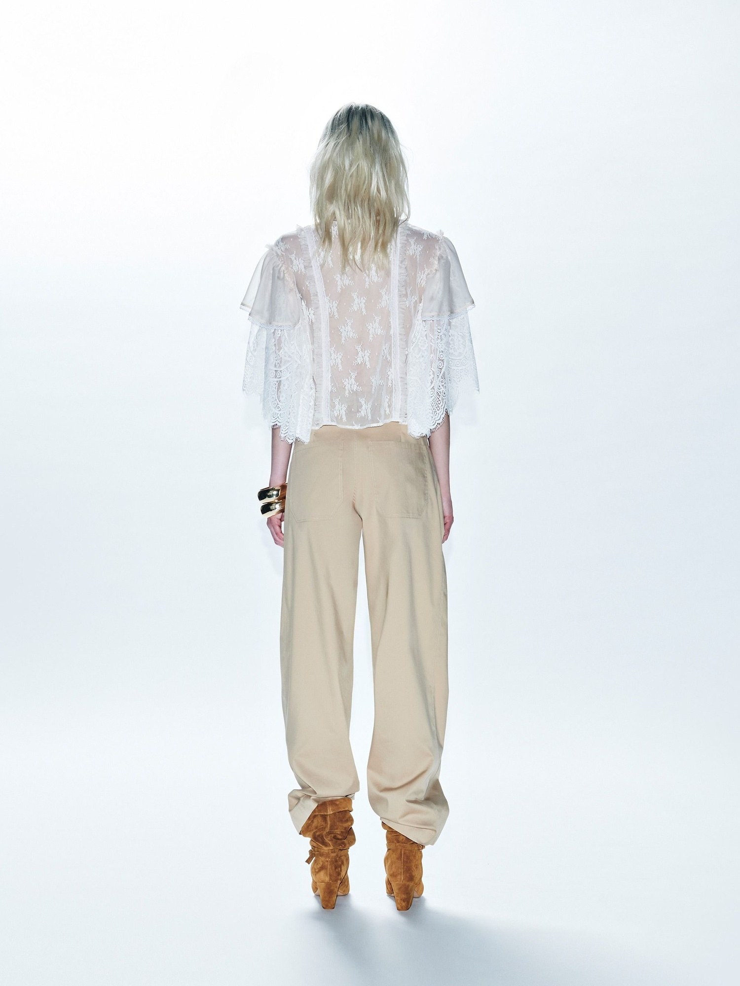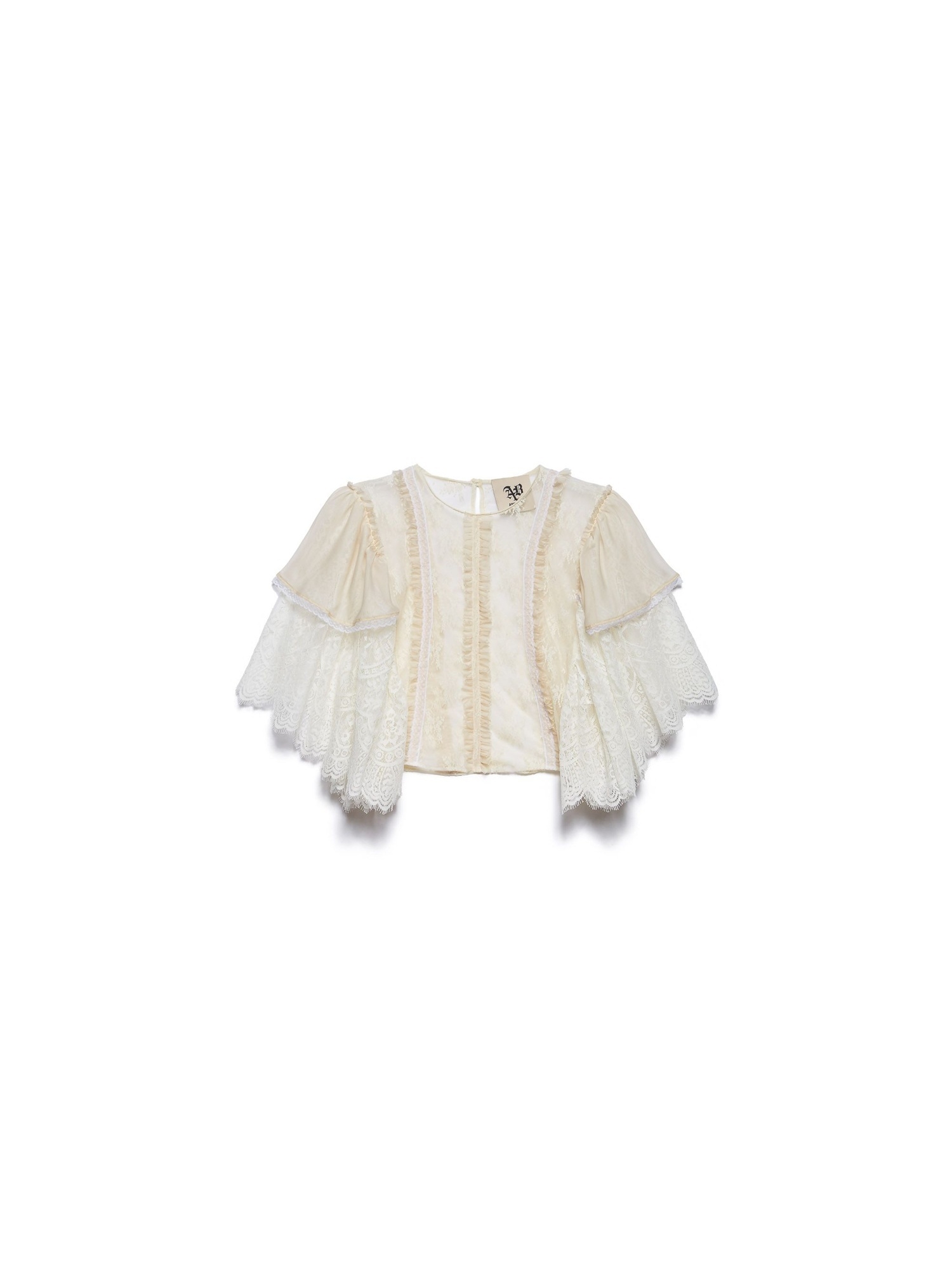 Top crop in pizzo con balze ad altezza spalle e rouches.
