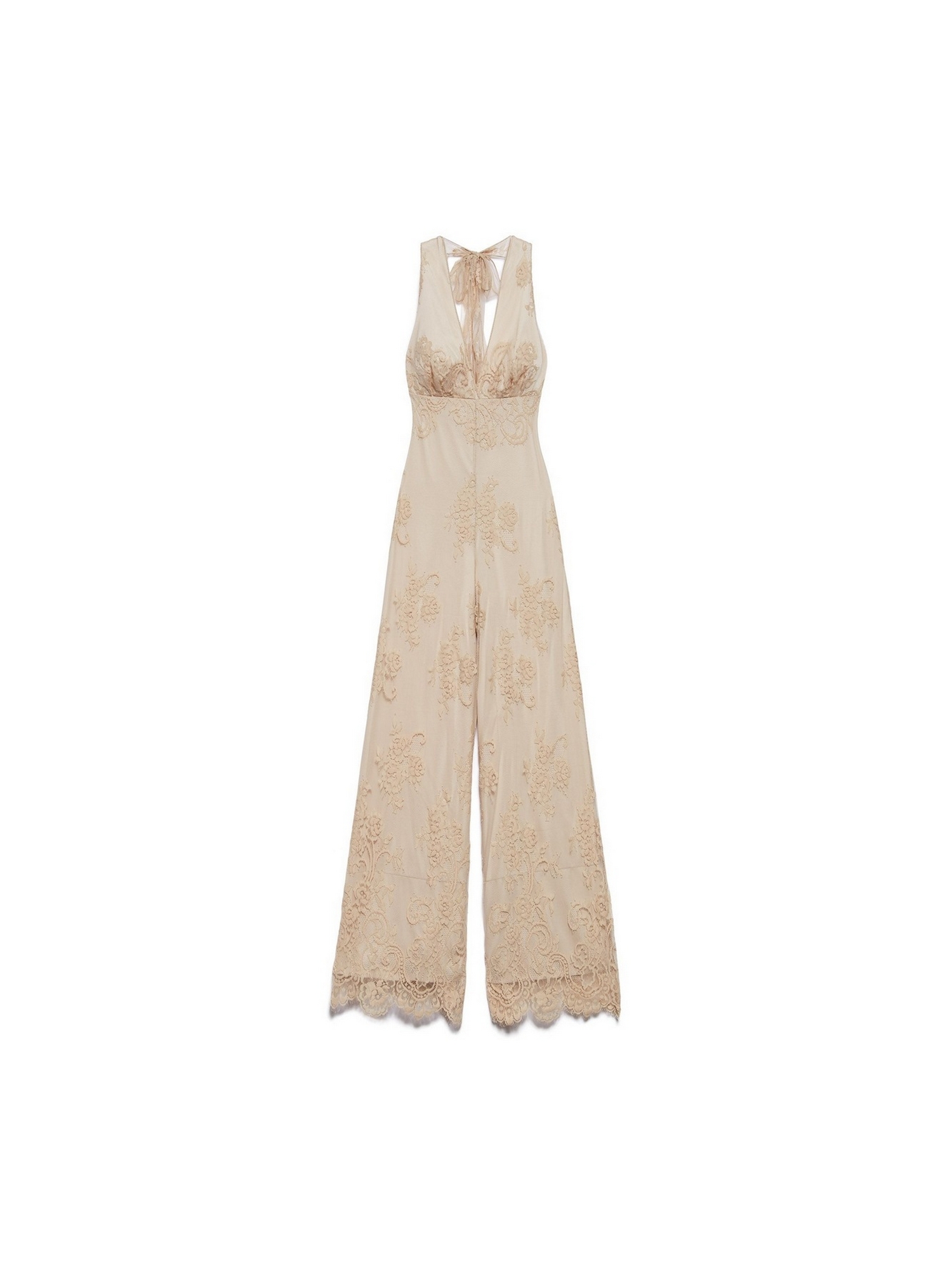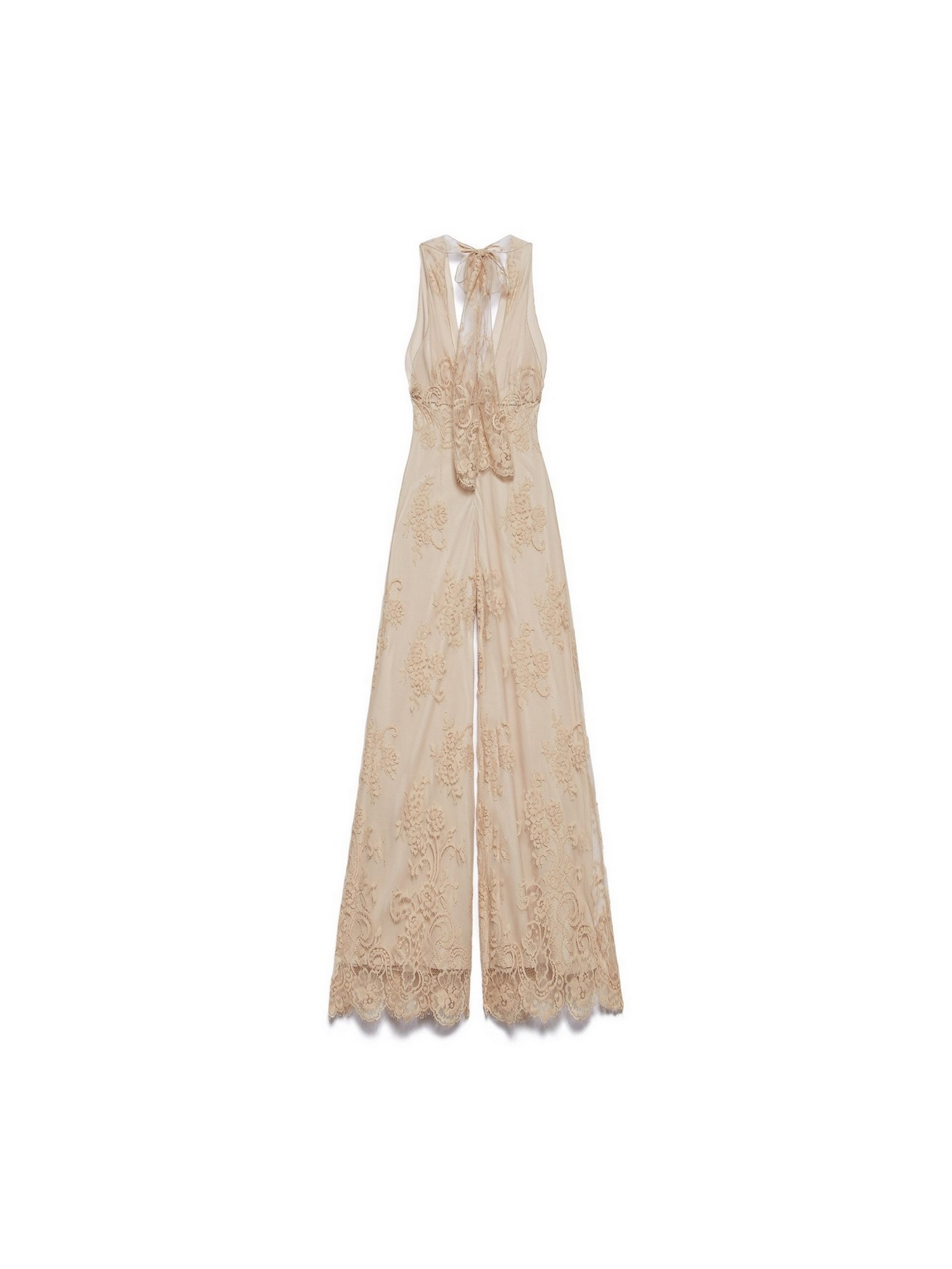 Tuta lunga in pizzo con scollo all'americana e ricami all over.