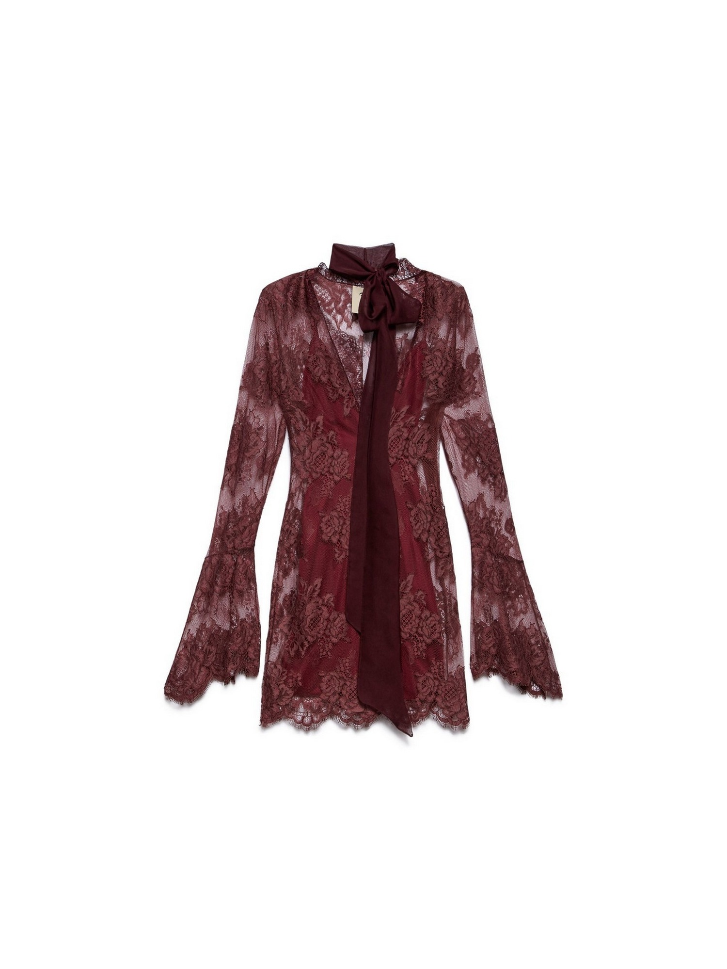 Mini abito sheer in pizzo con ricami floreali e sottoveste in fodera e chiffon integrata.