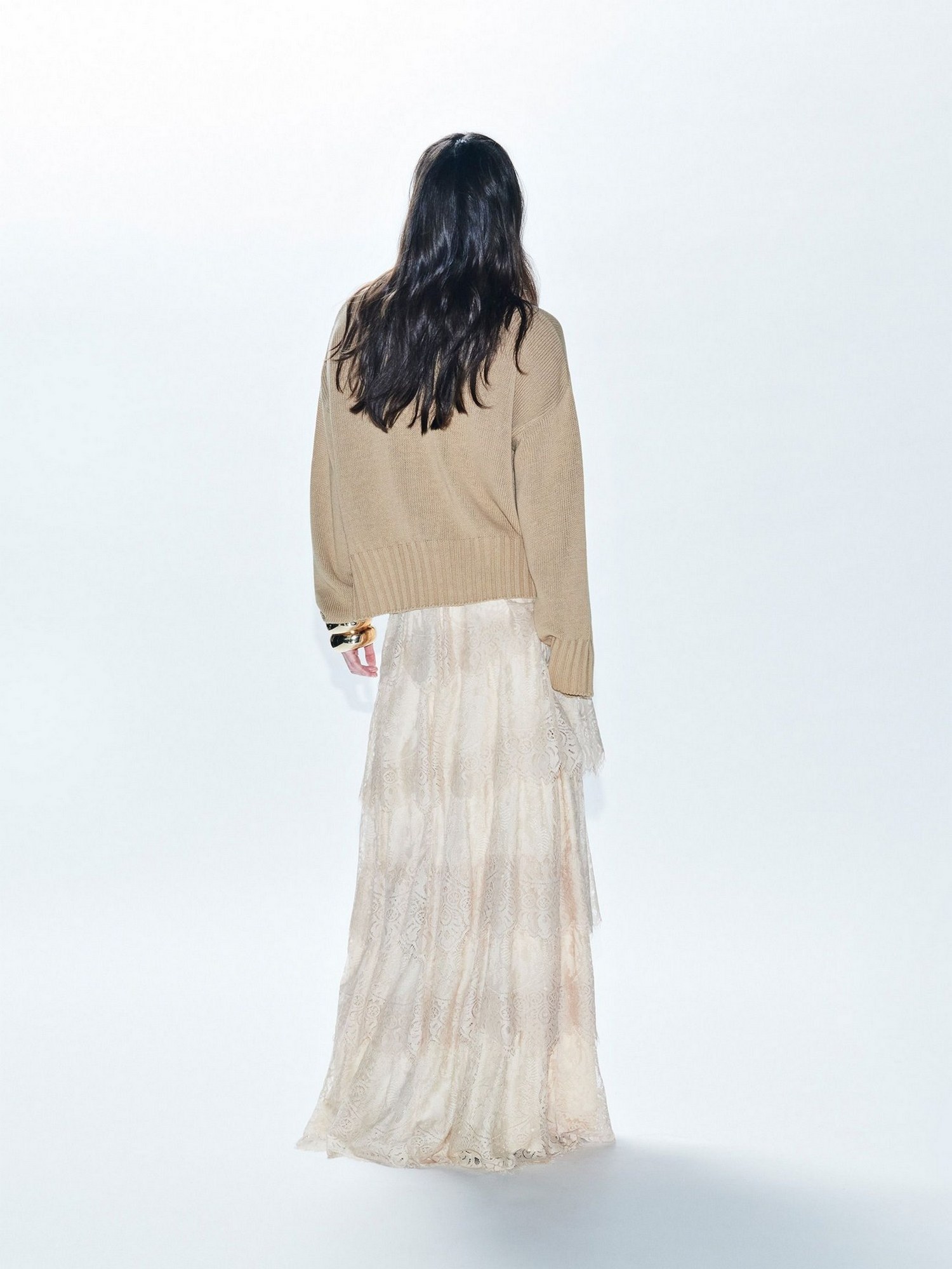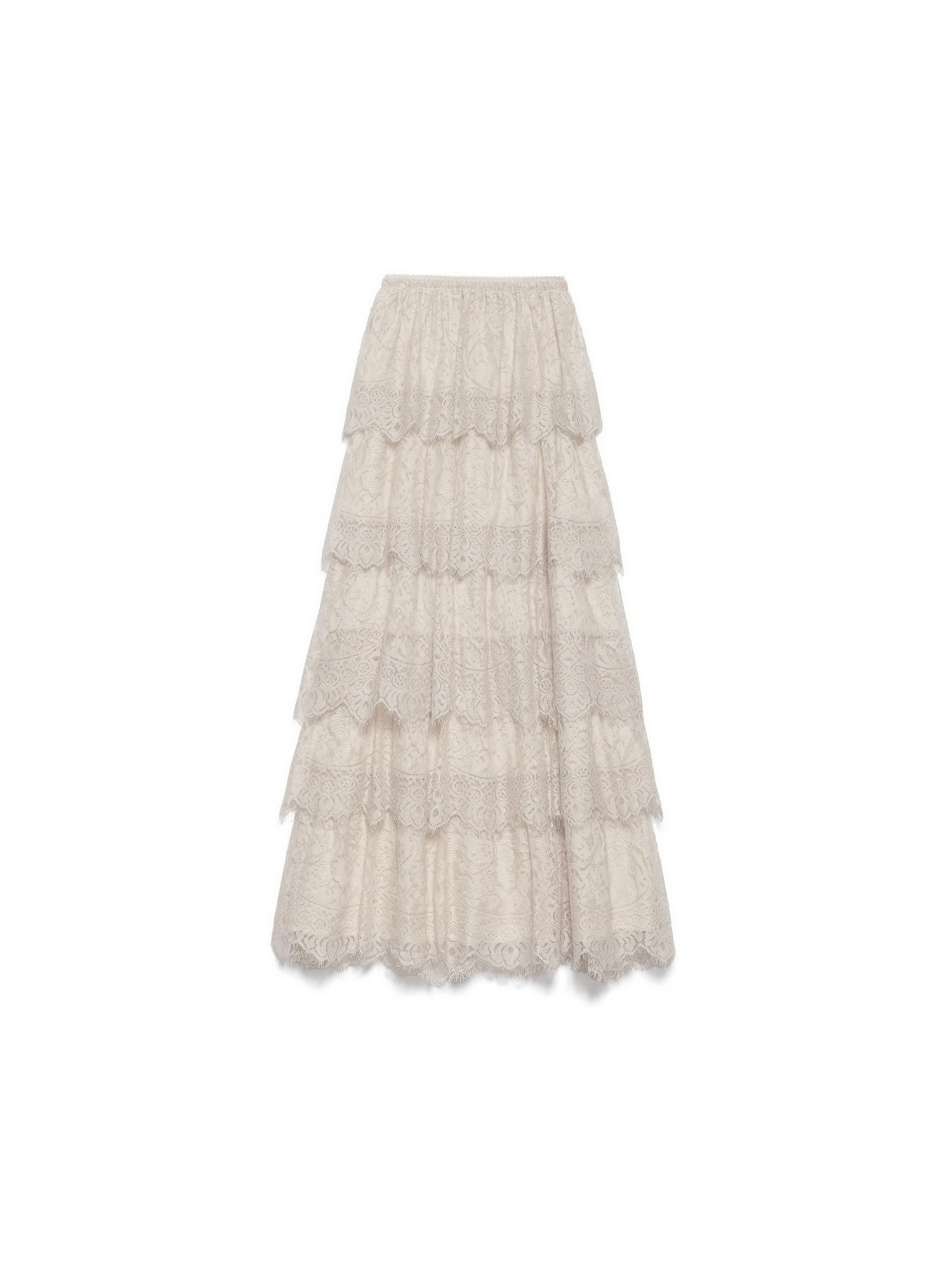 Gonna lunga in pizzo strutturata da balze e ricami all over.