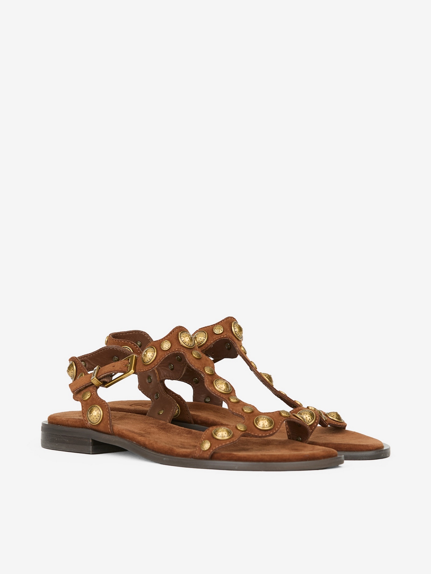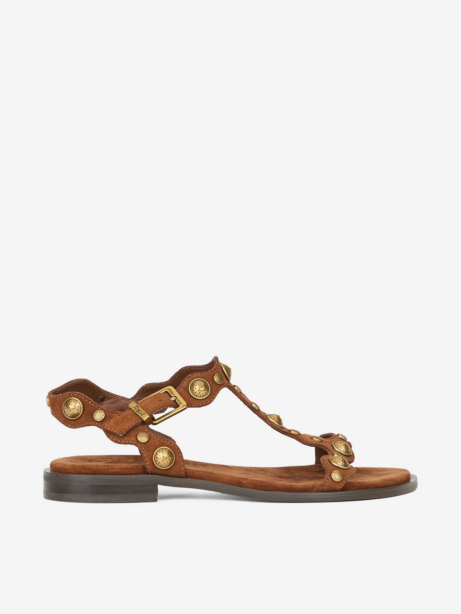 Sandalo in pelle con struttura a T, borchie bombate e bordi ondulati con cinturini.