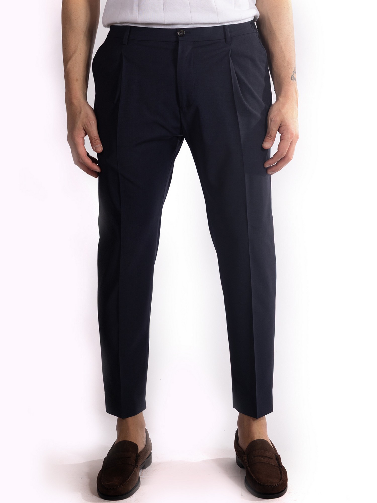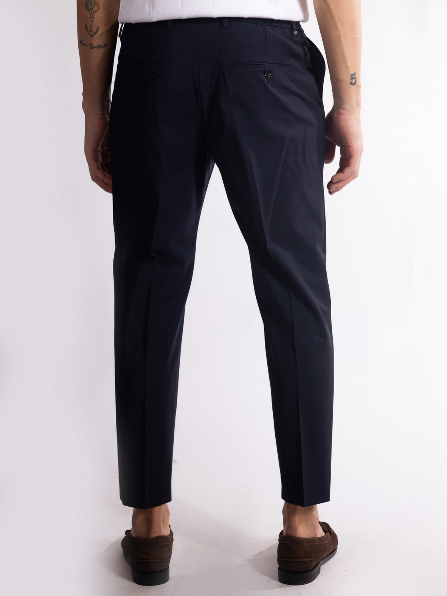 Pantalone con pince anteriore, sul retro tasca a filo con bottone e tasca con patta asimmetrica e stiratura frontale.