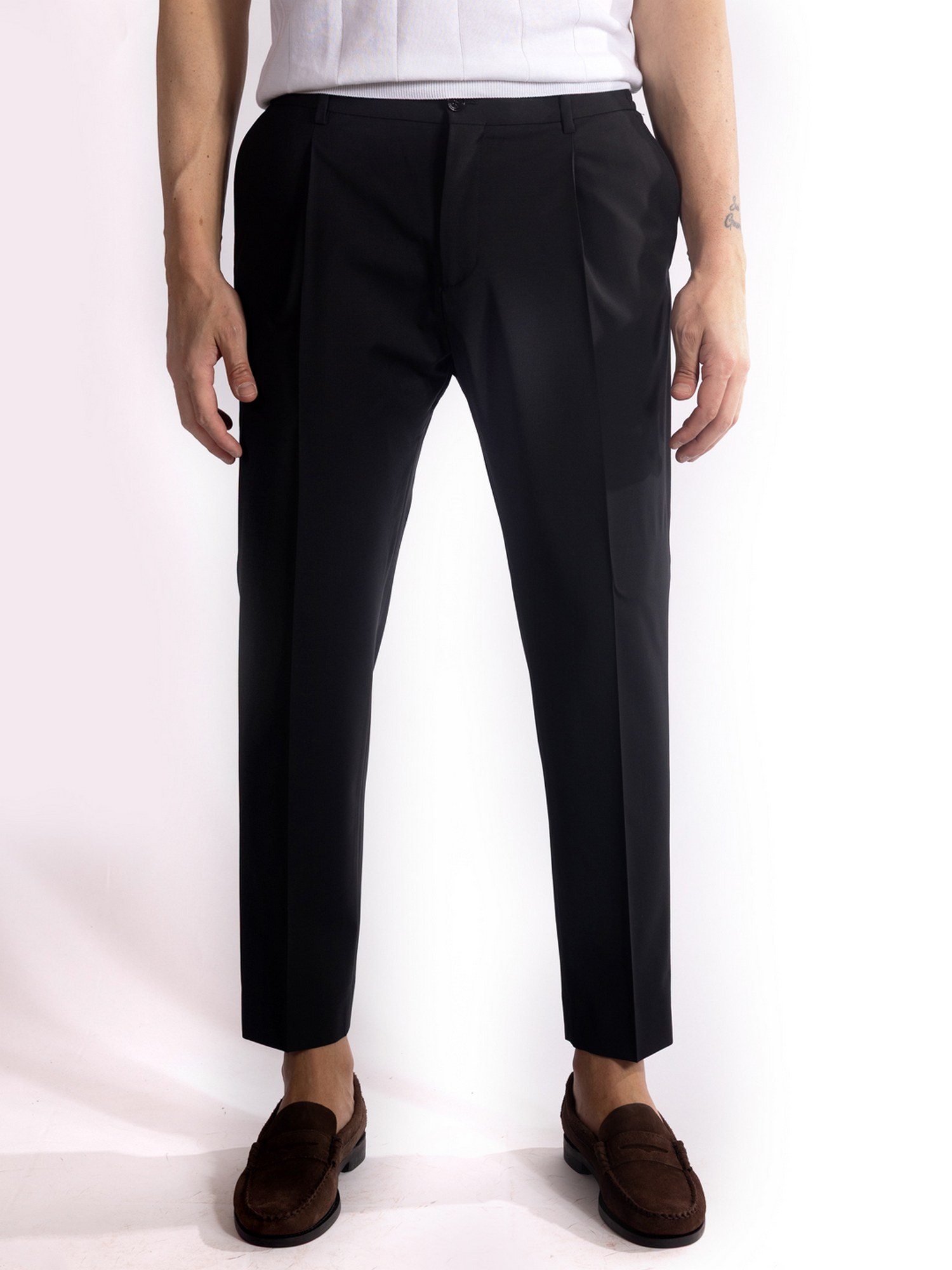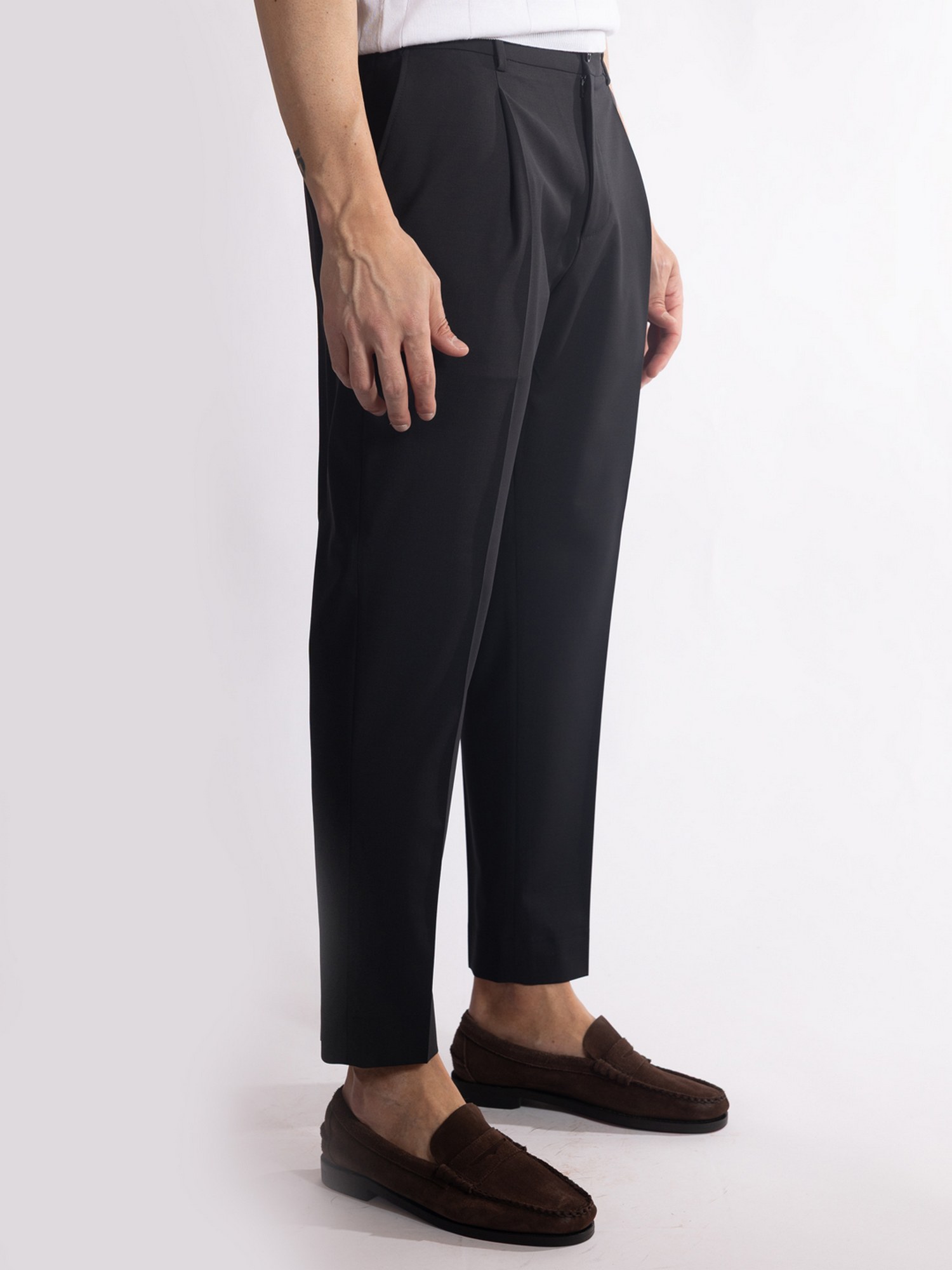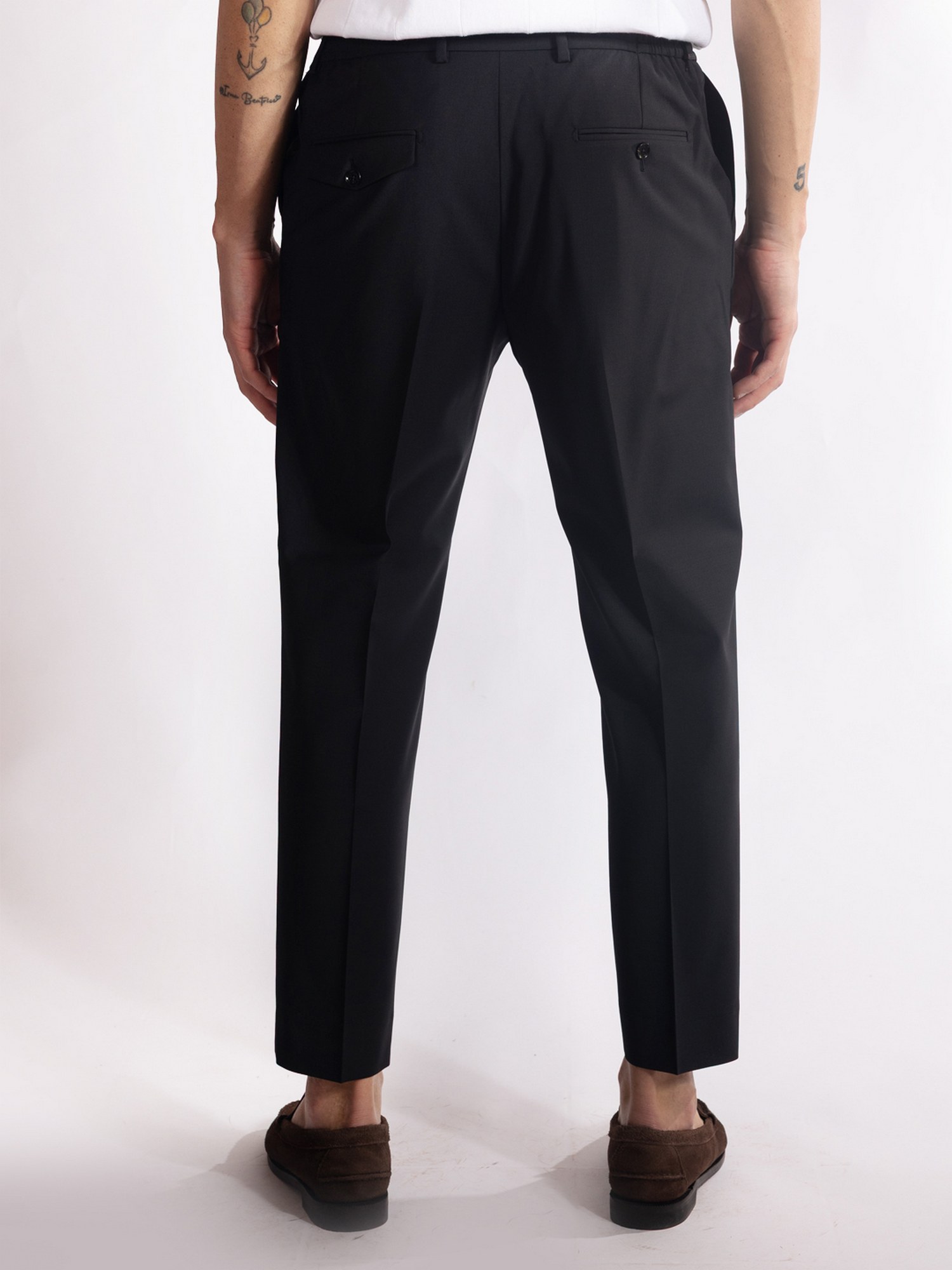 Pantalone con pince anteriore, sul retro tasca a filo con bottone e tasca con patta asimmetrica e stiratura frontale.