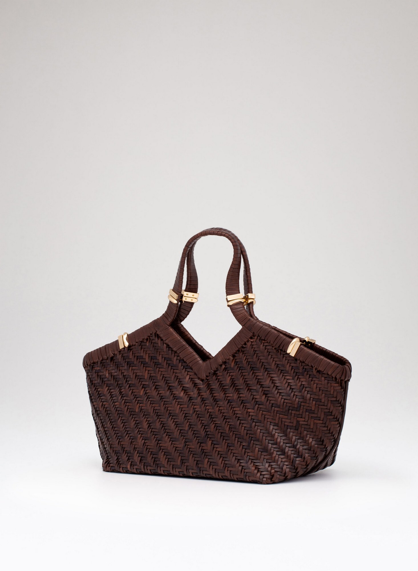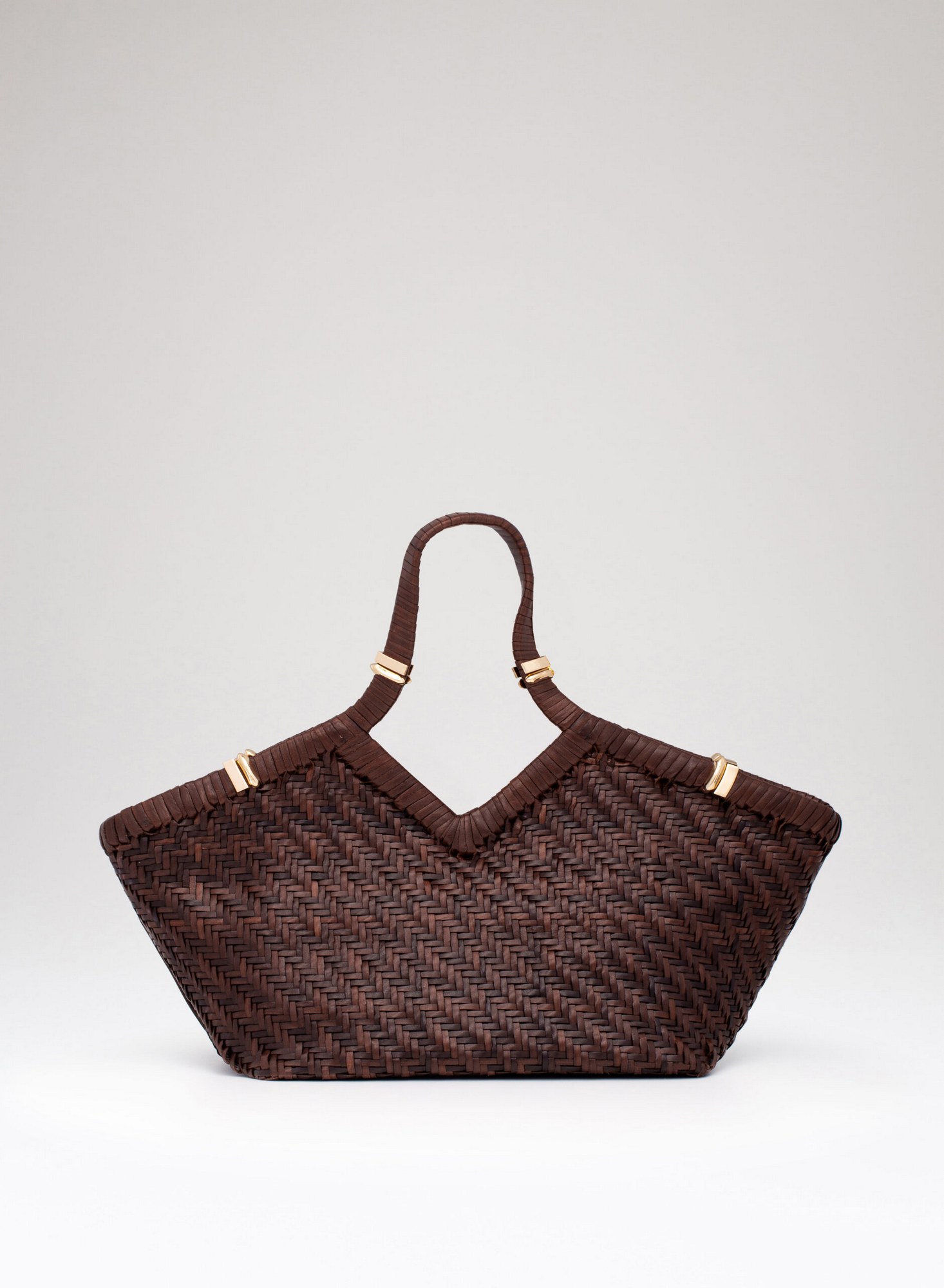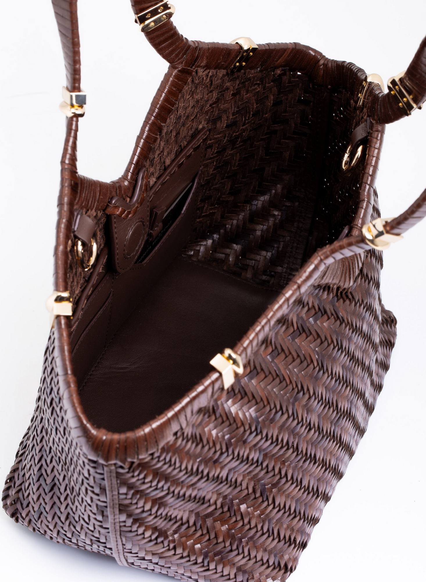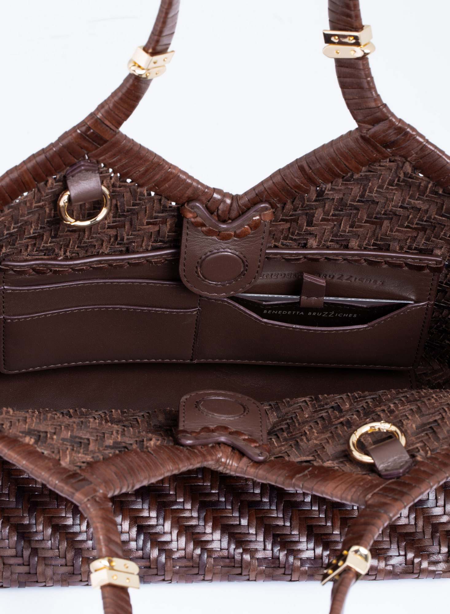 Shopping bag intrecciata a mano su telaio in pelle di bufalo con bordo superiore rifinito con un intreccio raddoppiato, accessori in ottone con taglio gioiello, allinterno dotata di una chiusura a calamita invisibile e di un ampio pannello organizzato con tasche per carte di credito, una tasca con zip, e uno specchio da borsa.