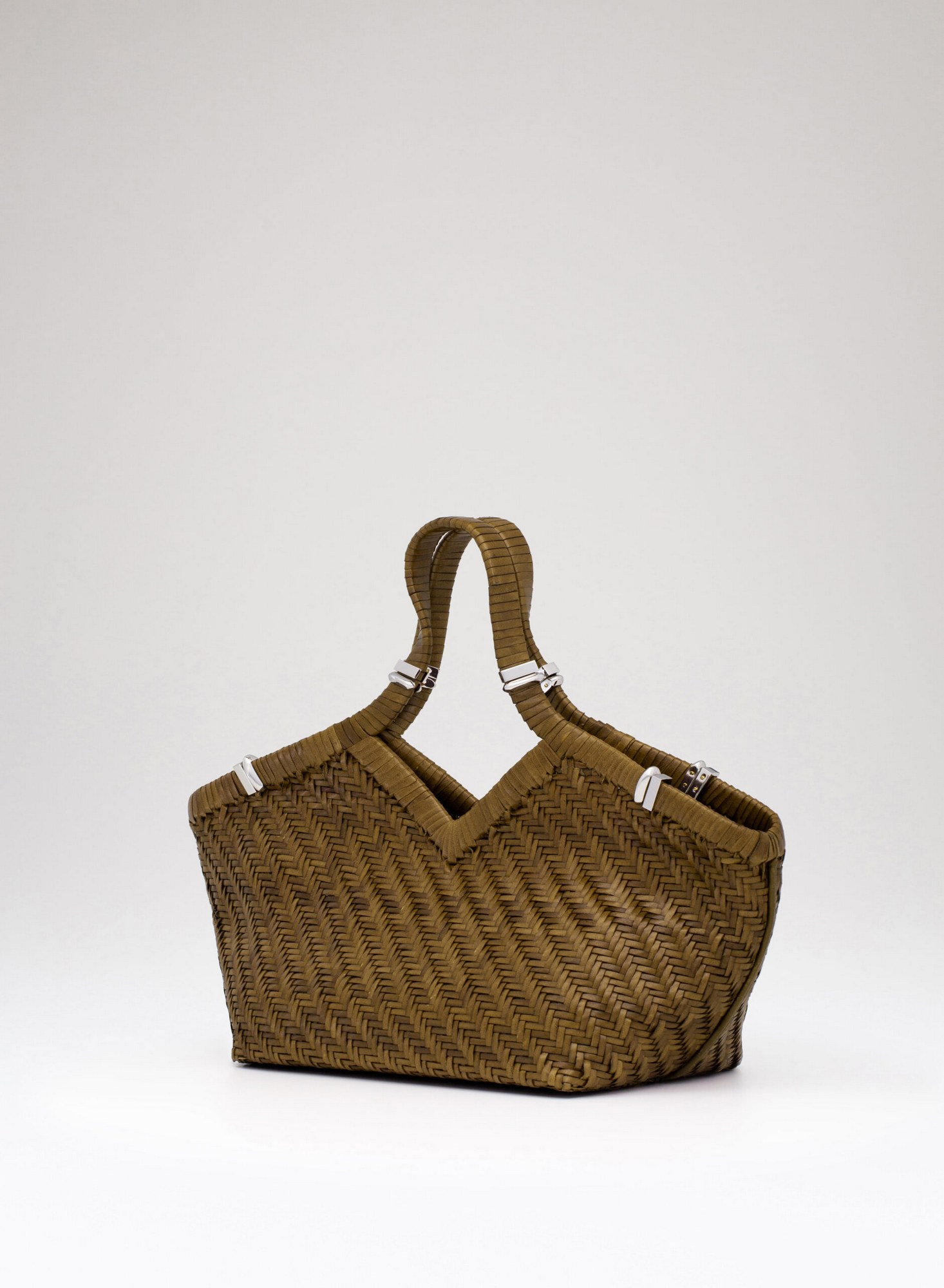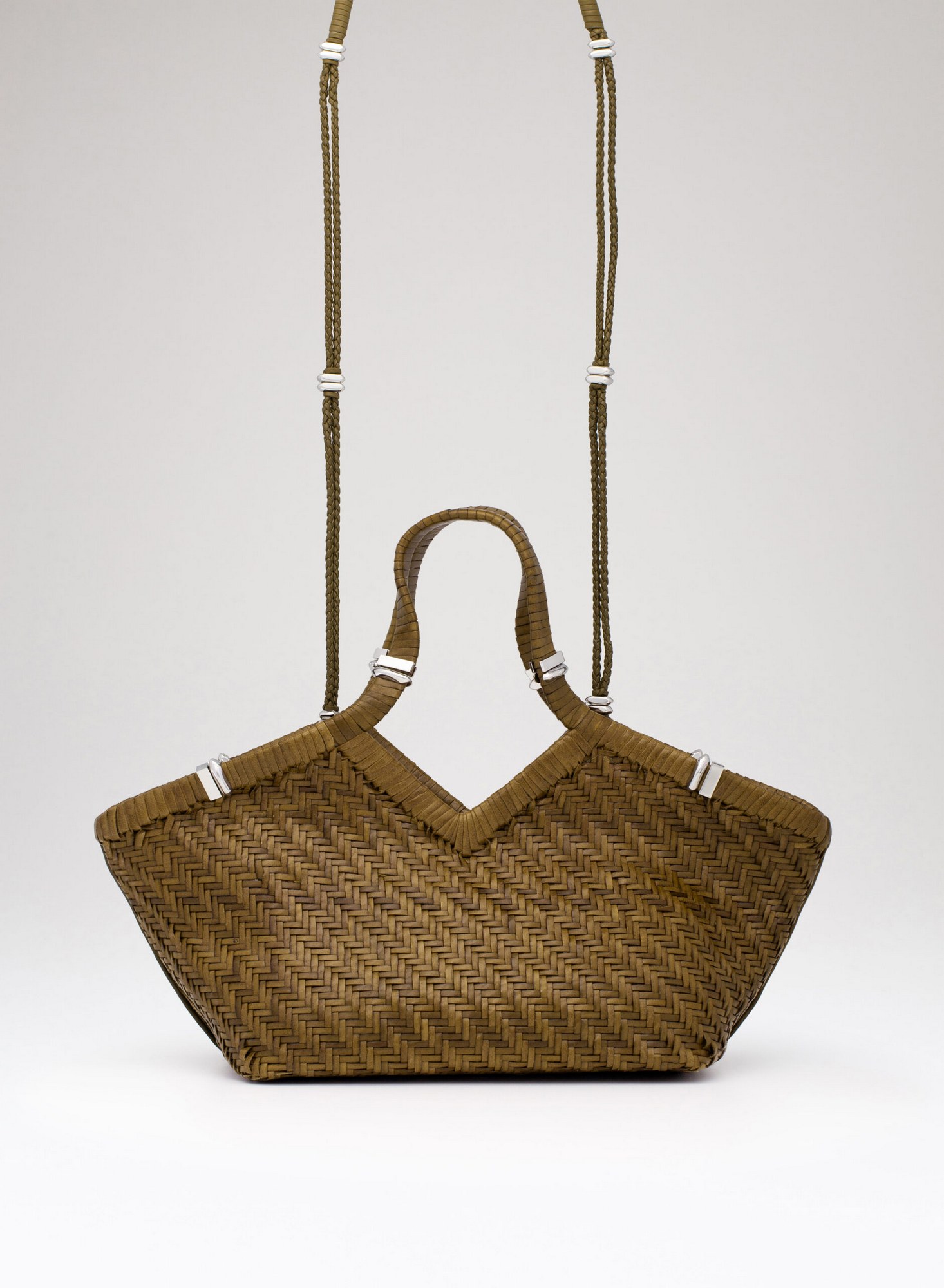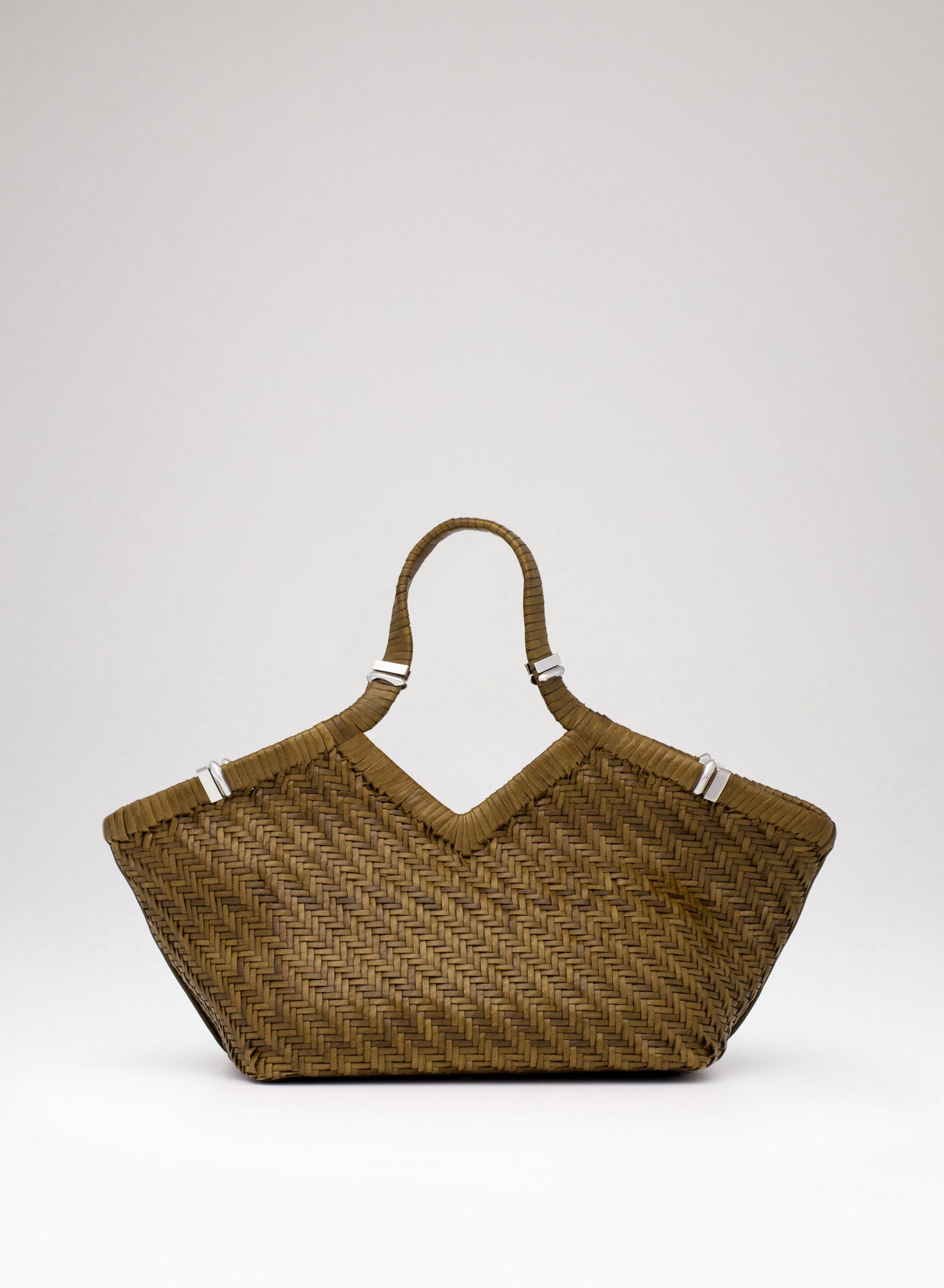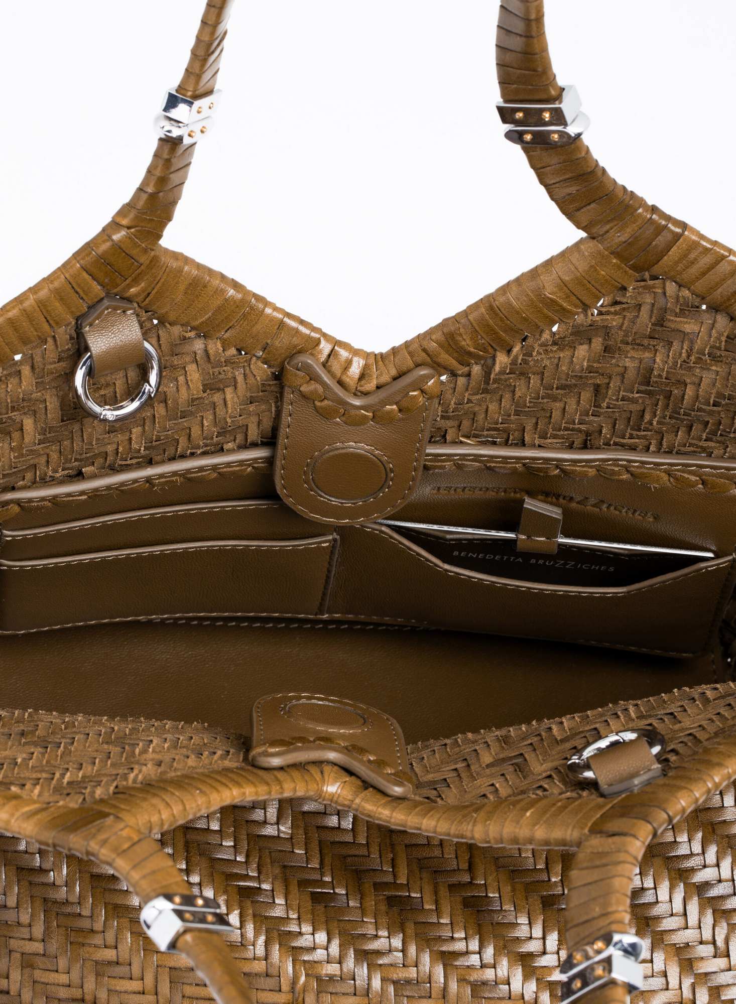 Shopping bag intrecciata a mano su telaio in pelle di bufalo con bordo superiore rifinito con un intreccio raddoppiato, accessori in ottone con taglio gioiello, allinterno dotata di una chiusura a calamita invisibile e di un ampio pannello organizzato con tasche per carte di credito, una tasca con zip, e uno specchio da borsa.