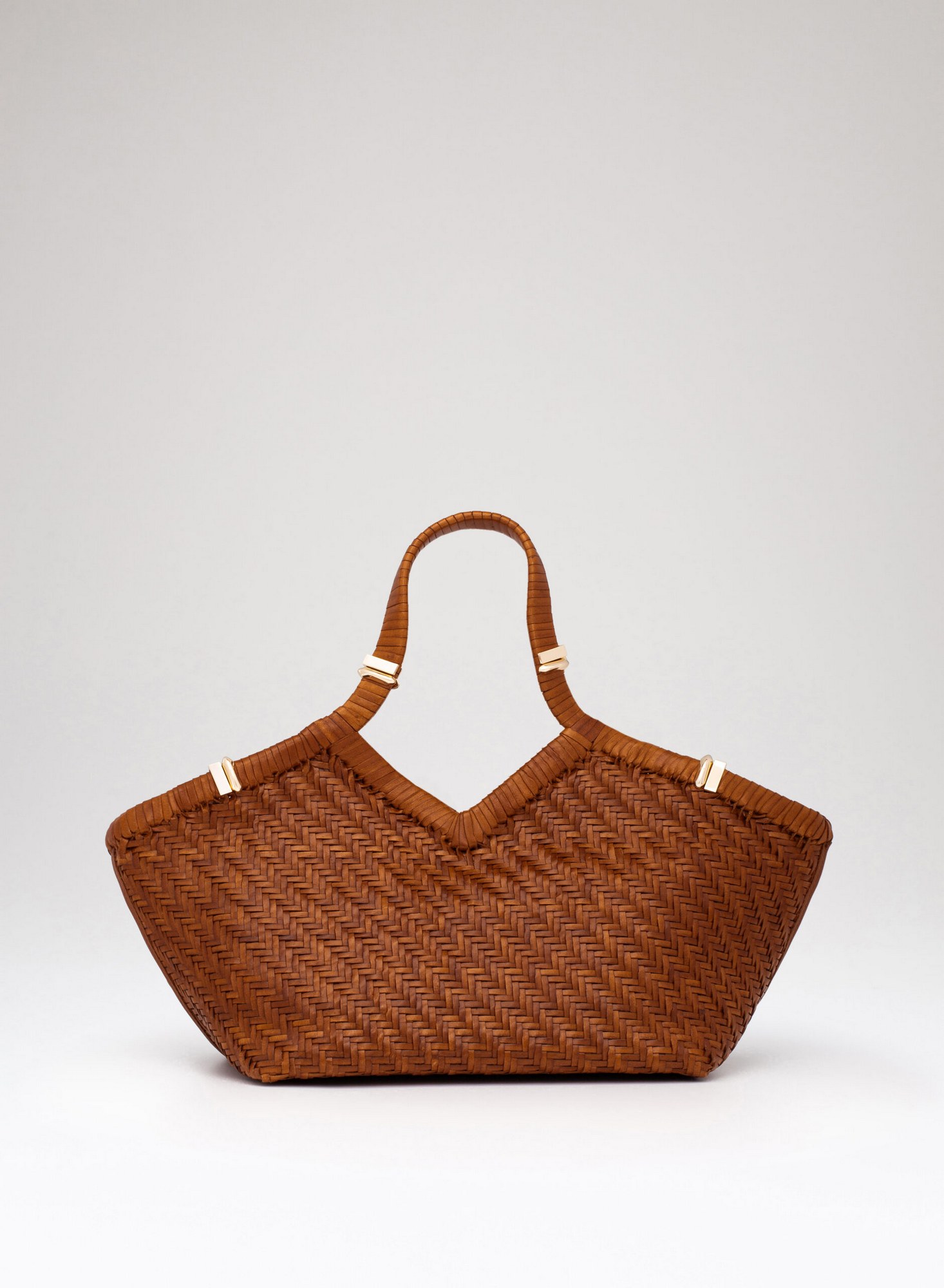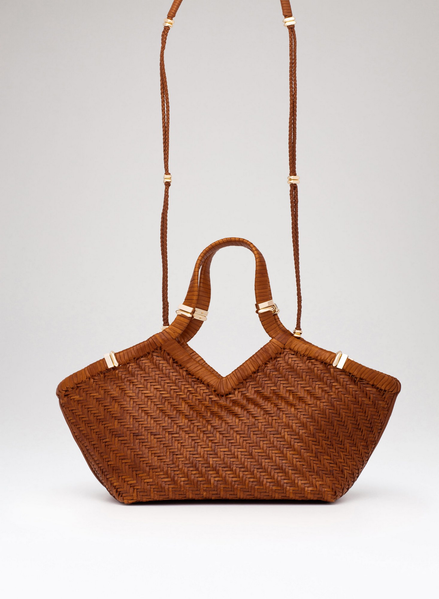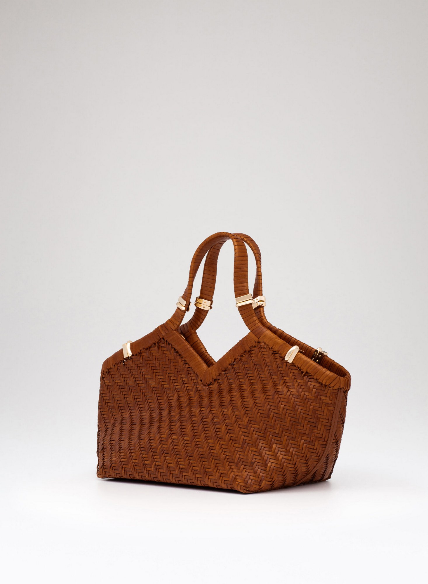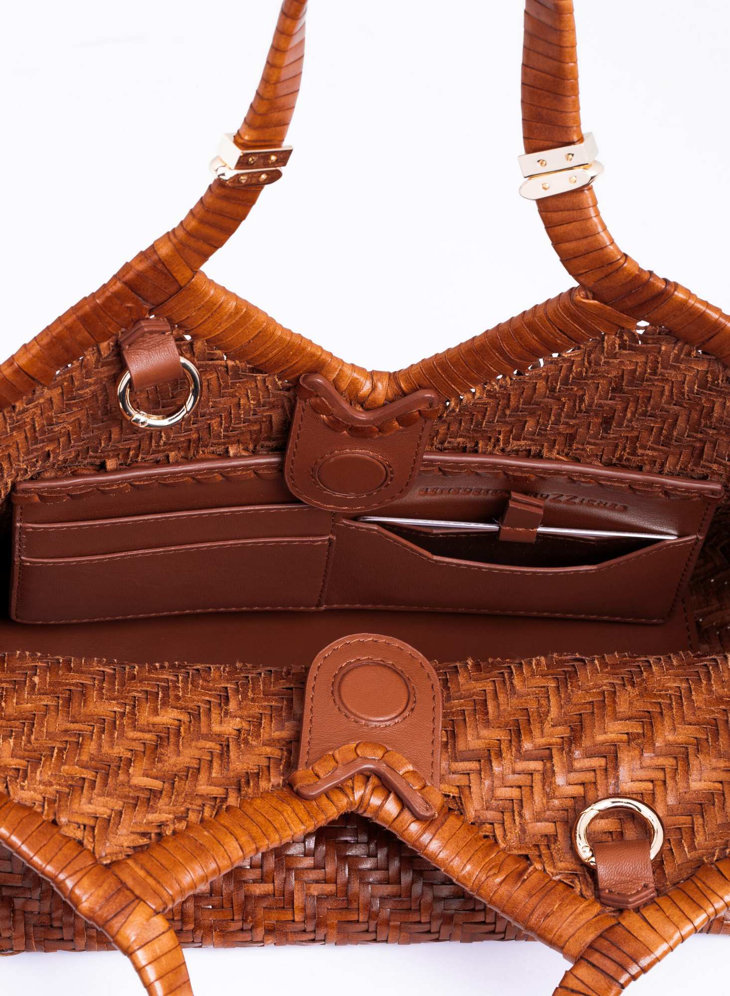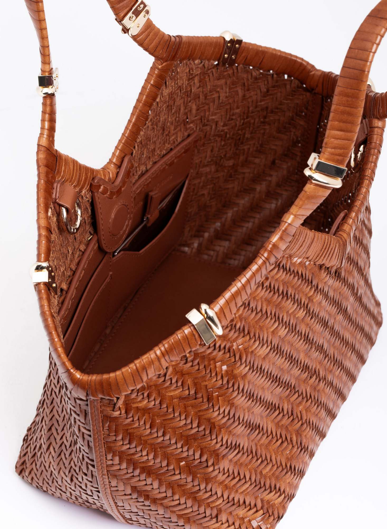 Shopping bag intrecciata a mano su telaio in pelle di bufalo con bordo superiore rifinito con un intreccio raddoppiato, accessori in ottone con taglio gioiello, allinterno dotata di una chiusura a calamita invisibile e di un ampio pannello organizzato con tasche per carte di credito, una tasca con zip, e uno specchio da borsa.