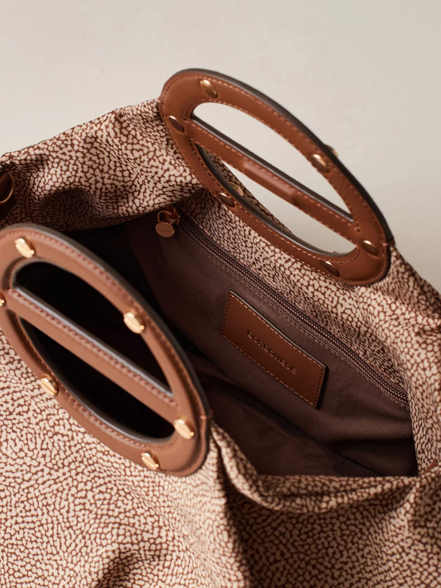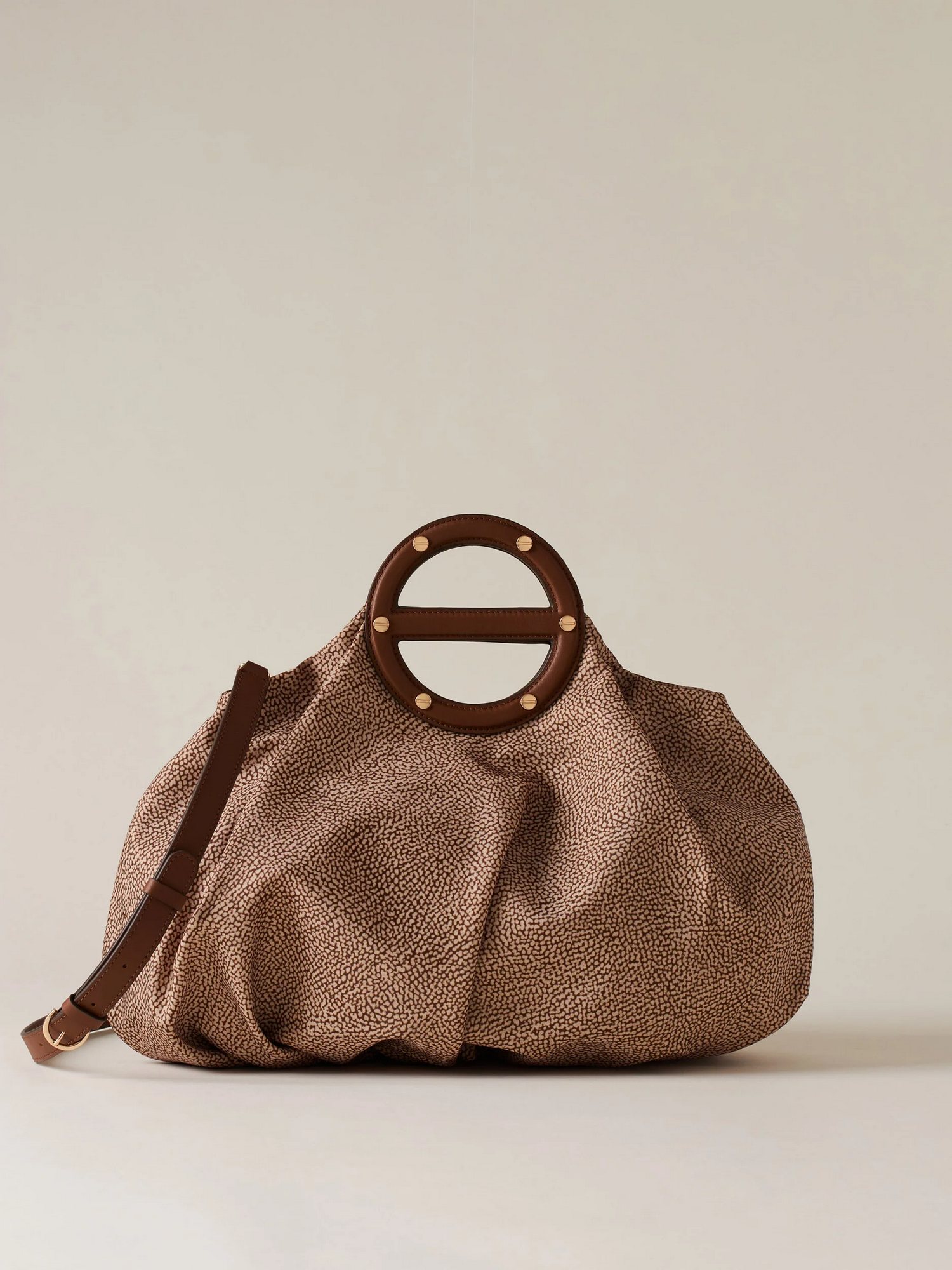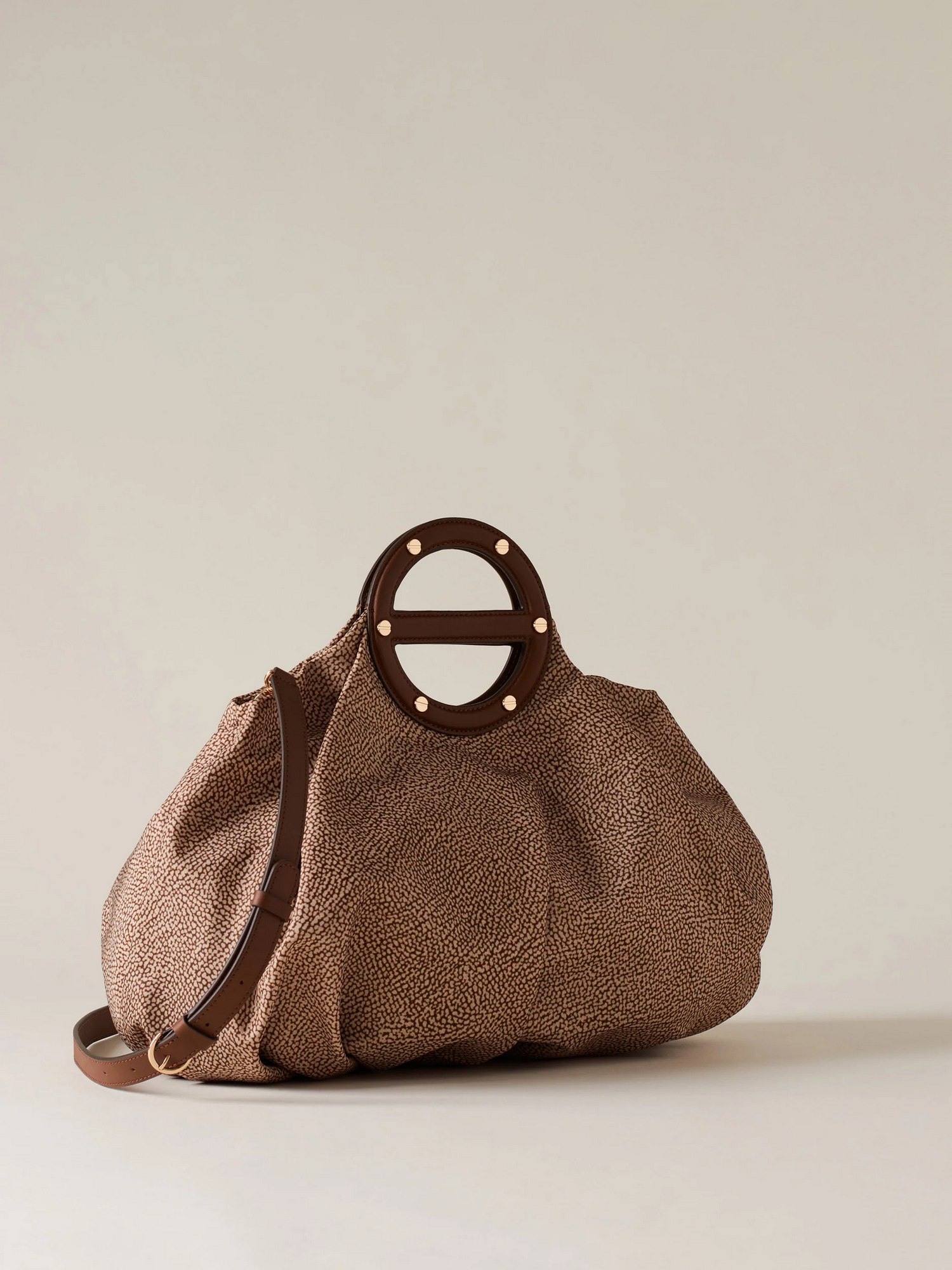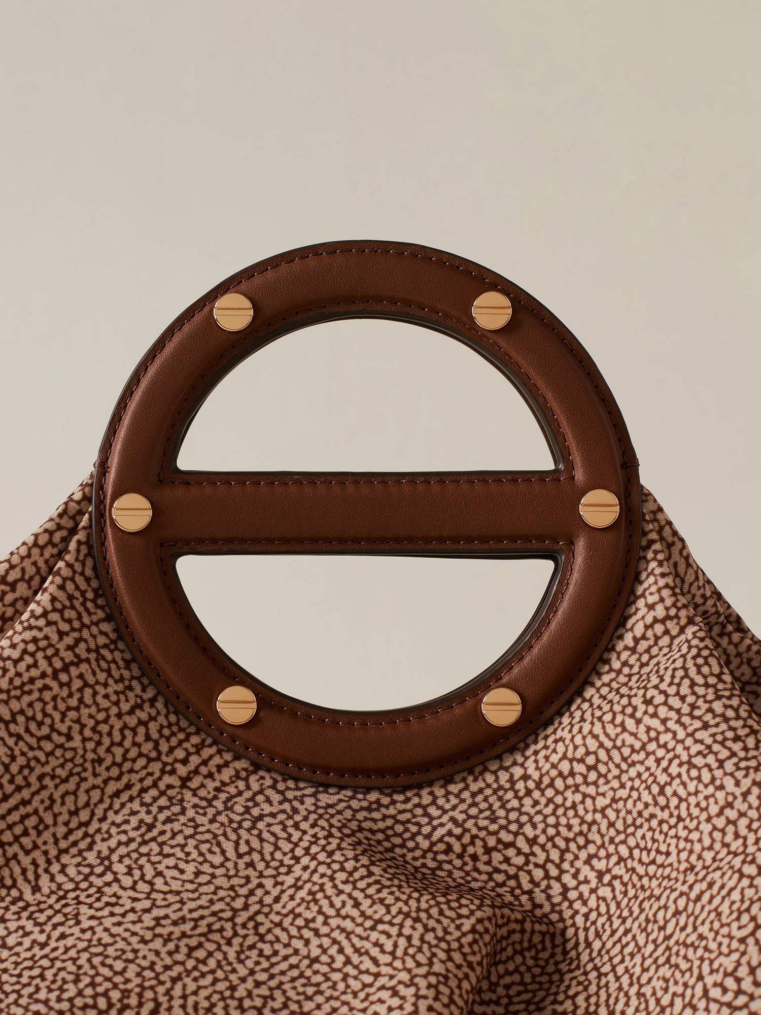 Bauletto in tessuto riciclato stampa con dettagli in vitello, chiusura con calamita invisibile, maniglia in pelle a forma di vite, tracolla in vitello regolabile con fibbia e removibile con moschettoni logati e tasca interna chiusa con zip e tirazip vite.