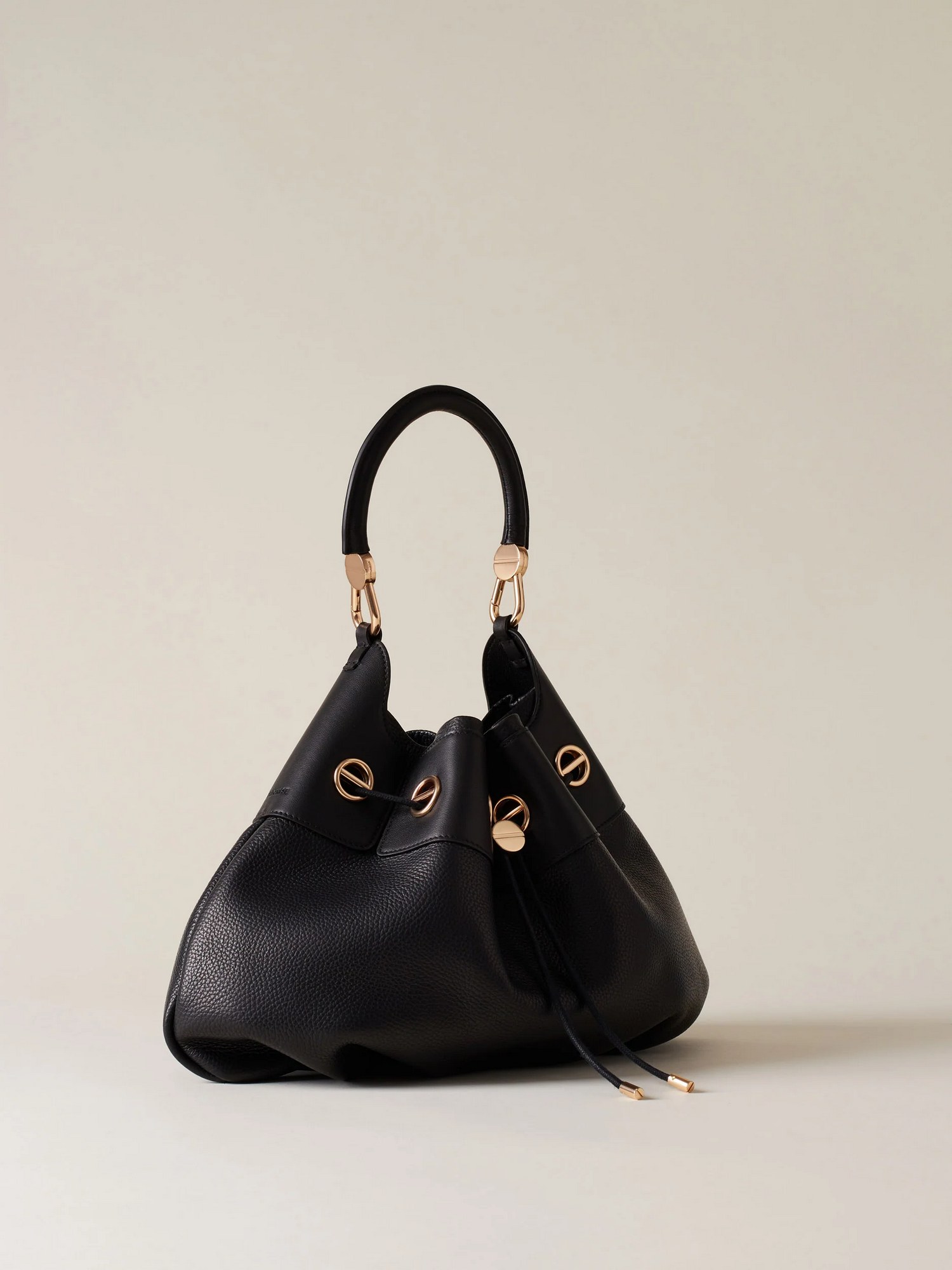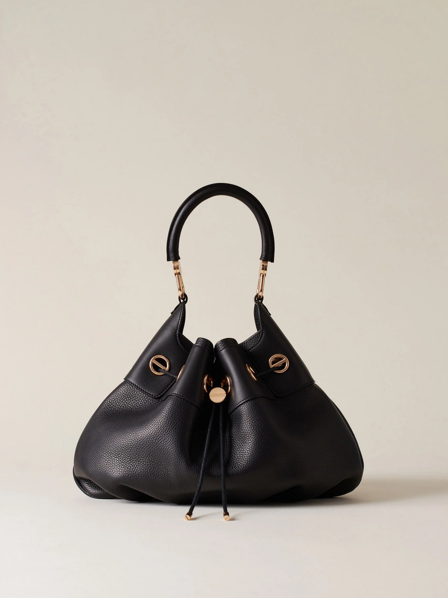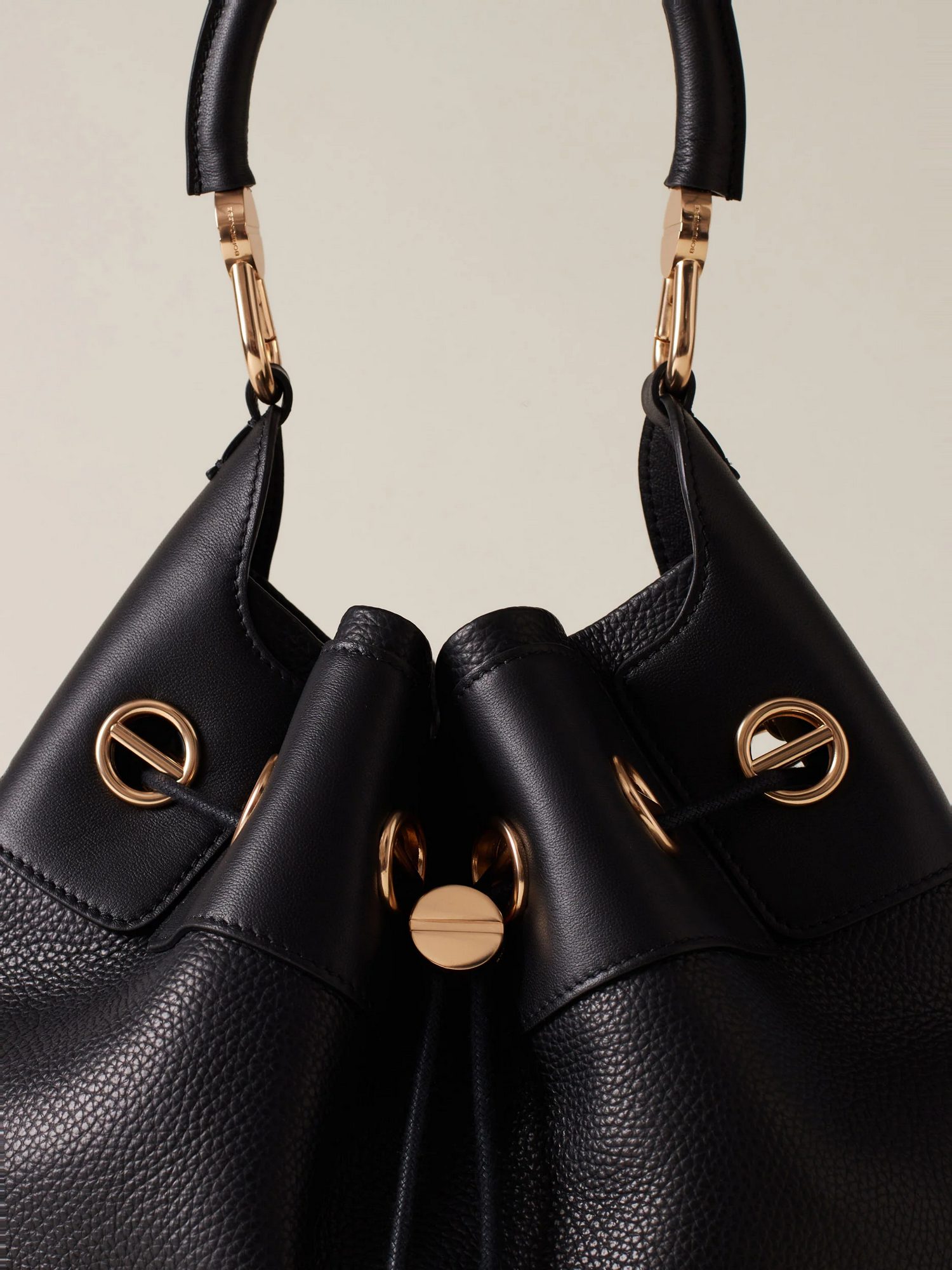 Borsa hobo in vitello stampato bottalato con chiusura a coulisse, manico tubolare con moschettoni logati, pouch interno chiuso con zip metallo e tirazip vite removibile con moschettone.