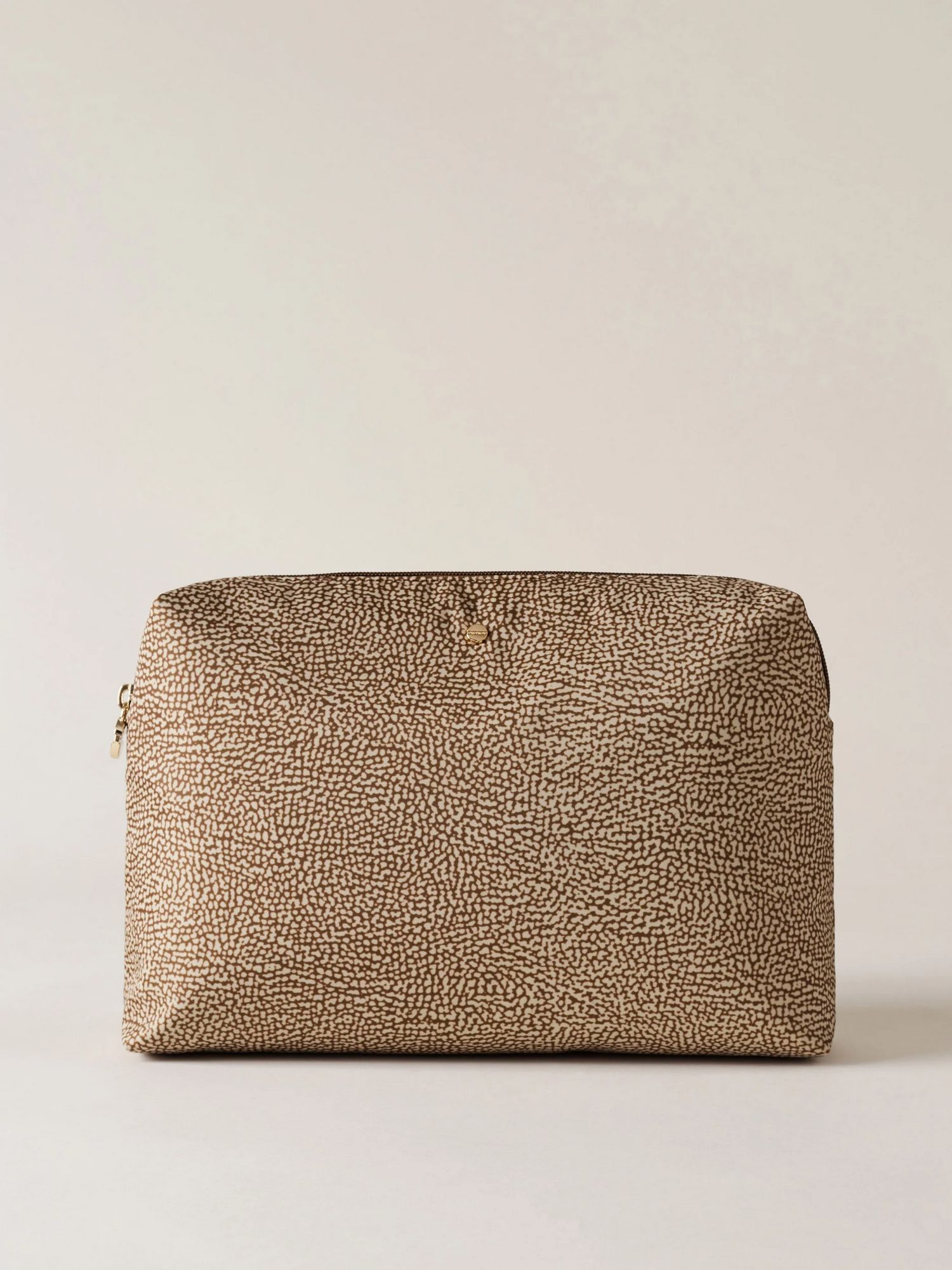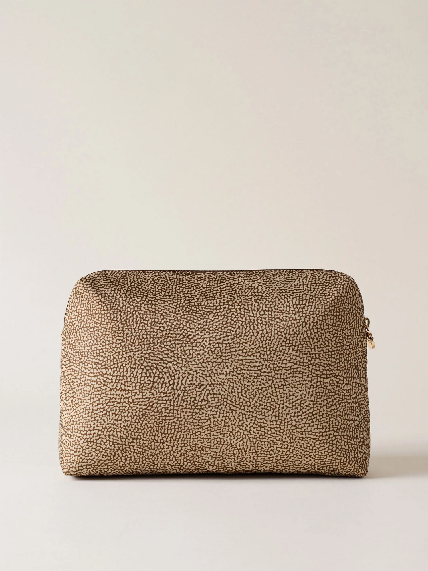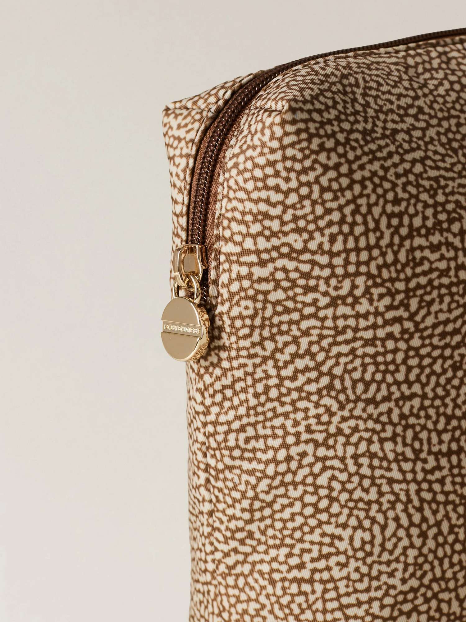 Beauty case in tessuto riciclato con dettagli di pelle, chiusura regolata da zip, tirazip a placchetta logata e metallerie oro.