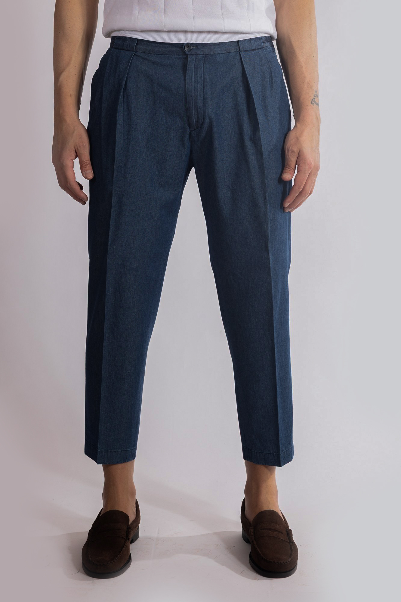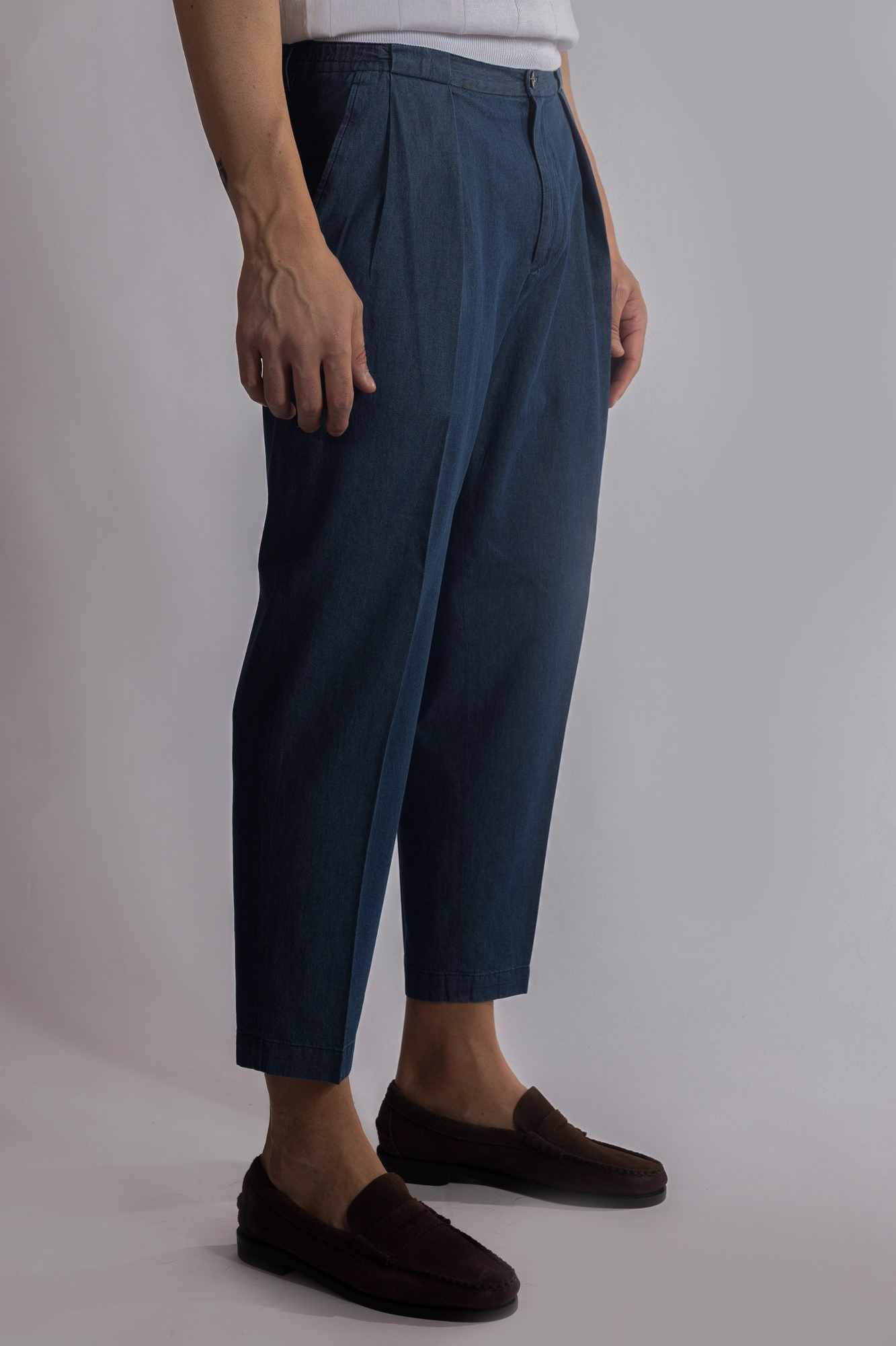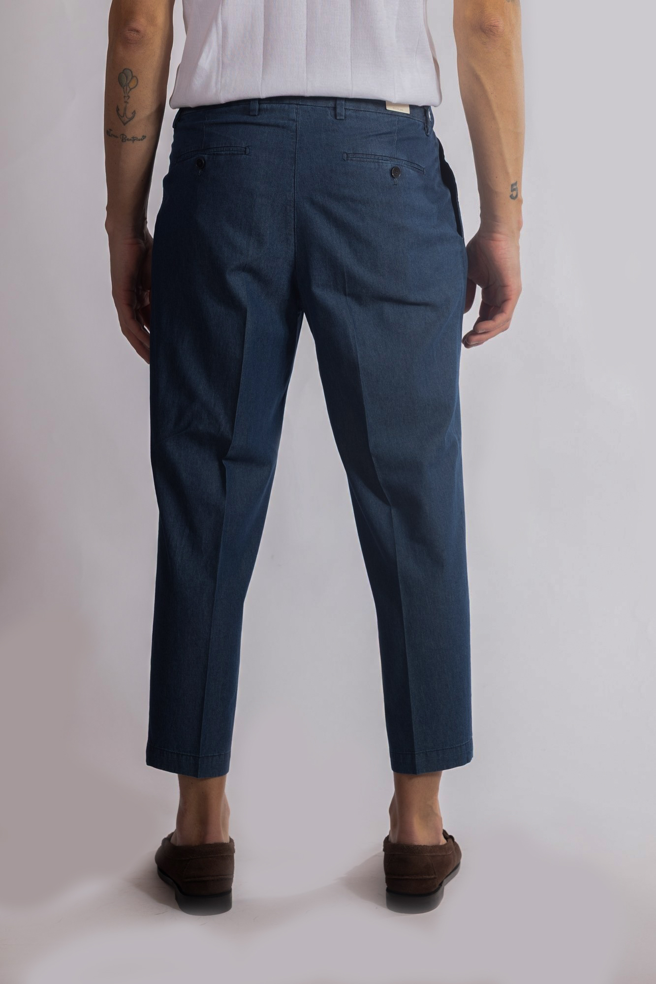 Pantalone in una tela di cotone leggermente fiammato con pince anteriore, taglio "cropped" alla caviglia e stiratura centrale.