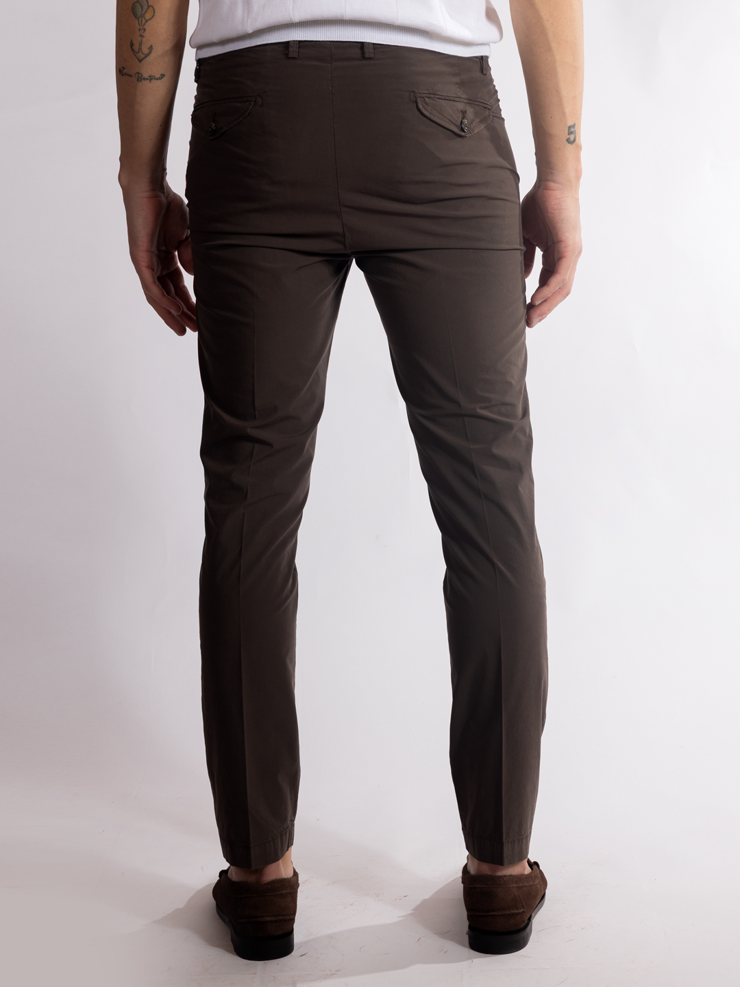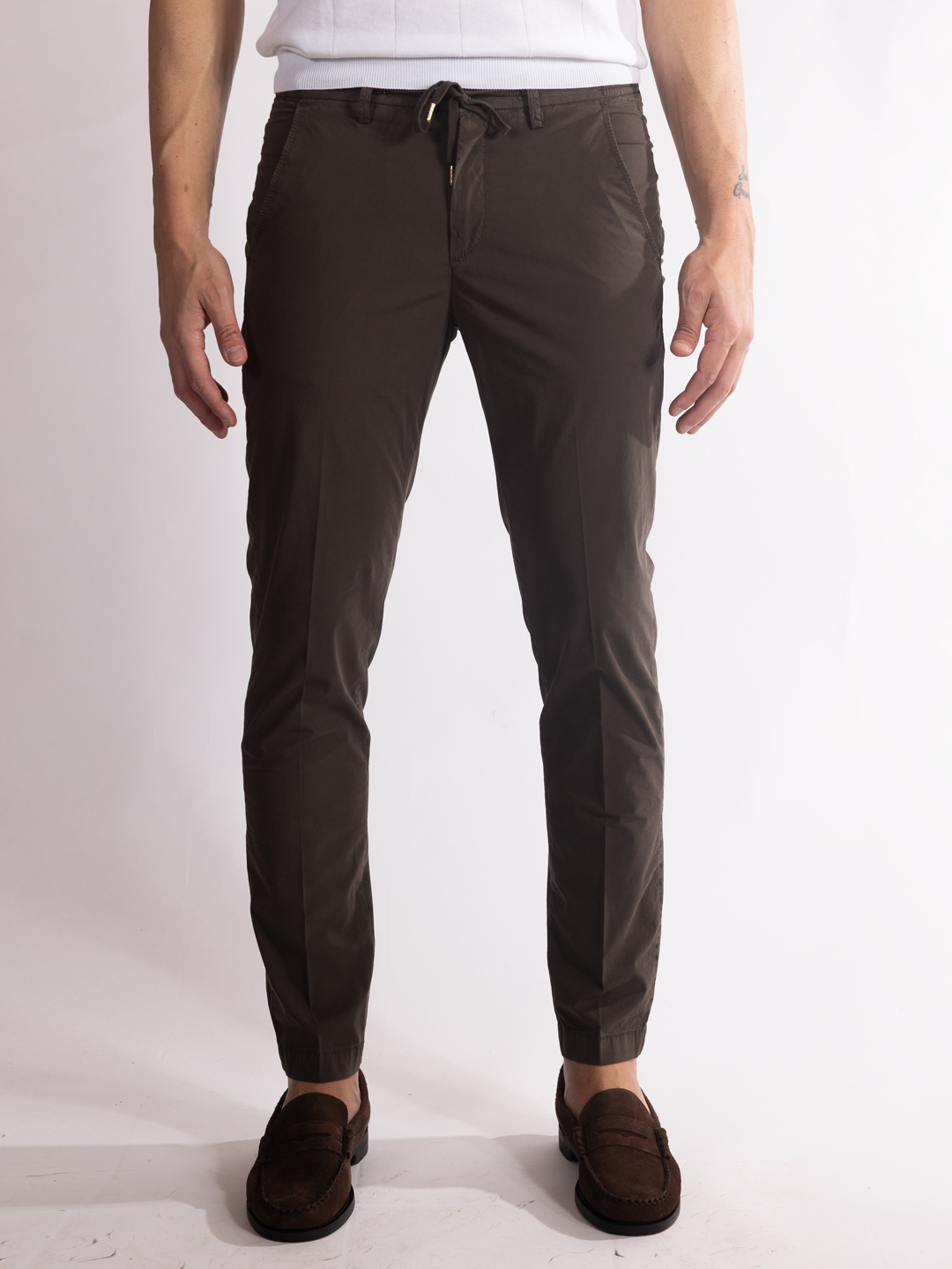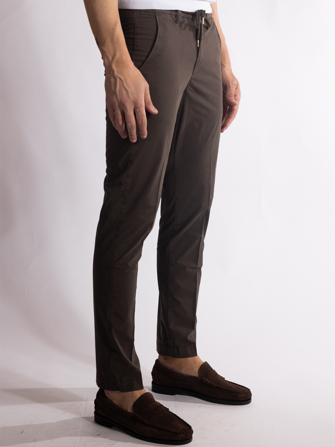 Pantaloni slim fit con tasche laterali a filo, tasche posteriori con patta e bottone e laccetti centrali.