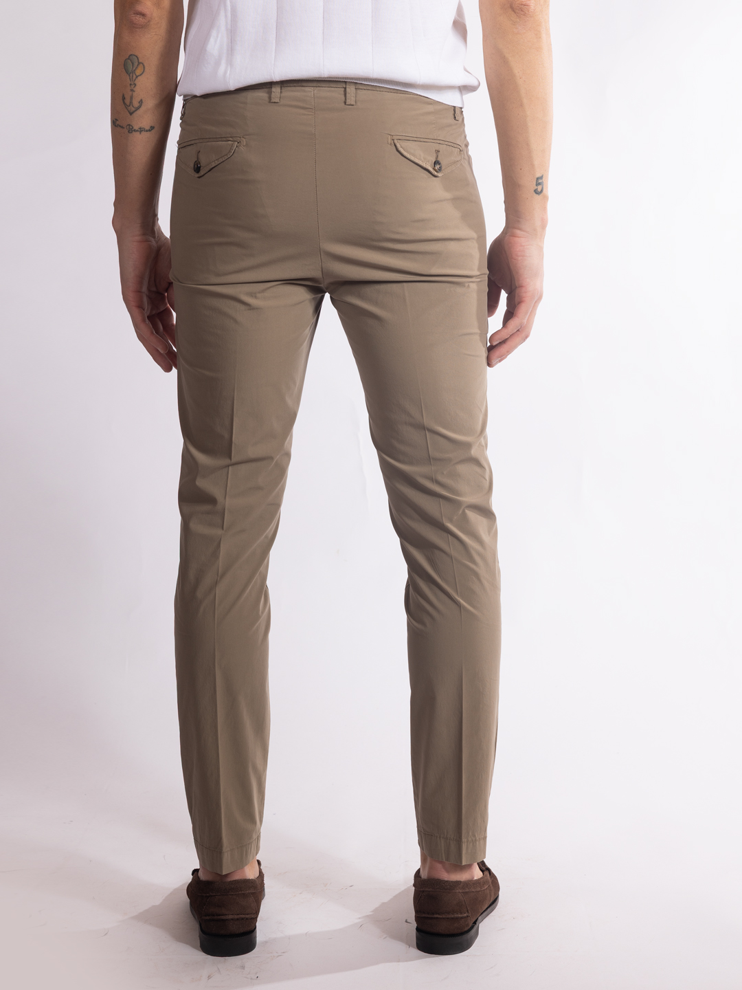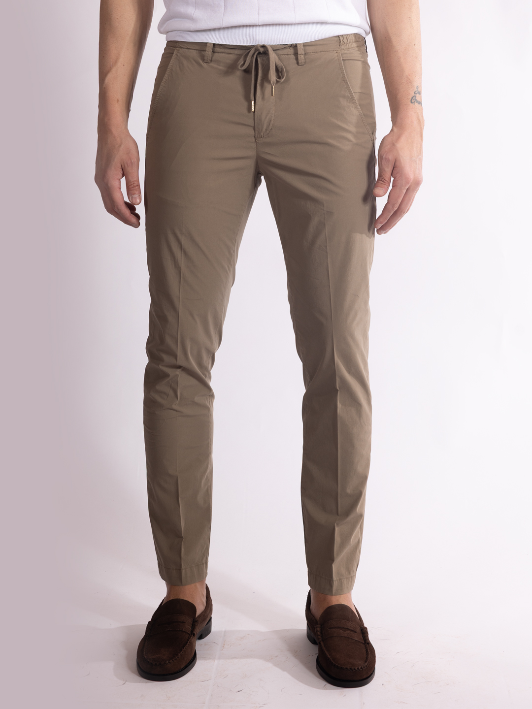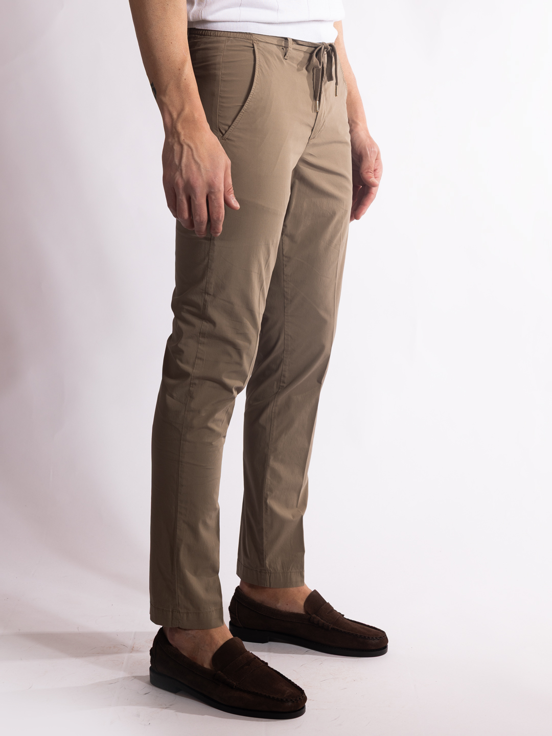Pantaloni slim fit con tasche laterali a filo, tasche posteriori con patta e bottone e laccetti centrali.