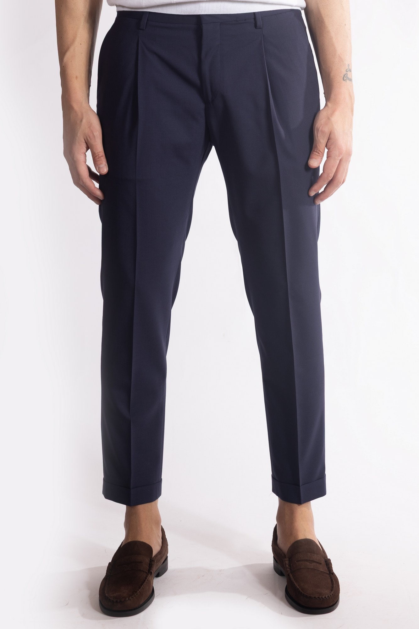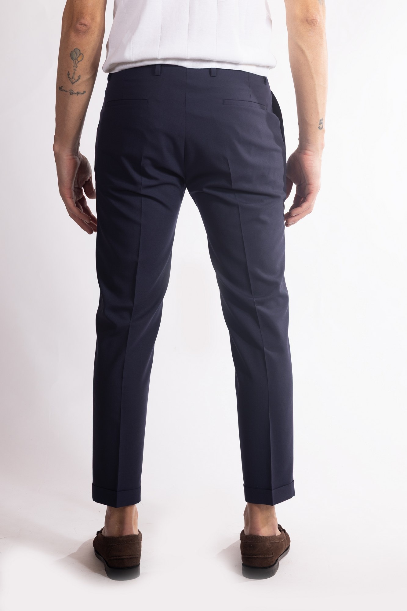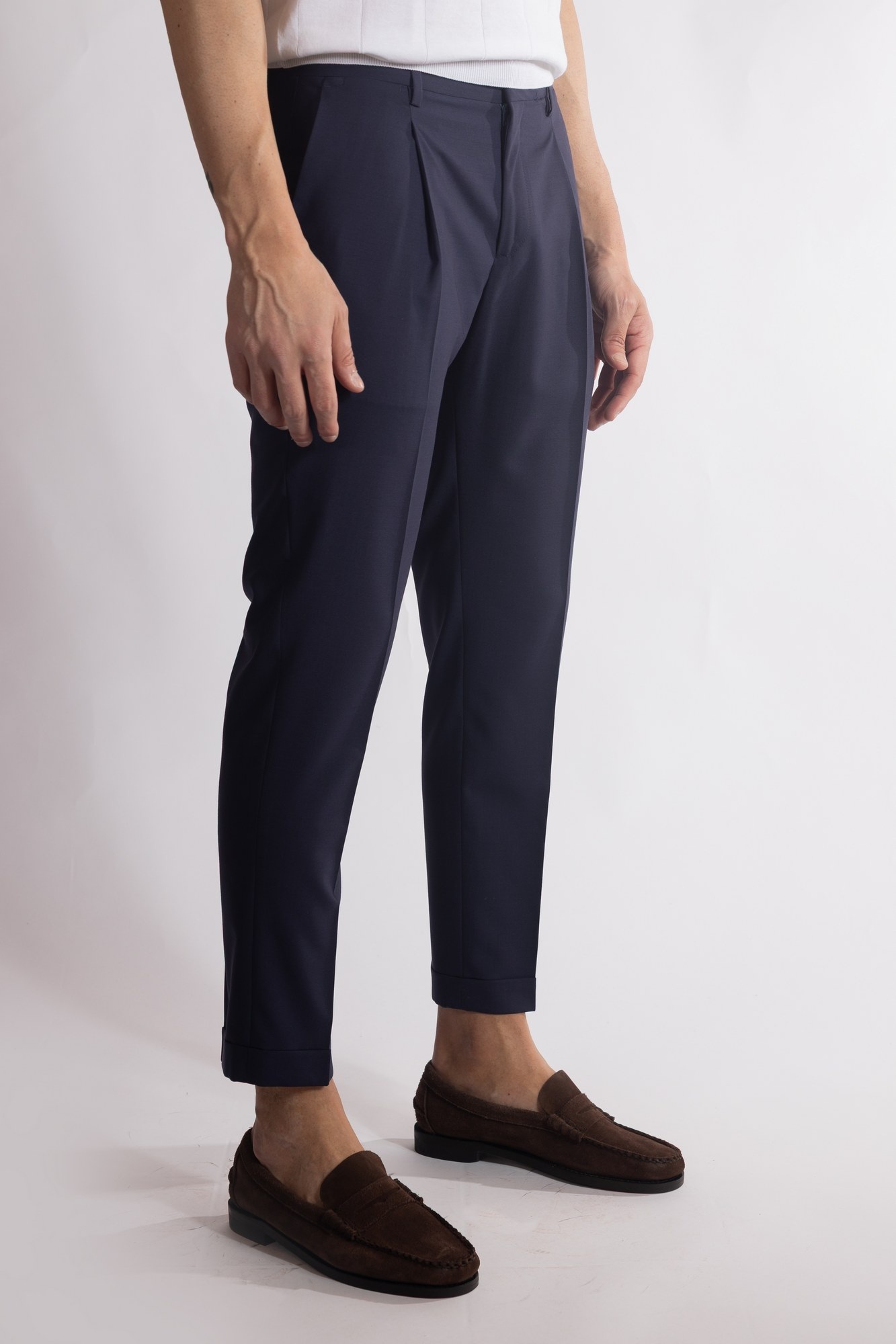 Pantalone con pinces, gamba affusolata e fondo con risvolto.