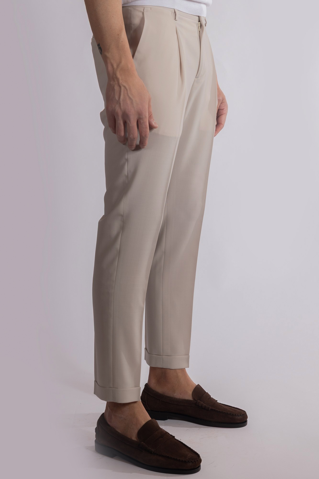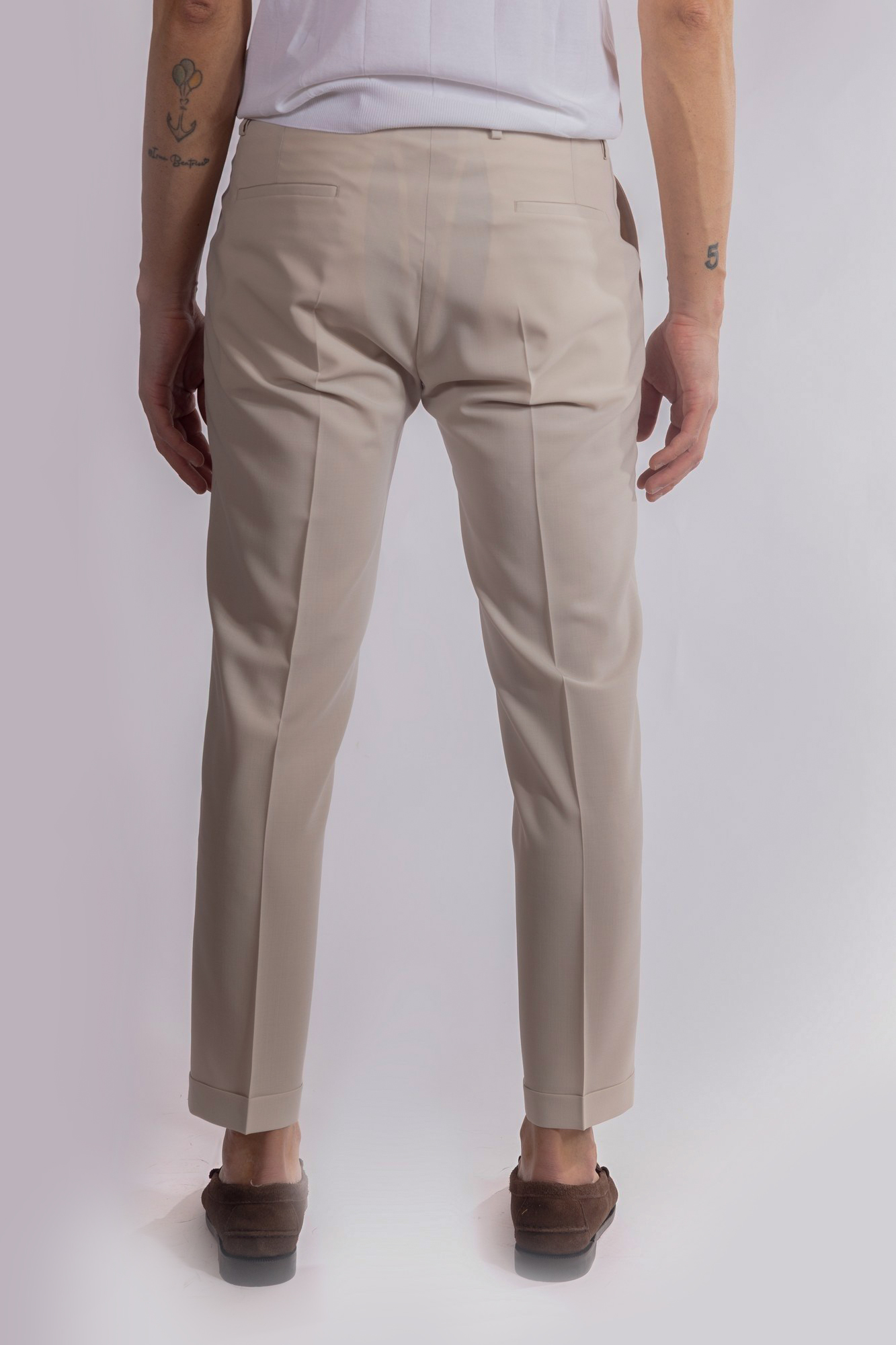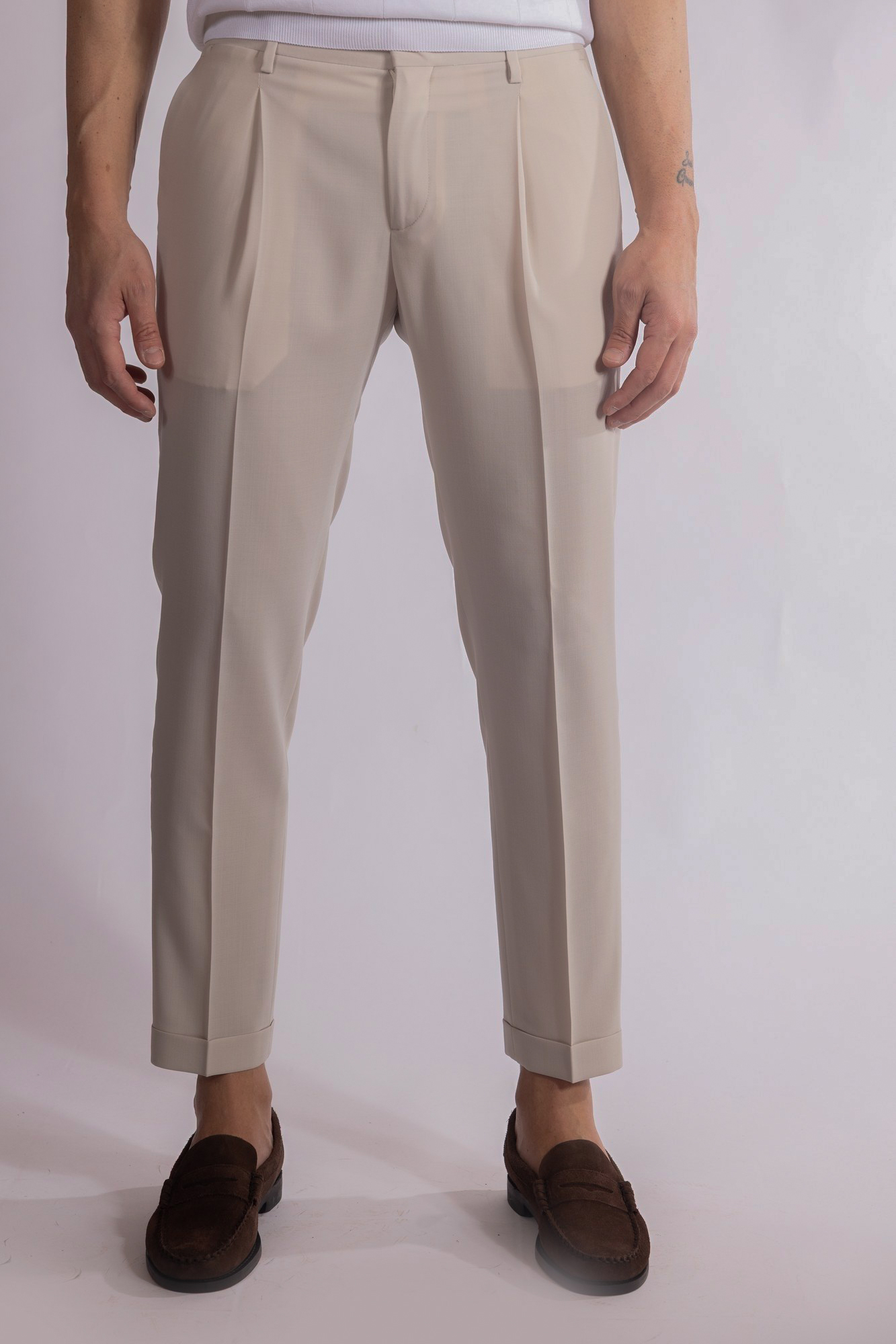 Pantalone con pinces, gamba affusolata e fondo con risvolto.