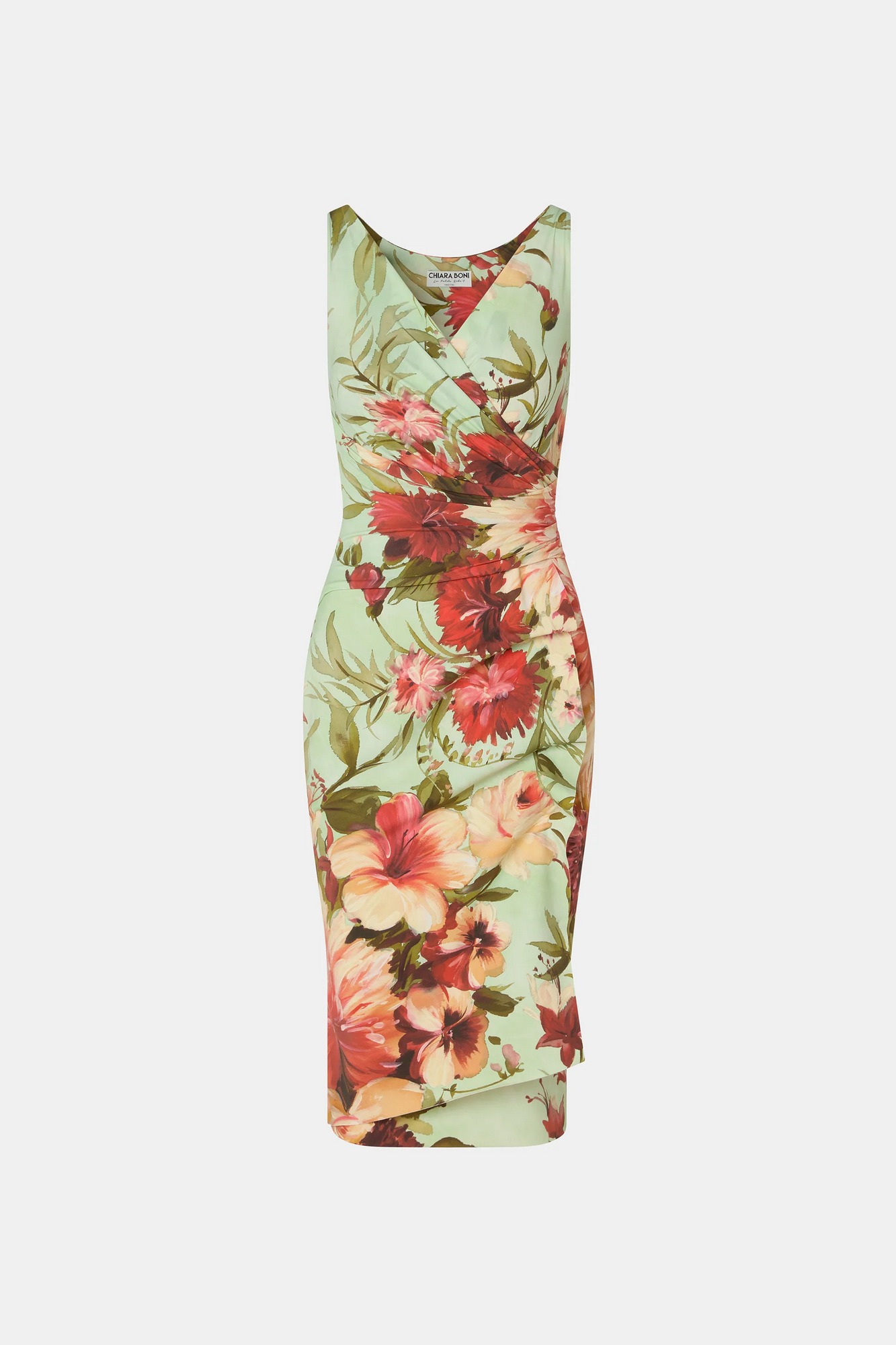 Abito stampato con scollo a V e drappeggio sulla gonna.