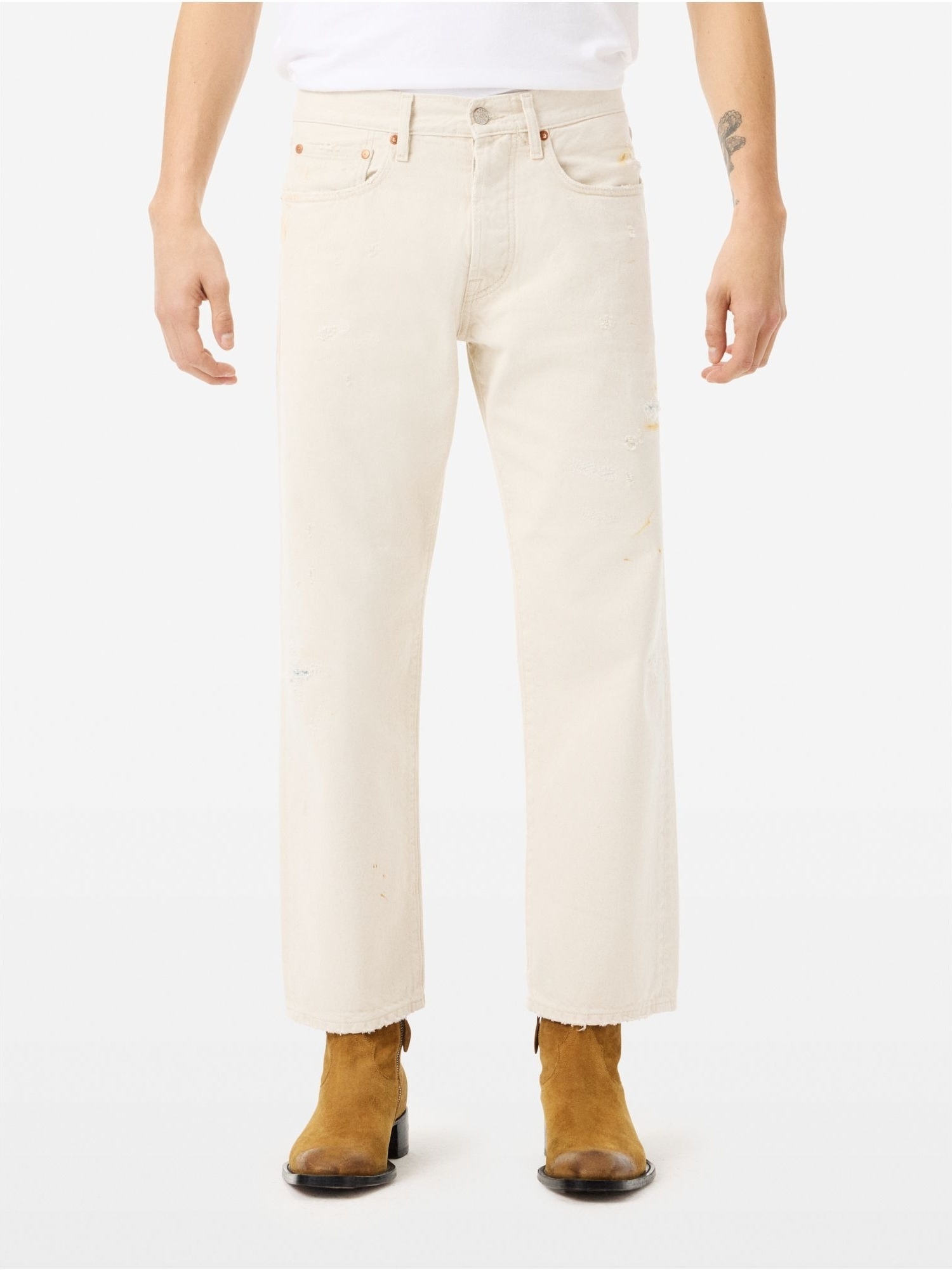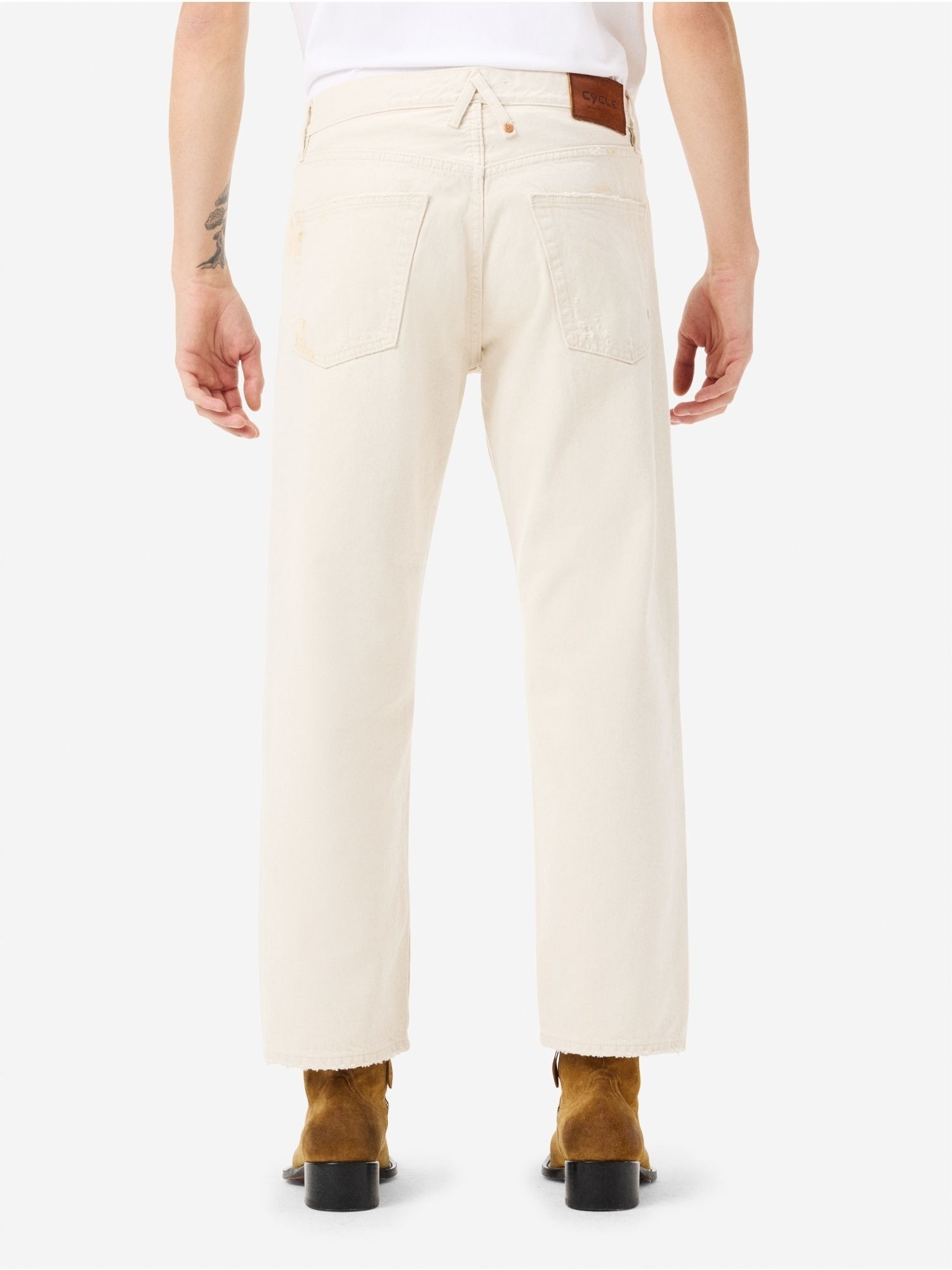 Jeans straight fit con vita dritta scesa, gamba dritta a sigaretta con effetto used, rotture rammendate, passanti incrociati e piccolo dettaglio placcato su una delle due tasche applicate.