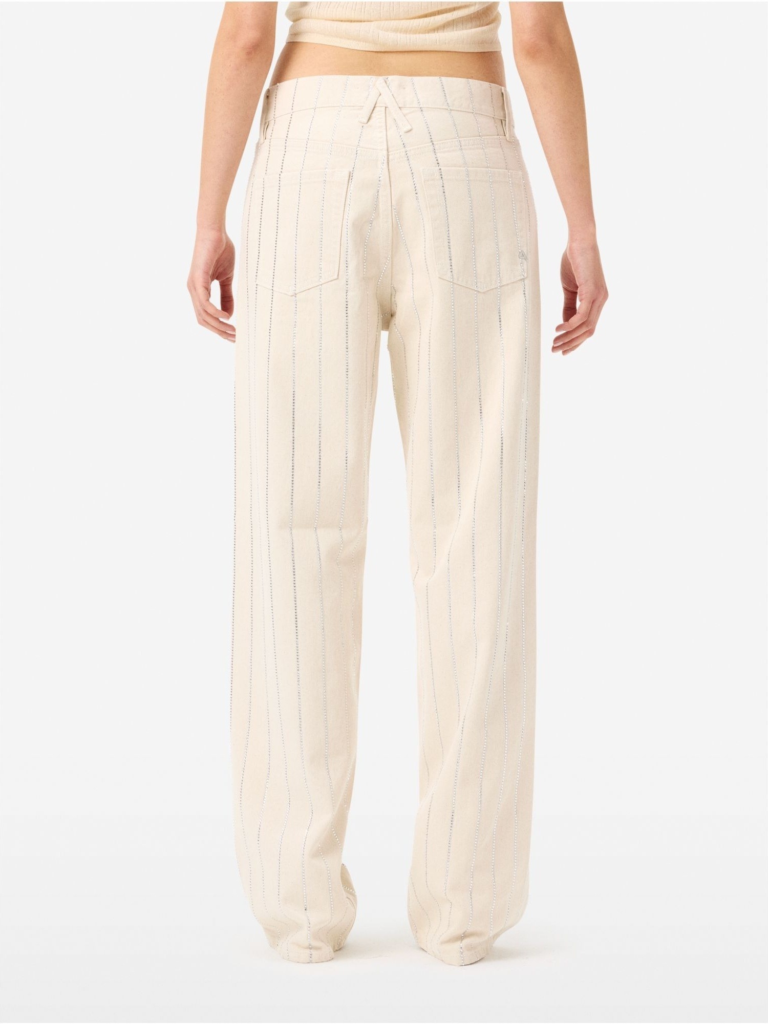Jeans straight fit con vita bassa, gamba morbida impreziosita da strass che ricreano un motivo gessato, passanti incrociati e piccolo dettaglio placcato su una delle due tasche applicate.