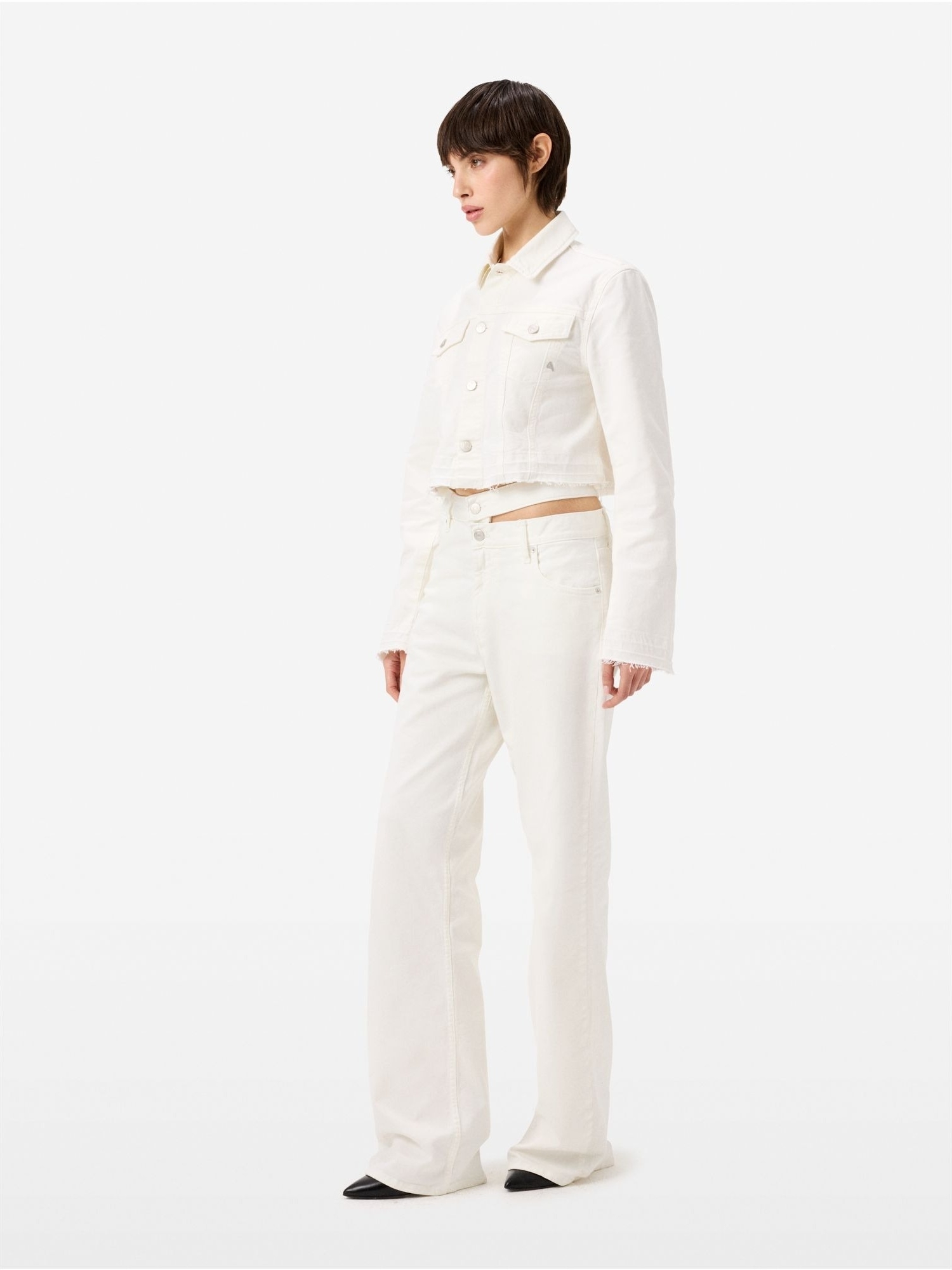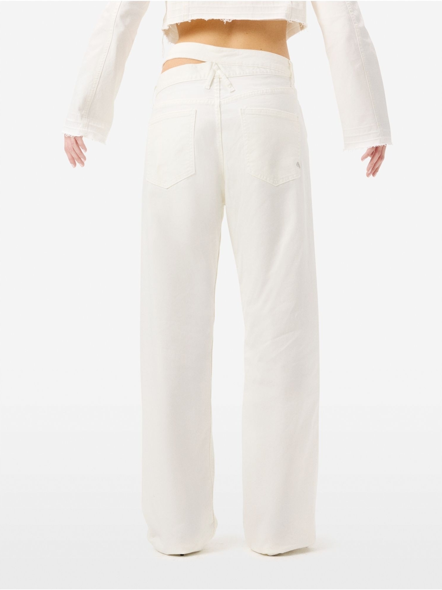 Jeans straight fit con vita alta, gamba dritta extralunga, doppia cintura in vita che crea cut-out su un fianco, passanti sul retro e dettaglio placcato sulla tasca posteriore destra.