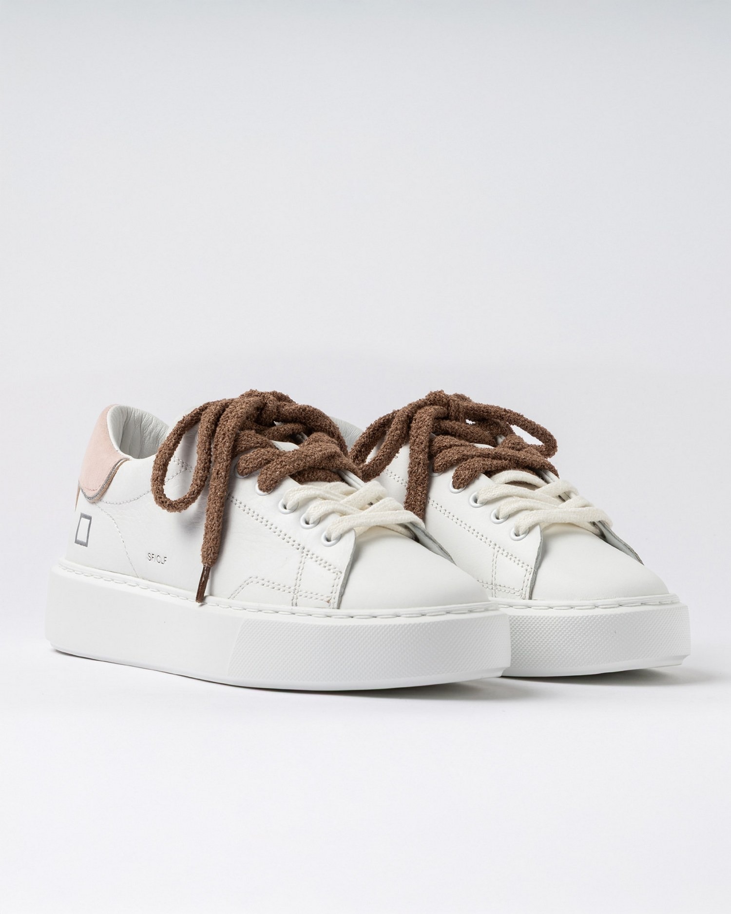 Sneakers in pelle con scritta D.A.T.E. impressa sulla linguetta in pelle, lacci in cotone e spugna di cotone in due texture e colori differenti, logo quadrato impresso sul lato esterno e talloncino in camoscio con profilo argentato.