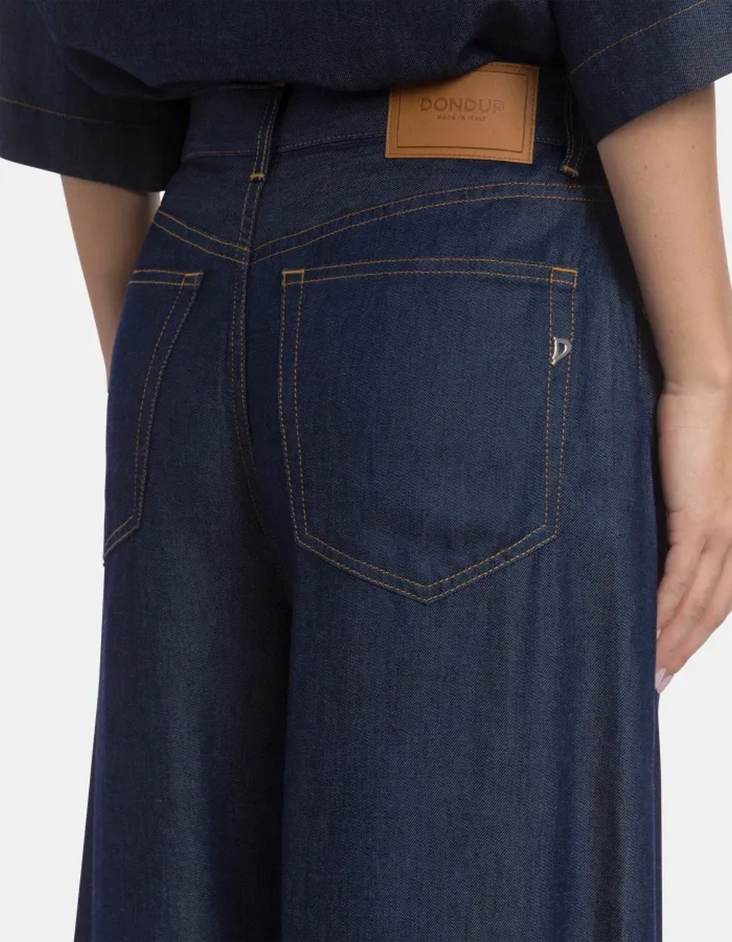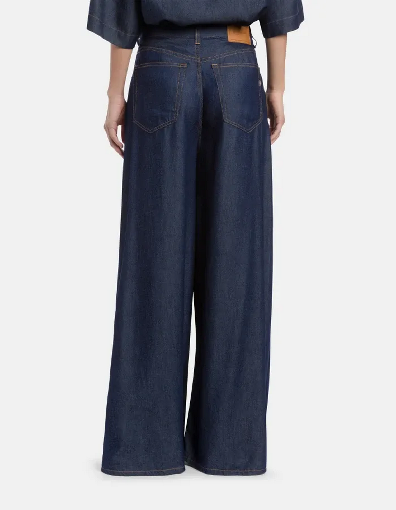 Jeans cinque tasche wide leg fit, vita regolare, gamba a palazzo e pince sul davanti.
