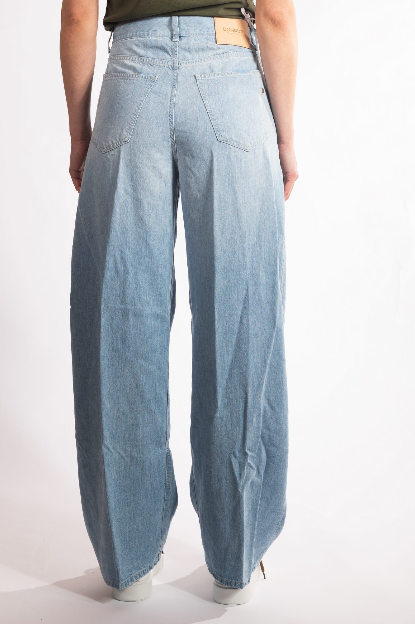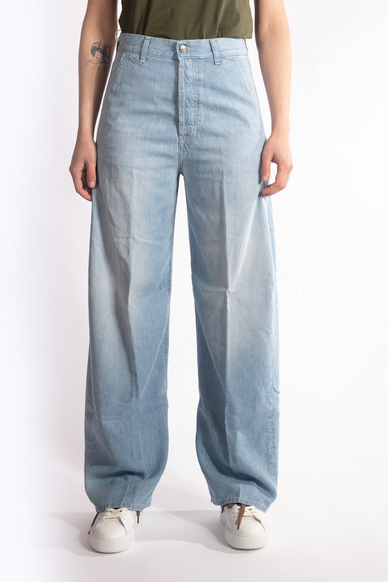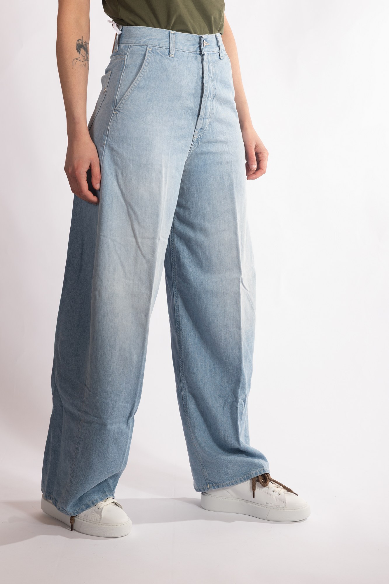 Jeans baggy a gamba ampia, tasche frontali a taglio obliquo, chiusura frontale con zip e bottone metallico.