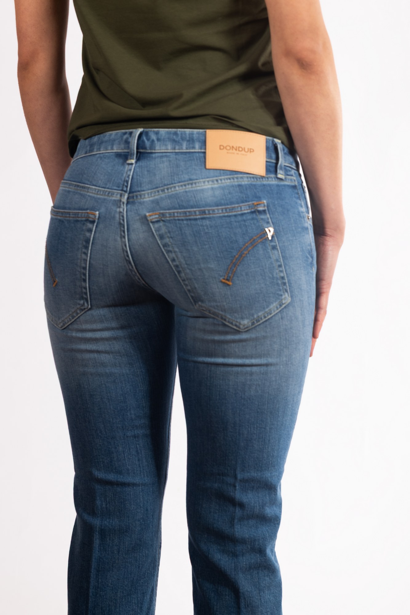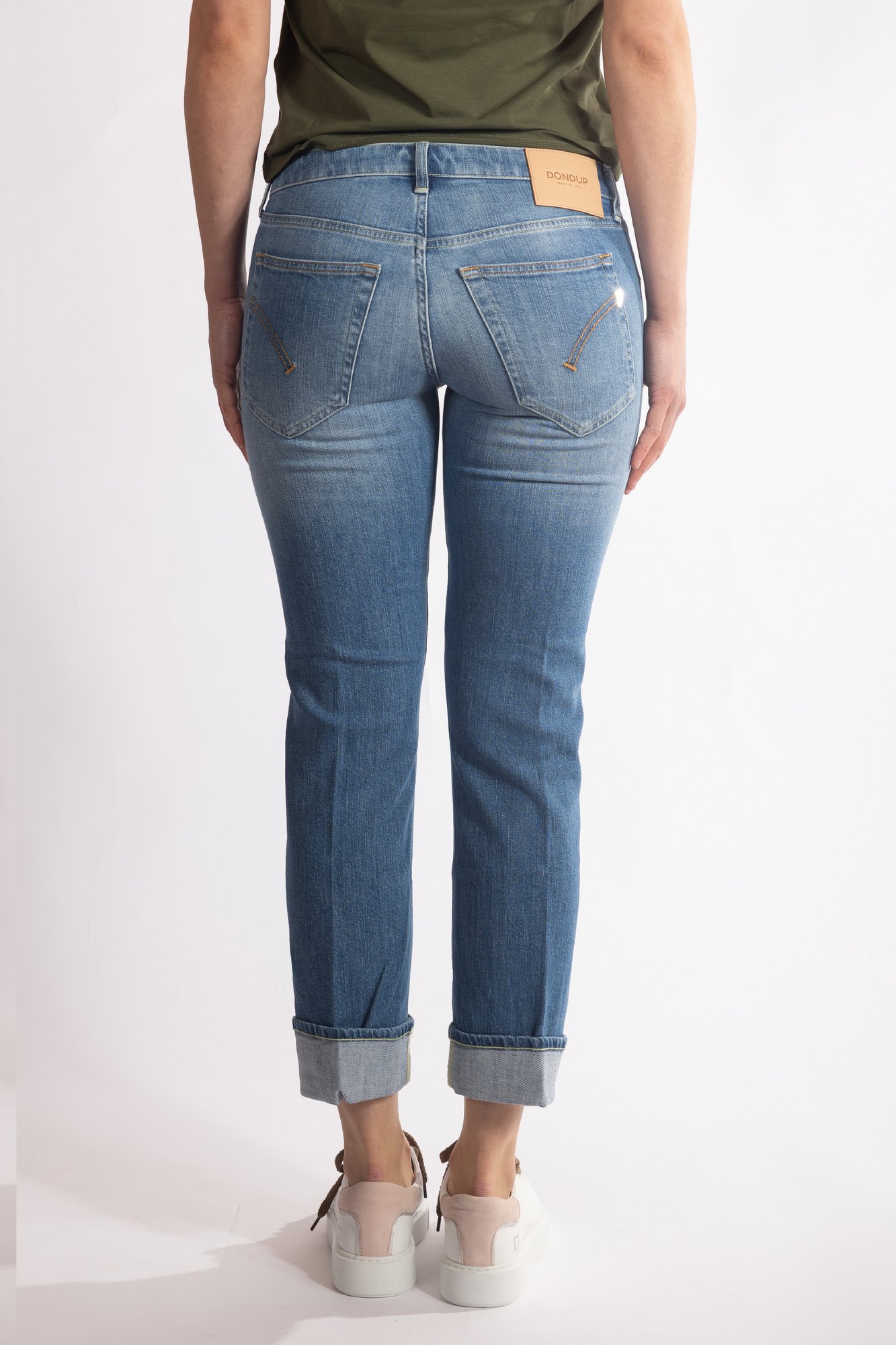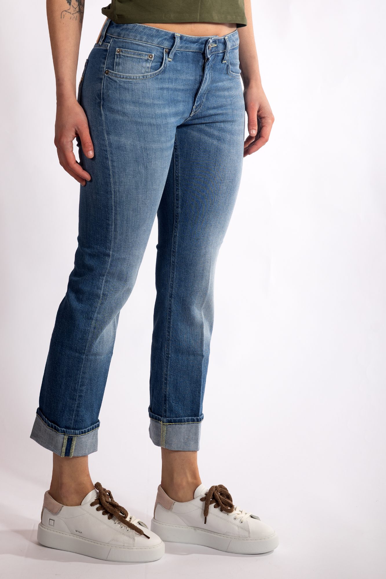Jeans dal taglio dritto con risvolto al fondo e chiusura frontale con bottone metallico logato.