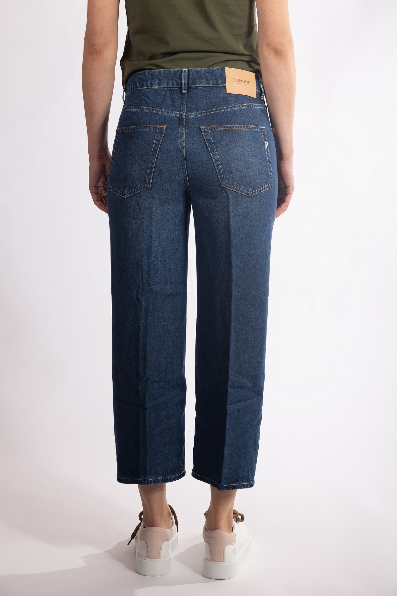 Jeans crop a gamba dritta con cuciture a contrasto, rivetti metallici tradizionali, piega centrale stirata, chiusura frontale con zip e bottone.