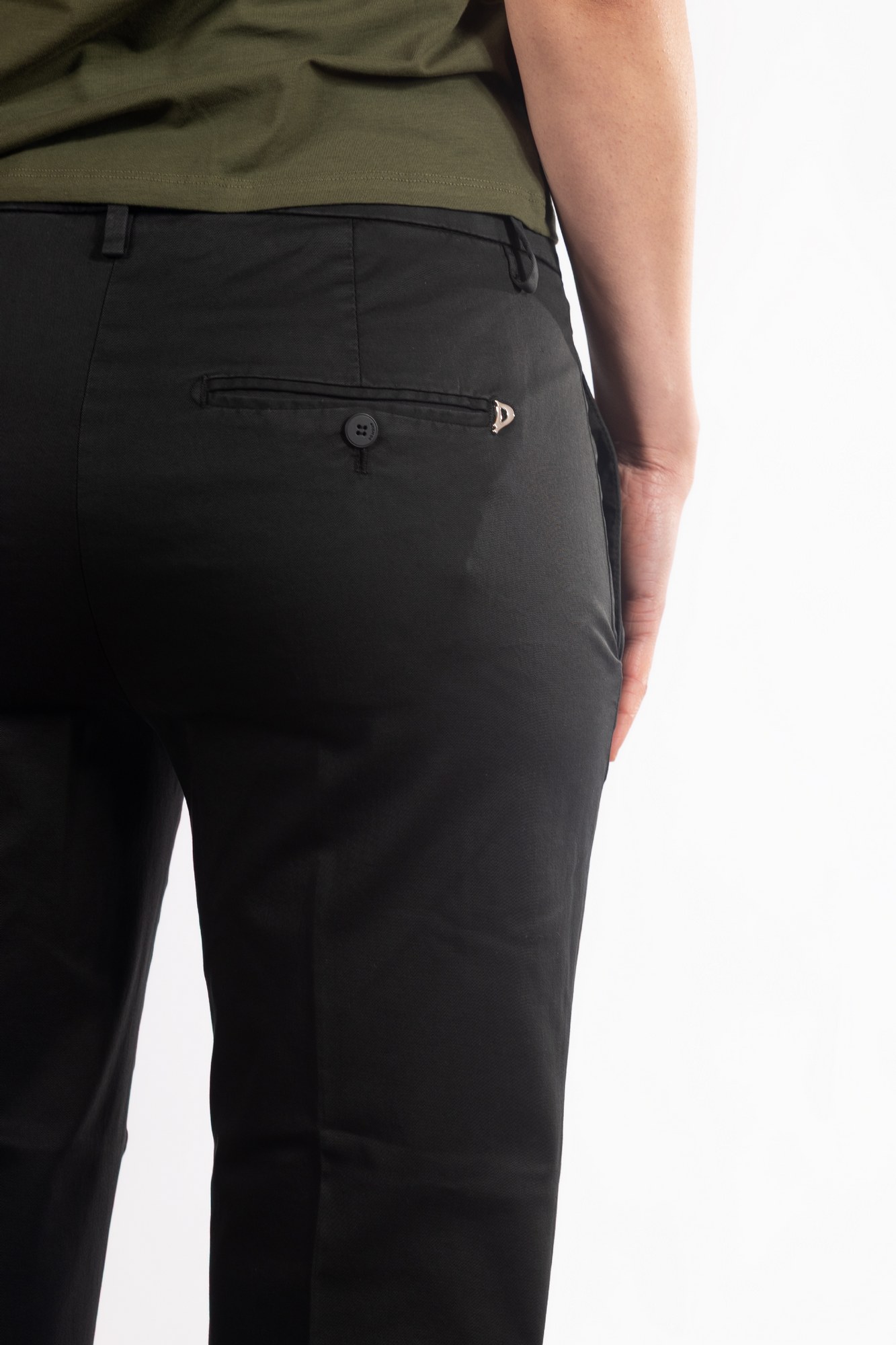 Pantaloni con piega centrale stirata, chiusura frontale con zip e bottone, passanti per cintura e tasche laterali a filo.