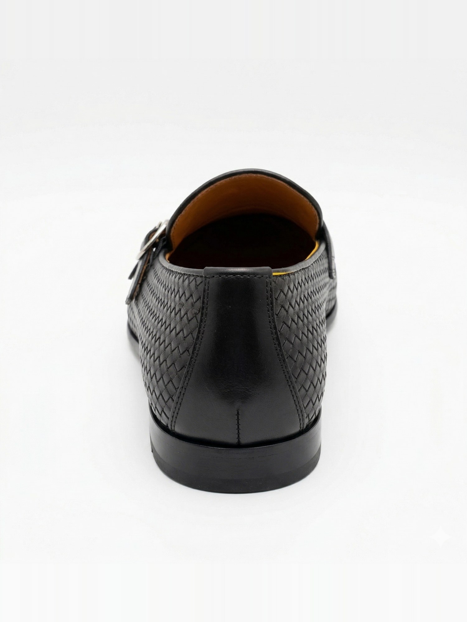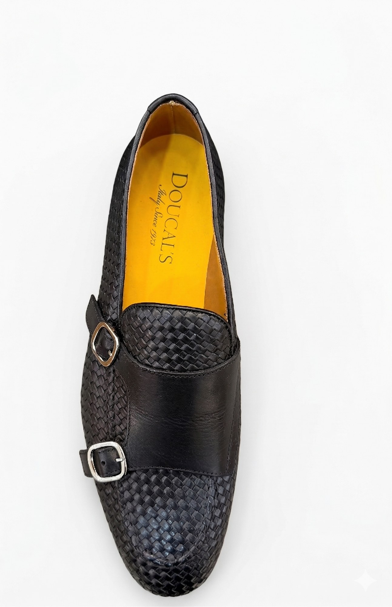 Mocassino in pelle intrecciata con chiusura con doppio cinturino e fibbie e suola sottile in gomma.