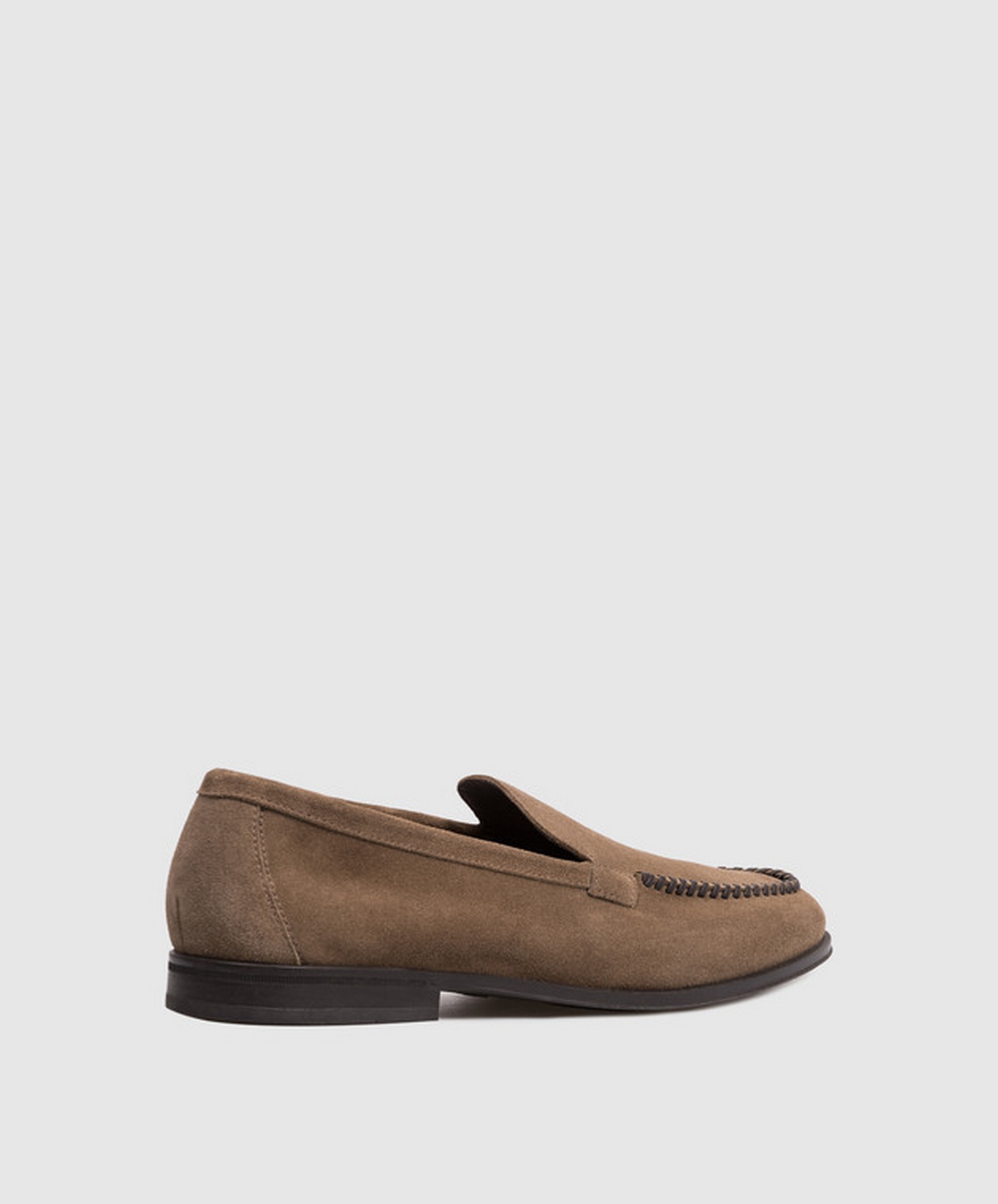 Mocassino in scamosciato di vitello con infilatura in pelle sulla parte superiore.