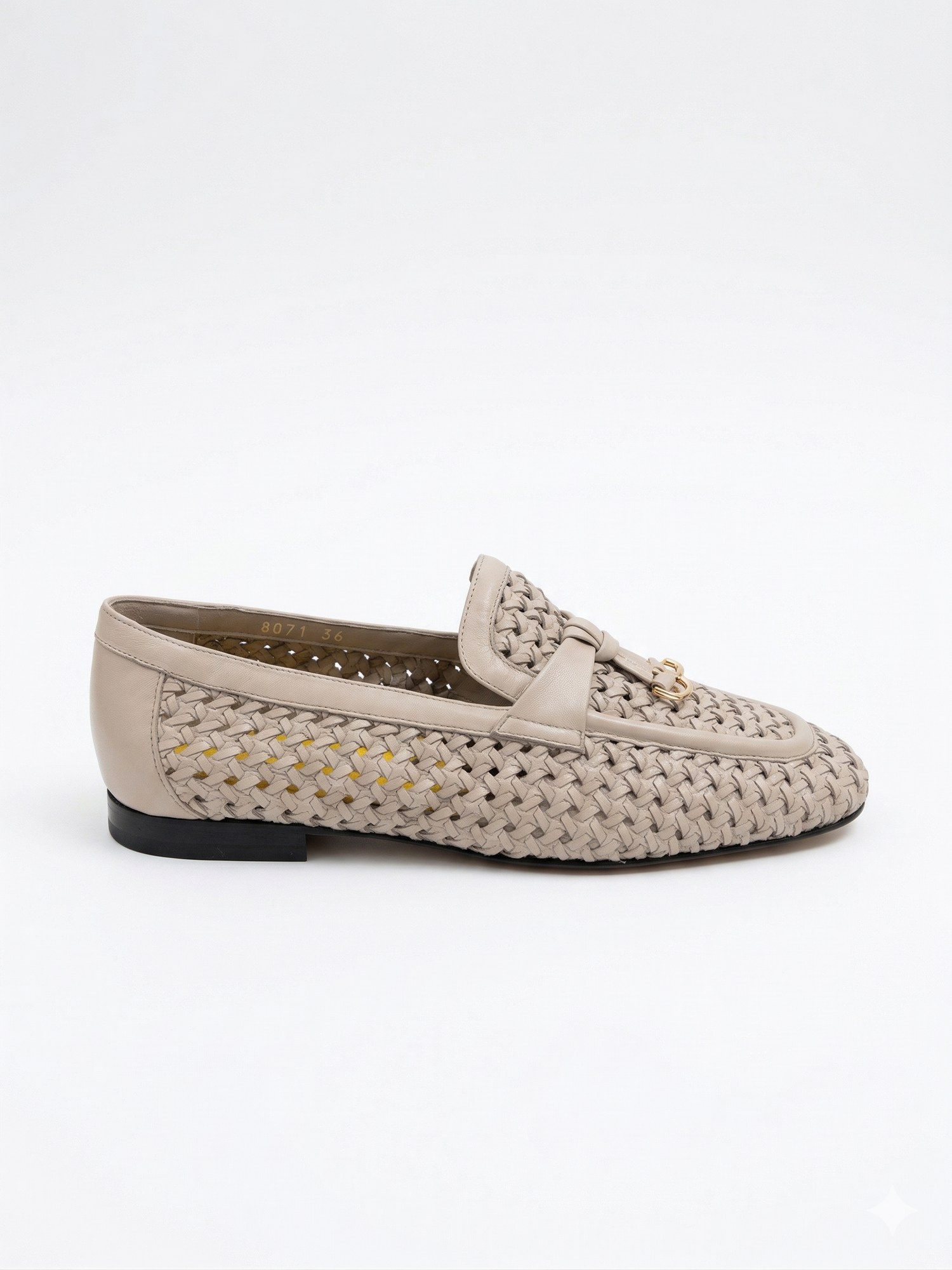 Mocassino in pelle intrecciata con morsetto sulla mascherina e suola antiscivolo.