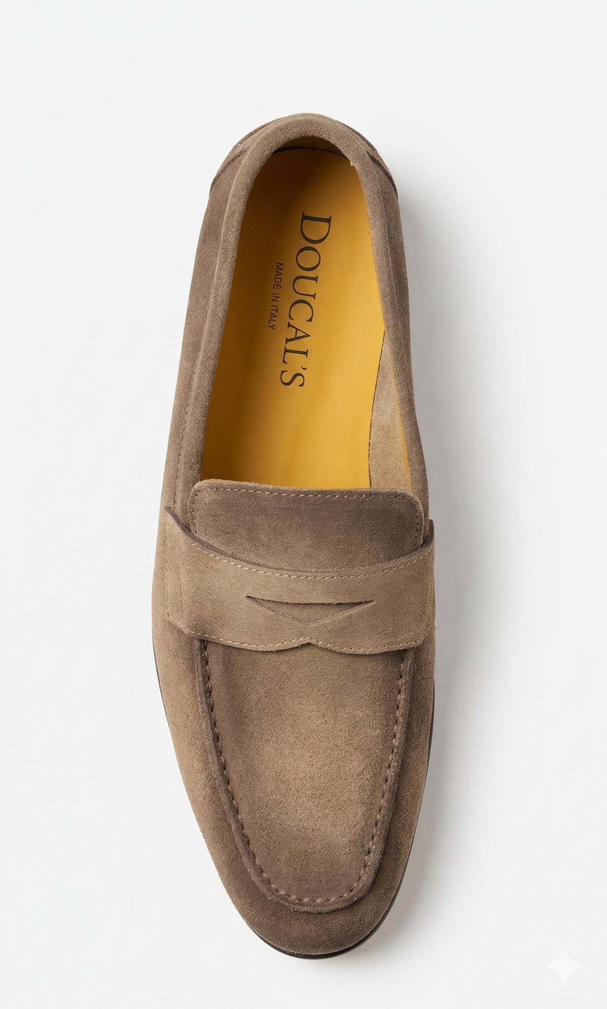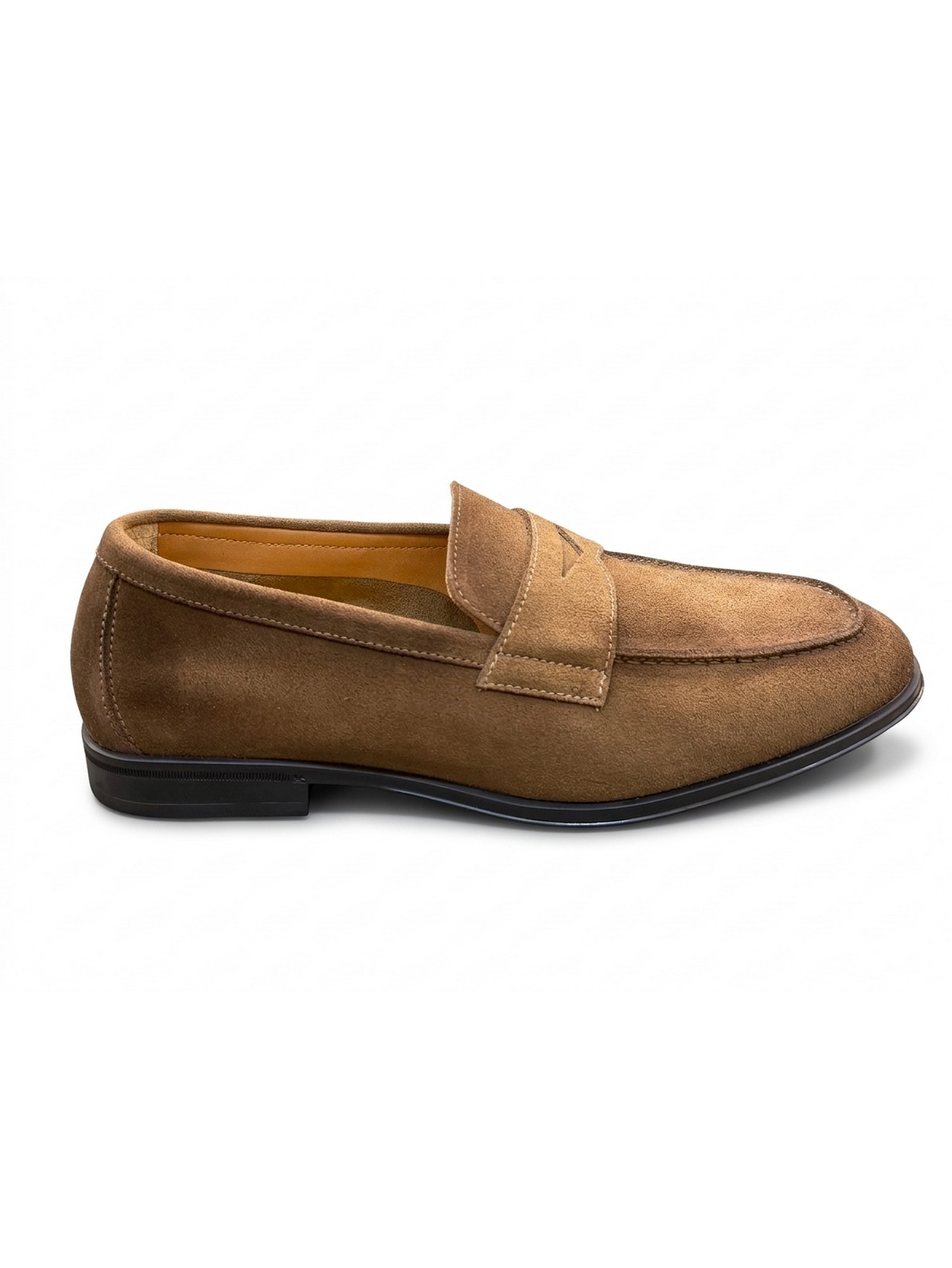 Mocassino in pelle scamosciata con cuciture a vista, suola in gomma e soletta interna con logo.