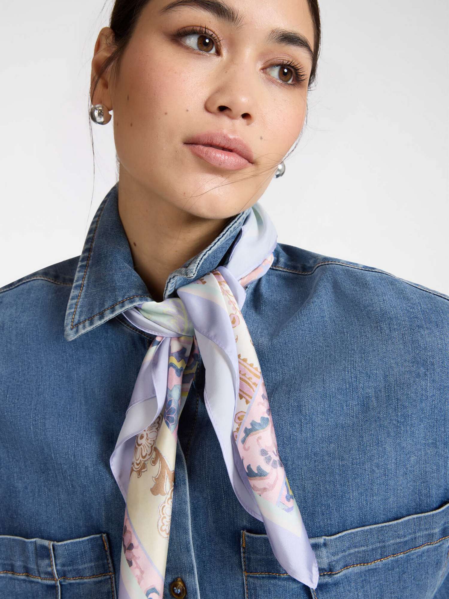Camicia in denim con lavaggio washed, chiusura a bottoni e colletto con asola in cui inserire il foulard stampato.