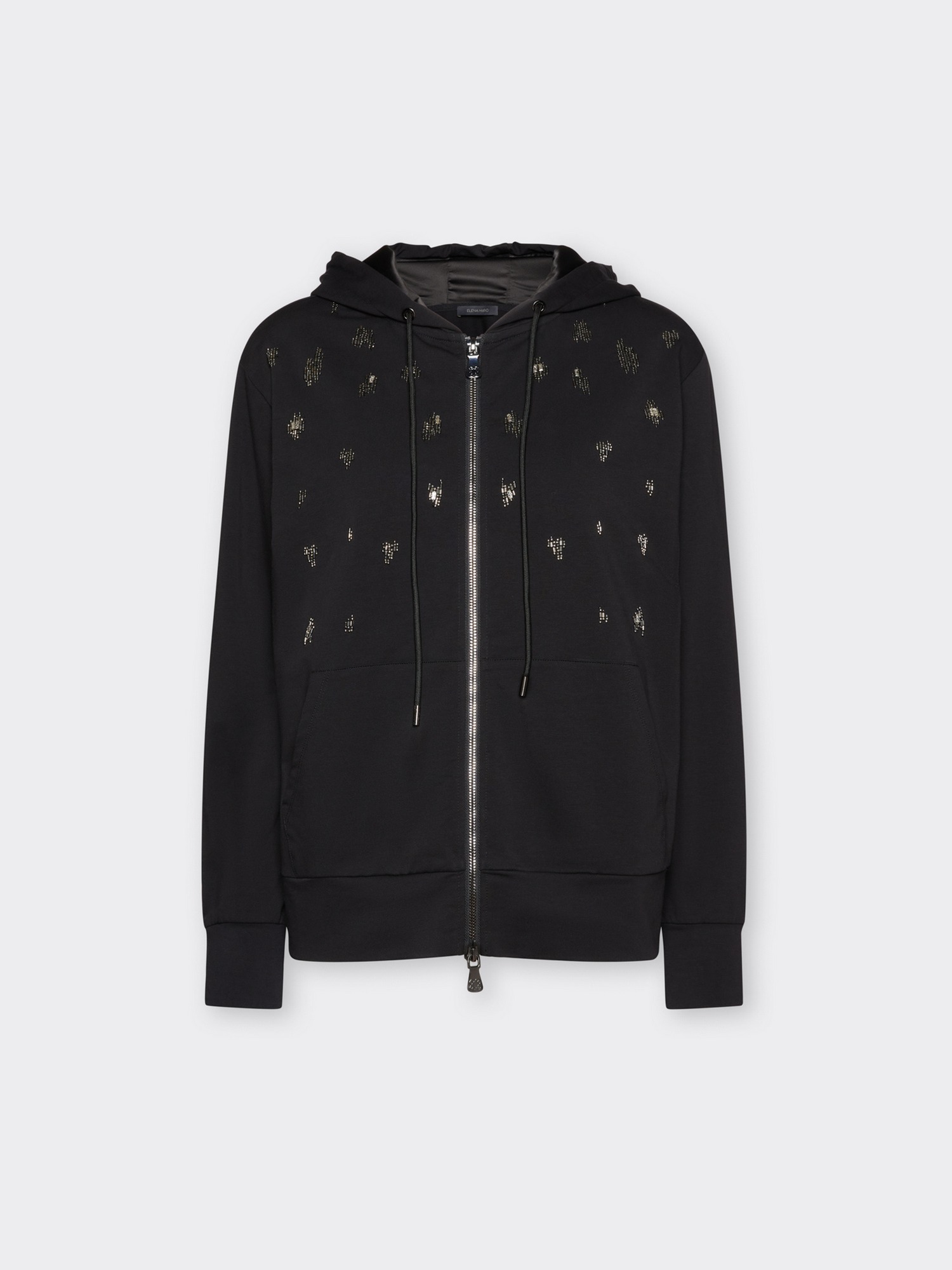 Felpa in cotone con ricami davanti, chiusura con zip e cappuccio regolabile.