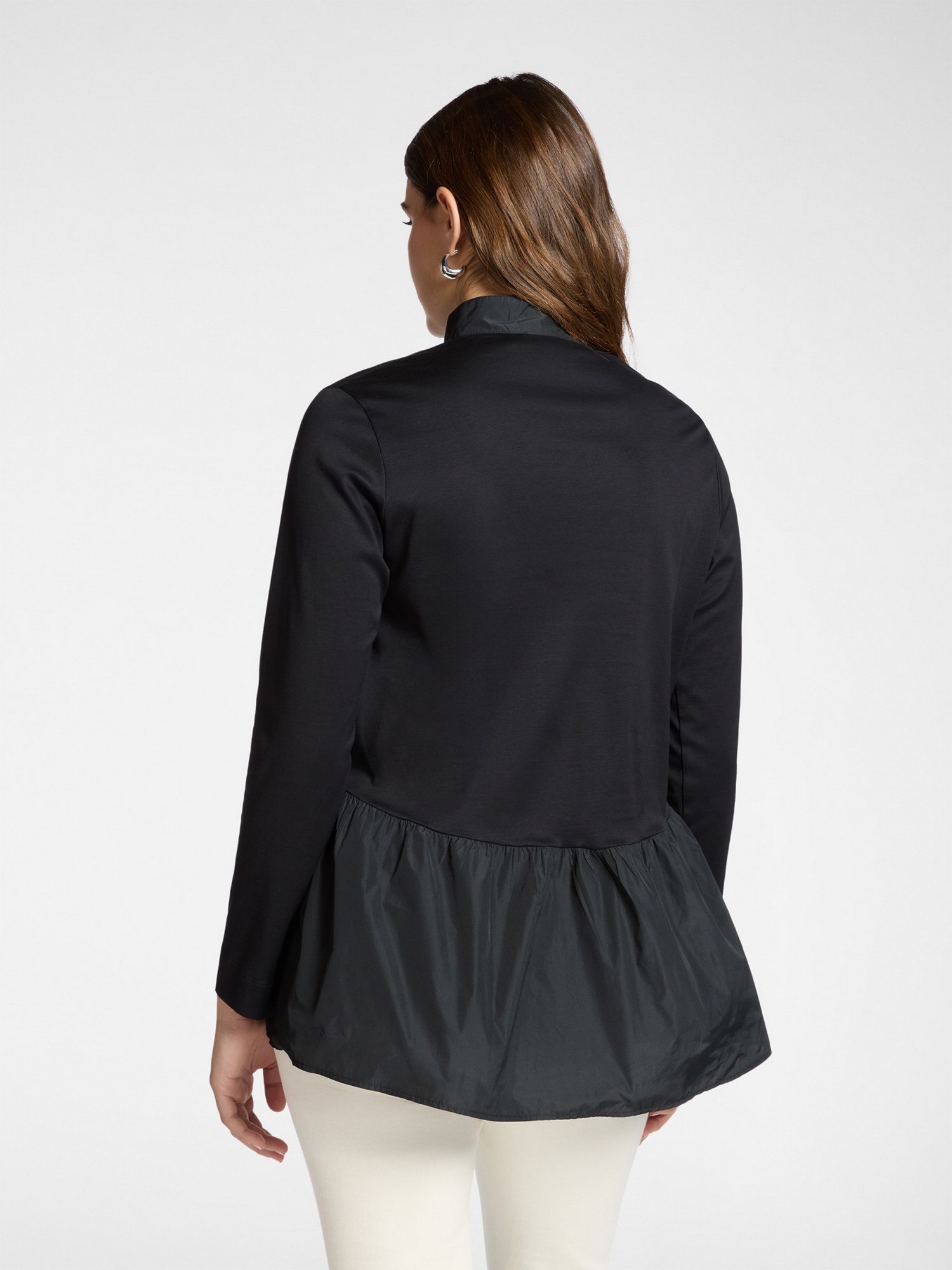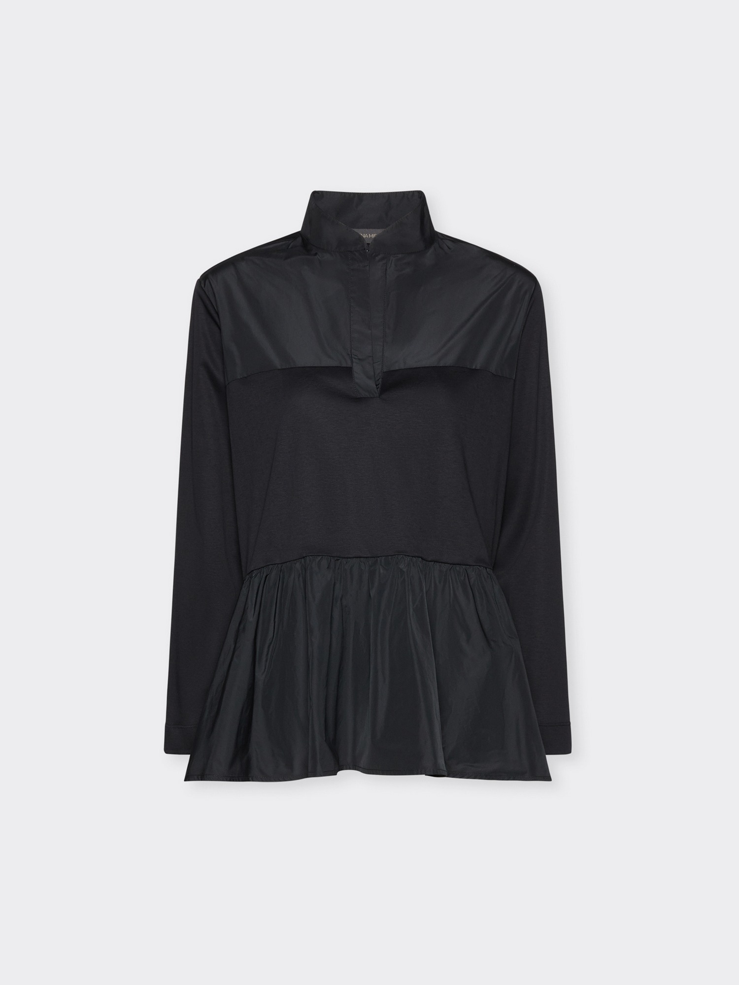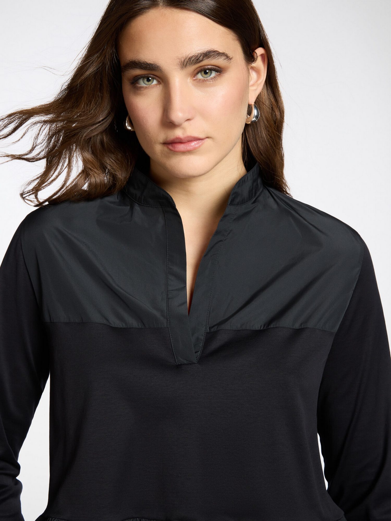 T-shirt bimaterica in jersey misto cotone con scollatura a V e lavorazione con volant al fondo.