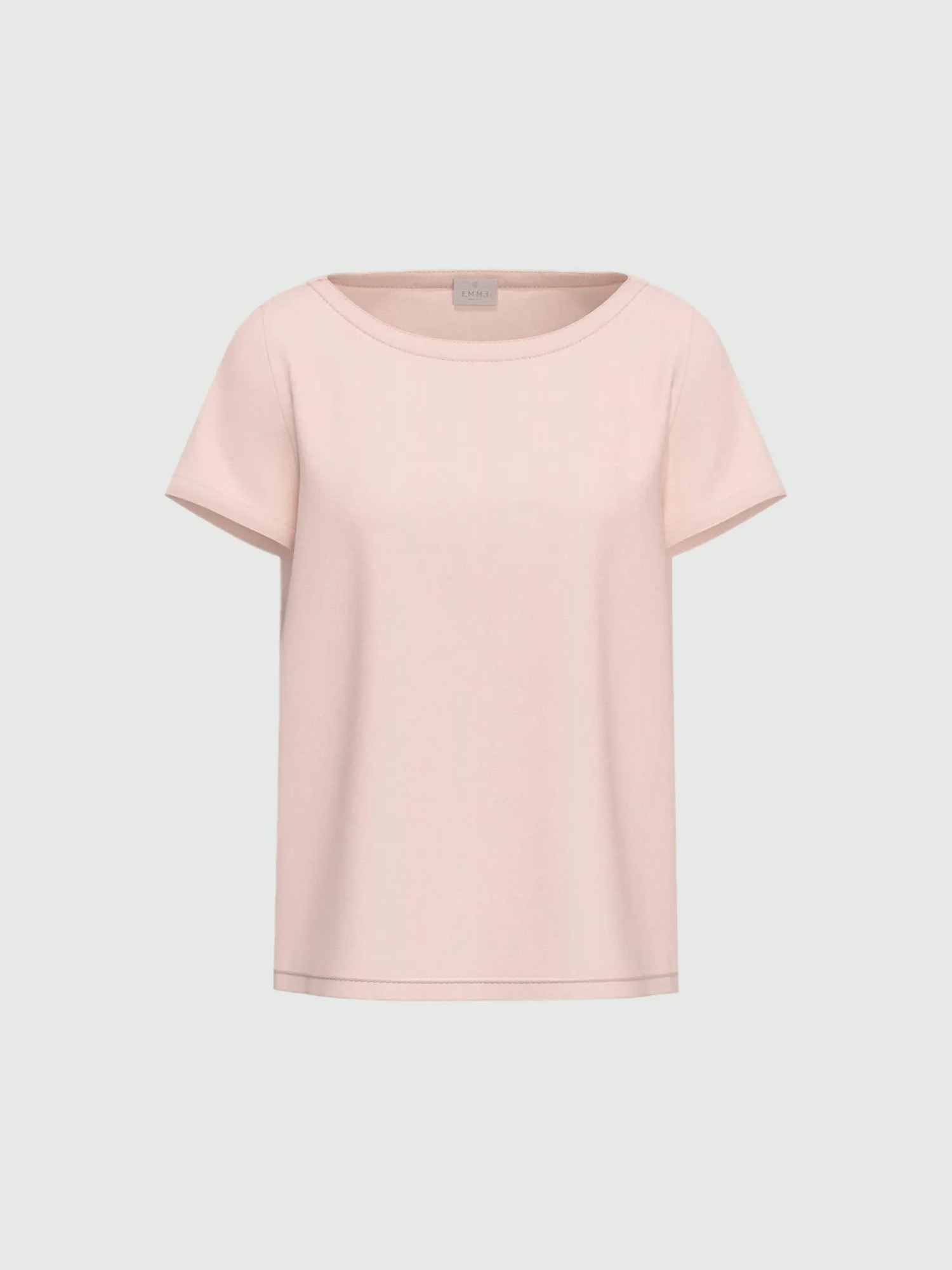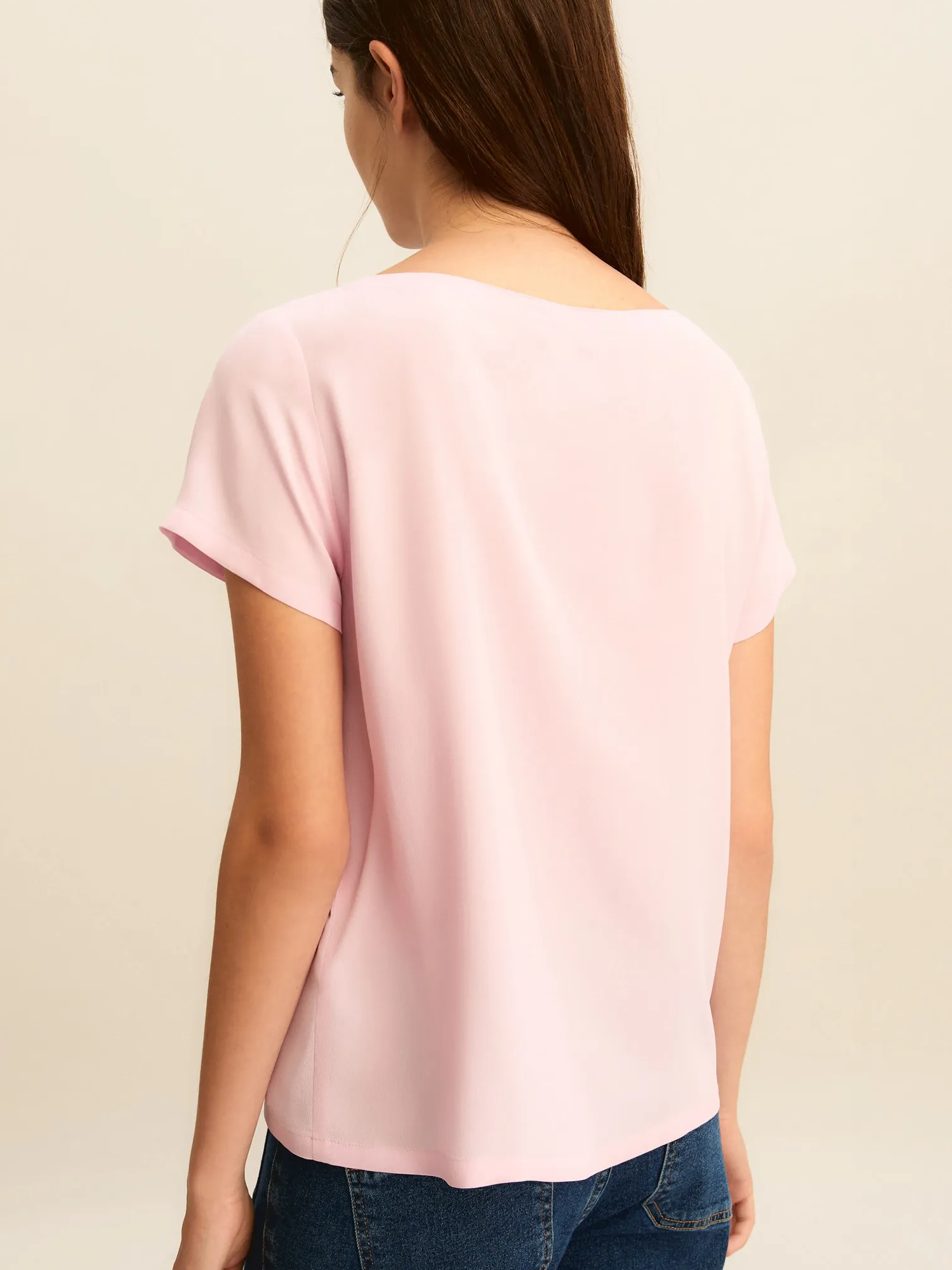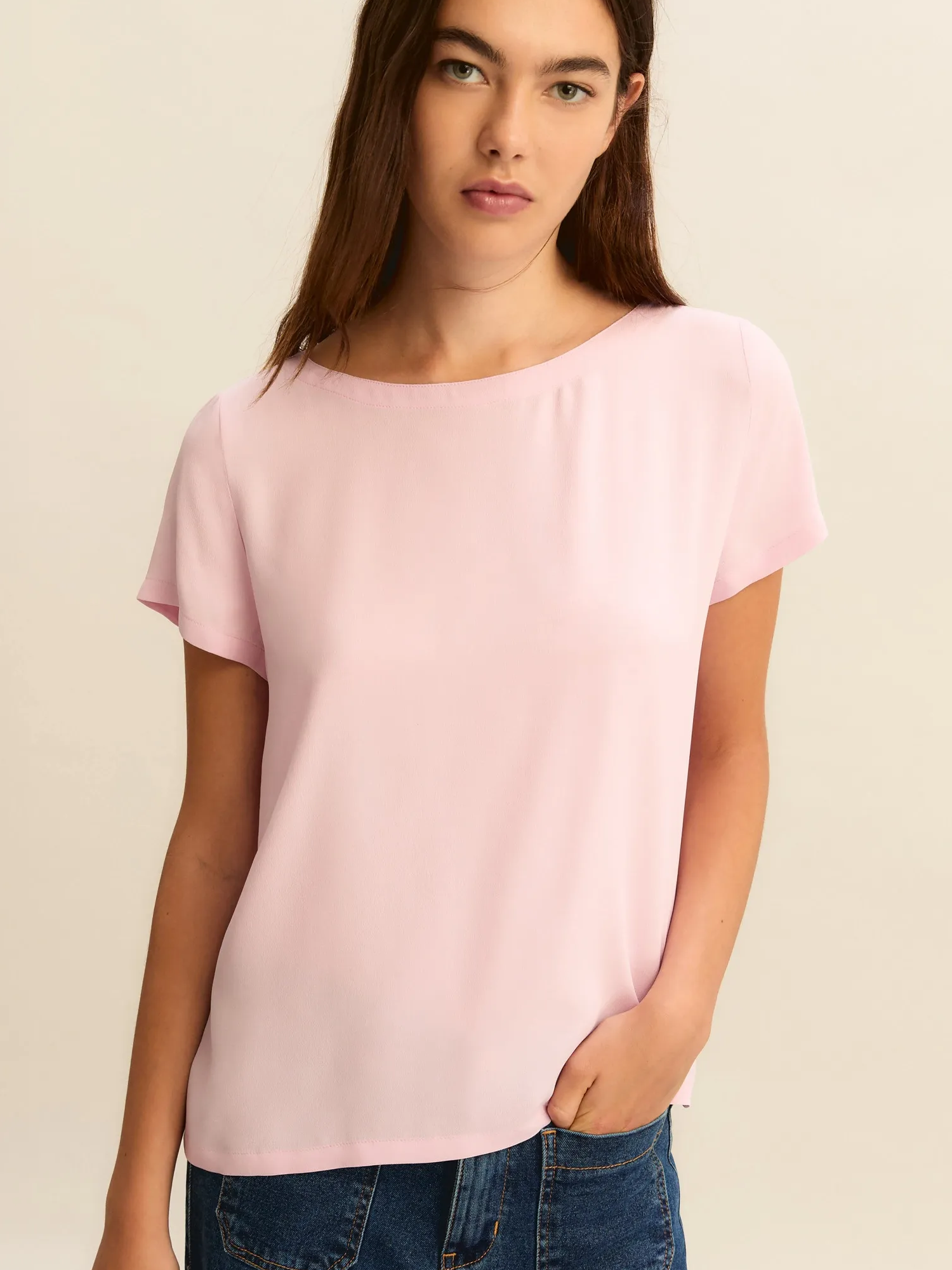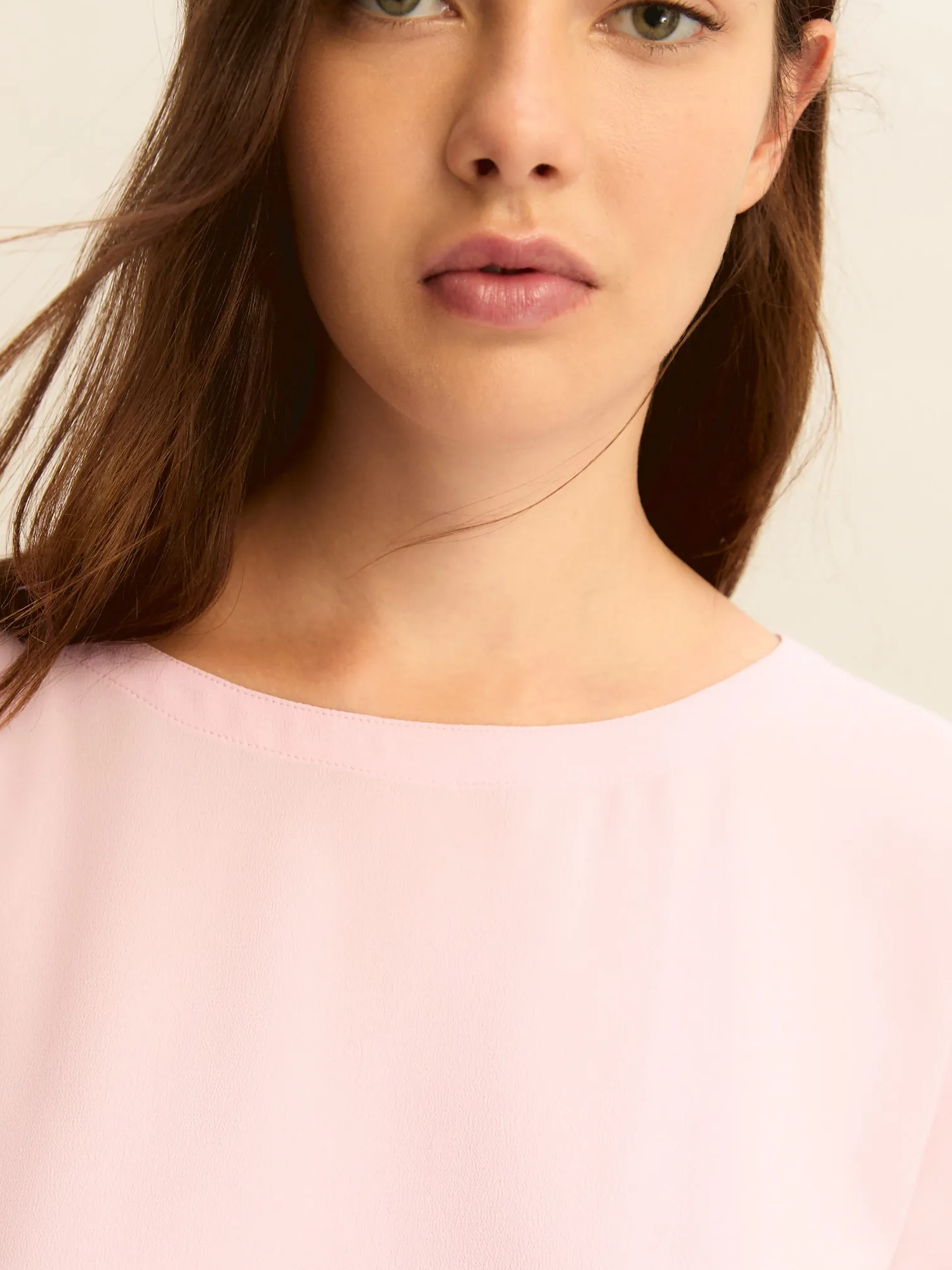Blusa in crêpe de Chine di misto seta con scollo a barchetta e manica corta.