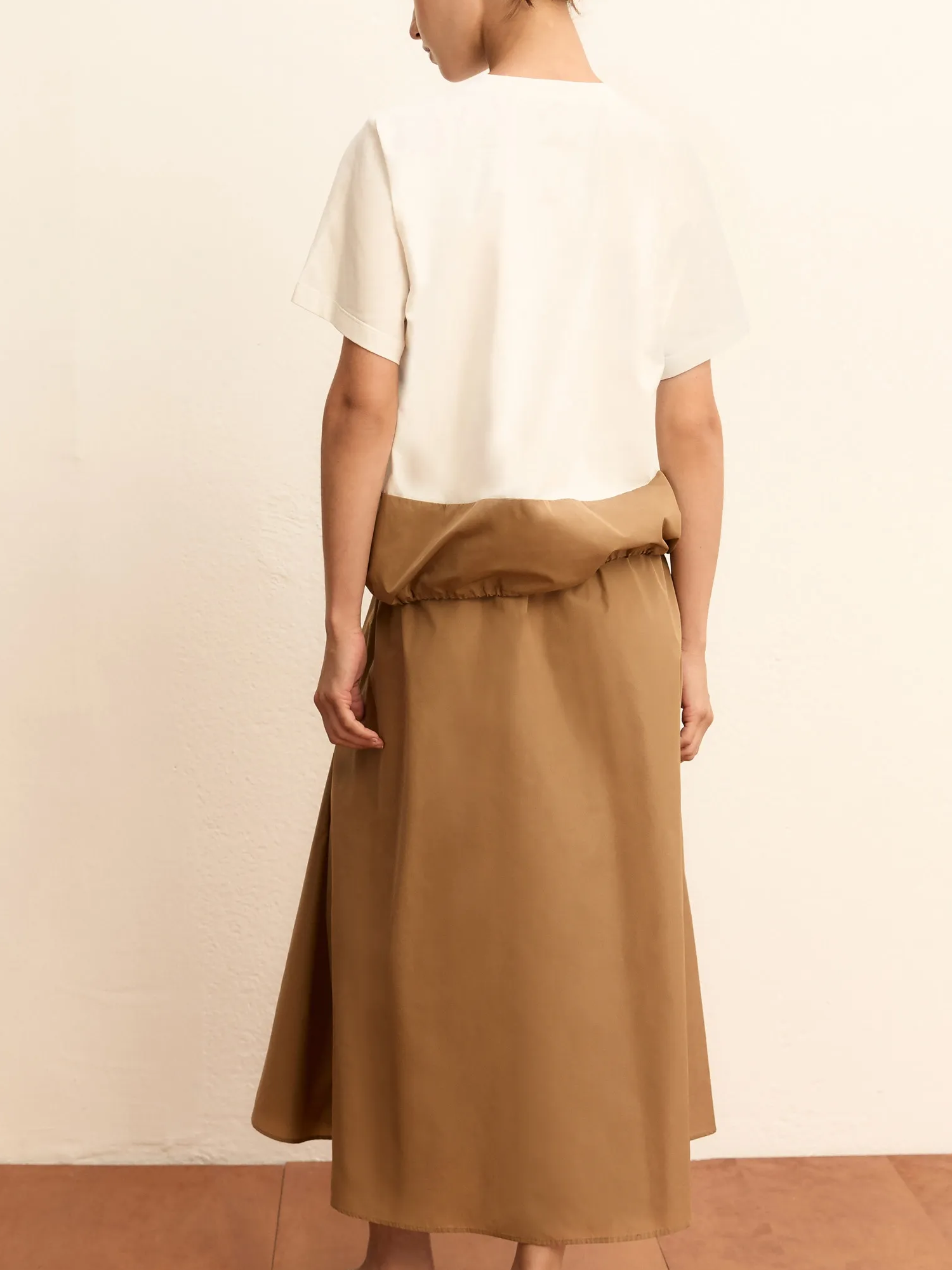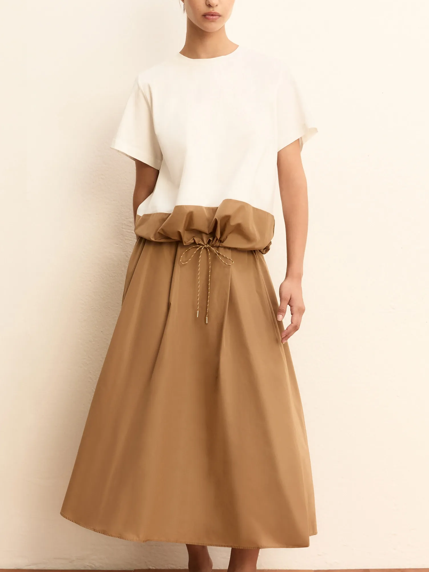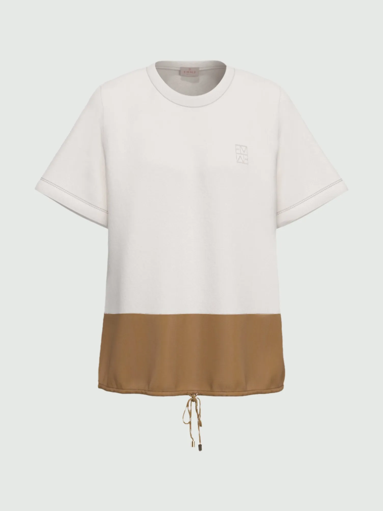 Blusa in jersey di cotone stretch e taffetà con collo stondato, ricamo monogram al petto, inserto in taffetà a contrasto colore sul fondo, con coulisse e finalini metallici.