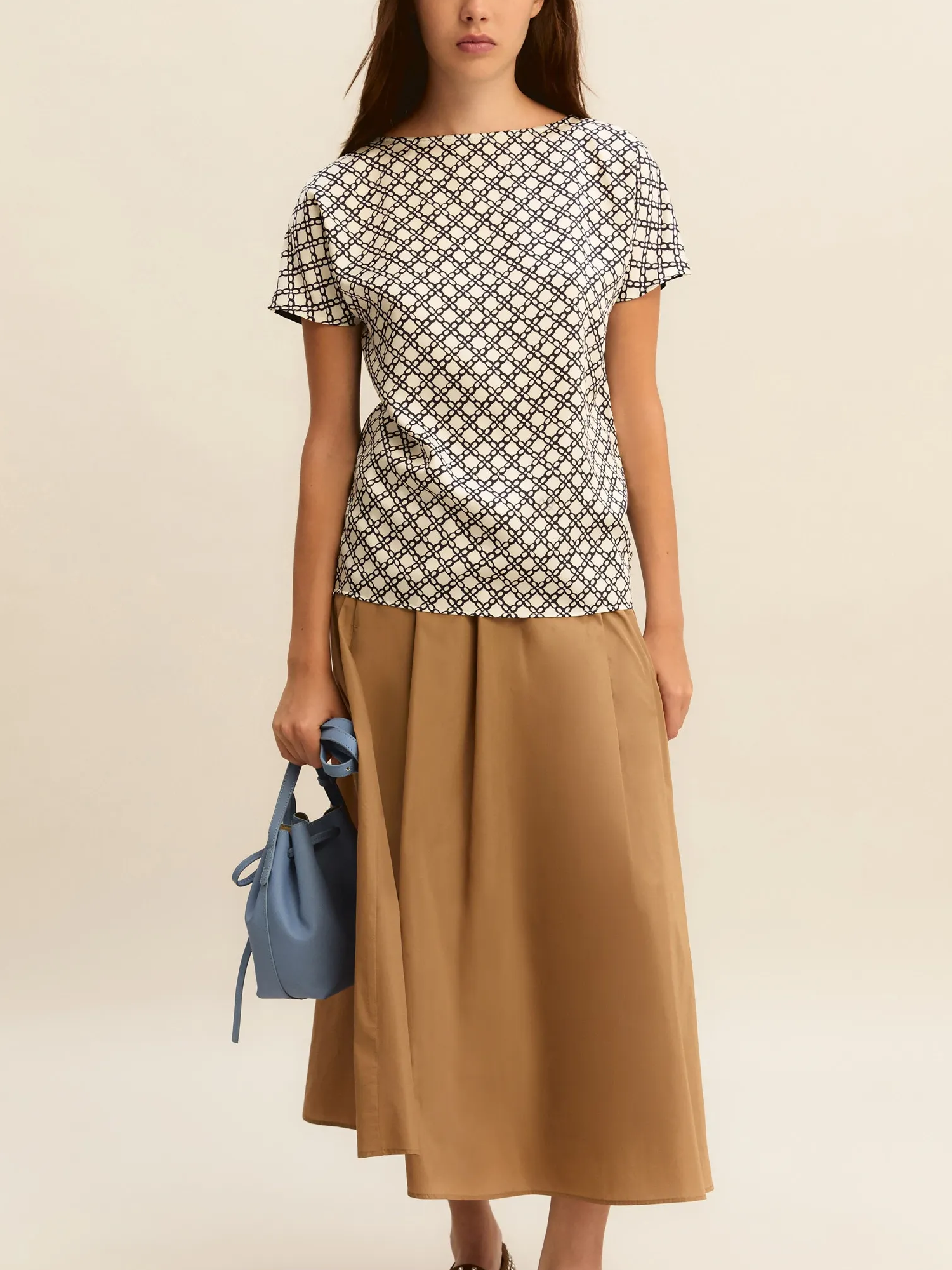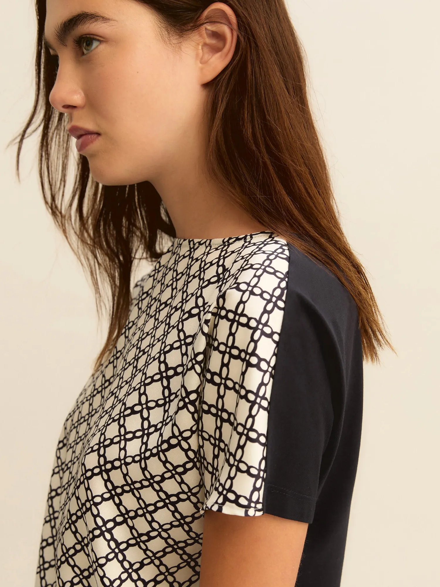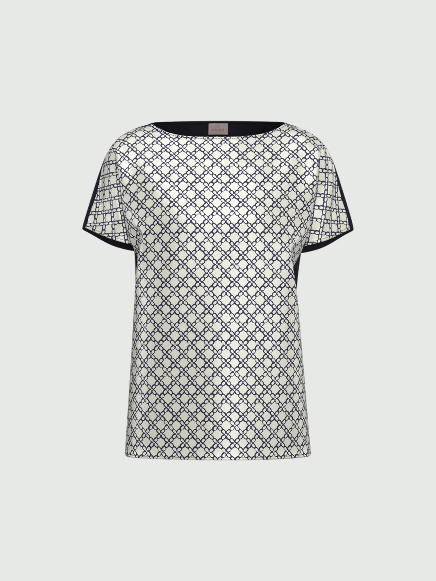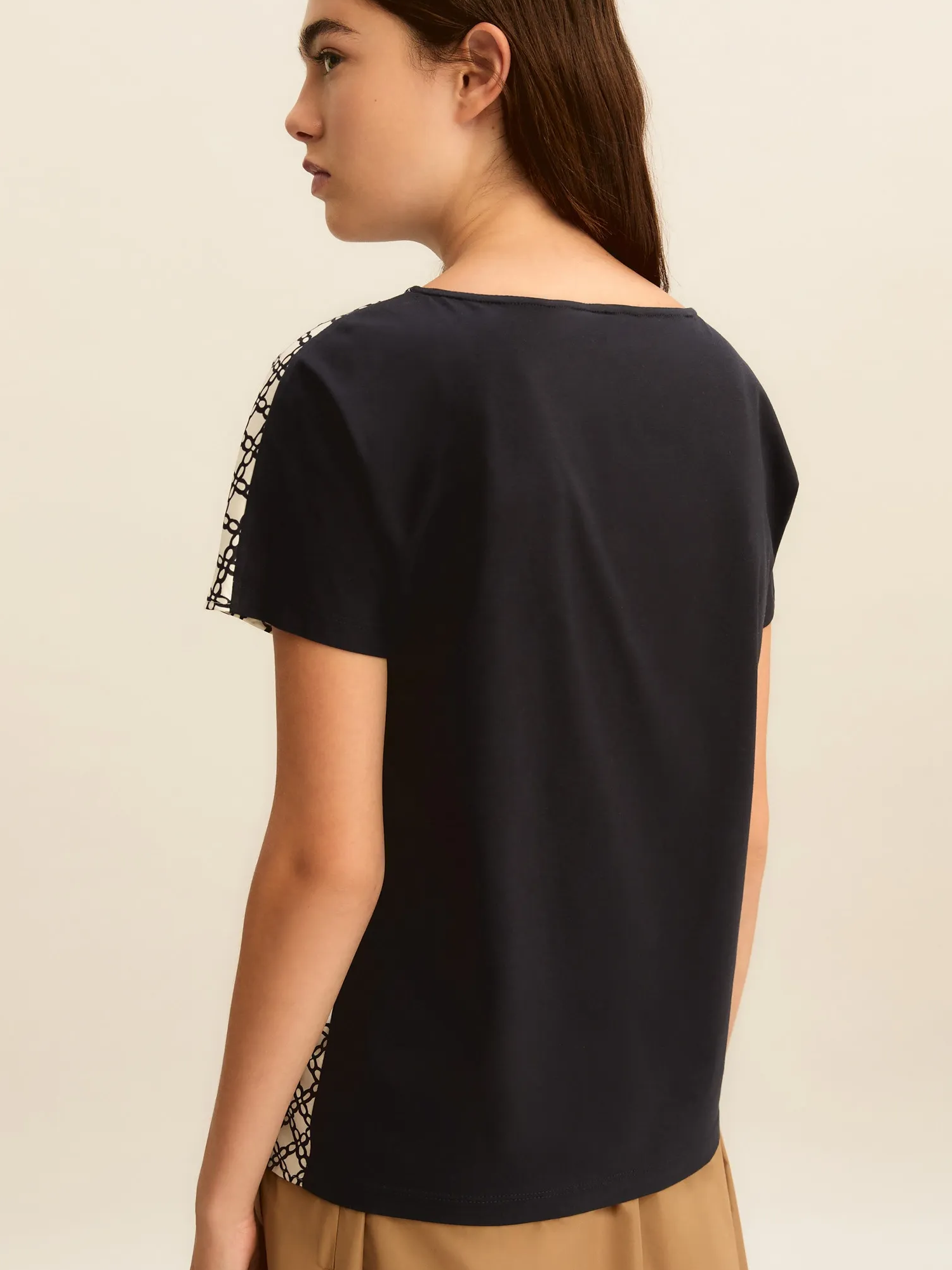 Blusa in twill stampato sul davanti e jersey di cotone stretch sul retro, scollo a barchetta e maniche corte.