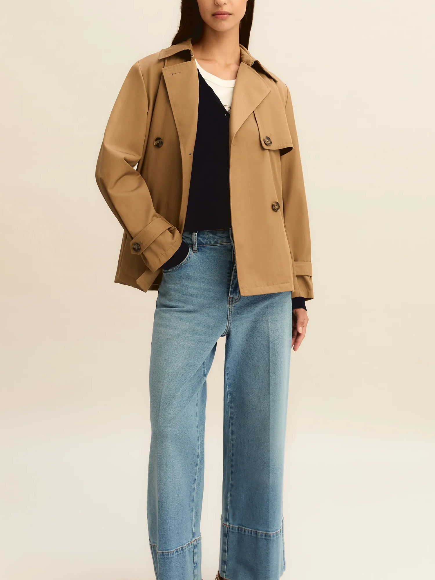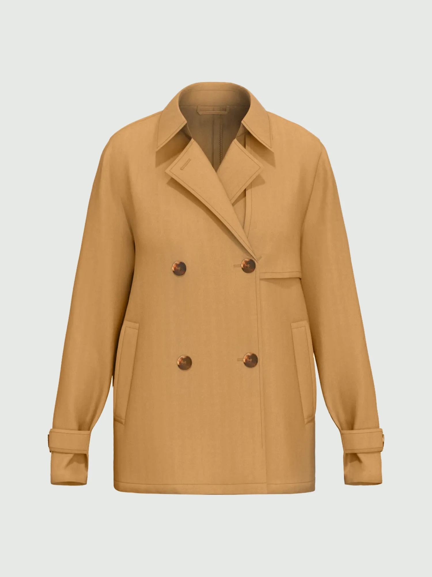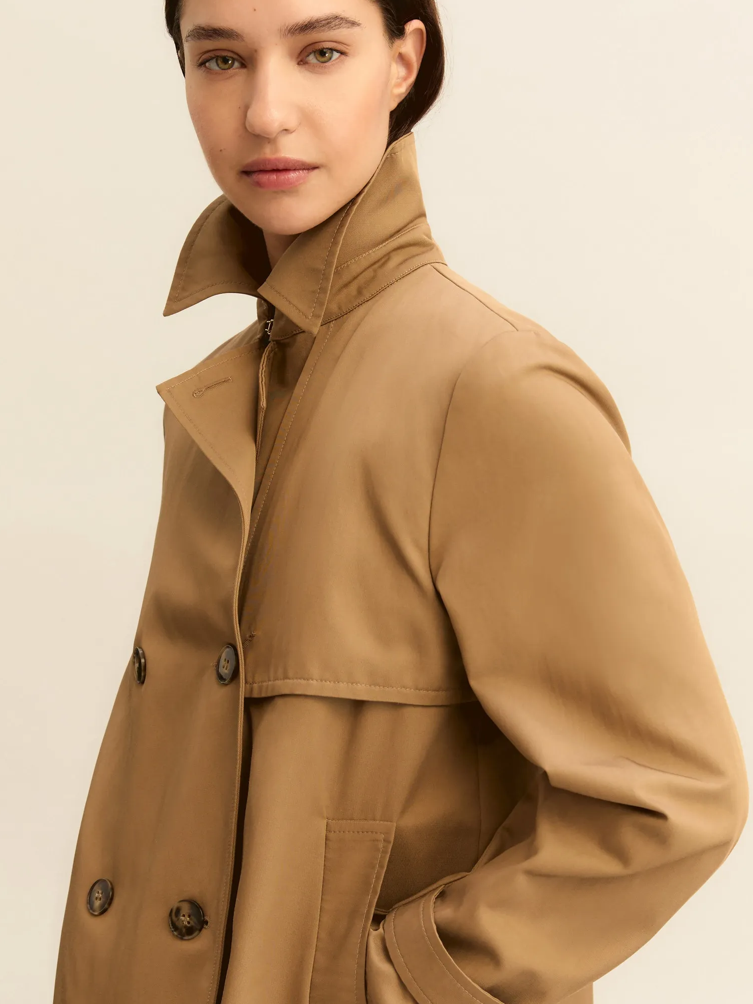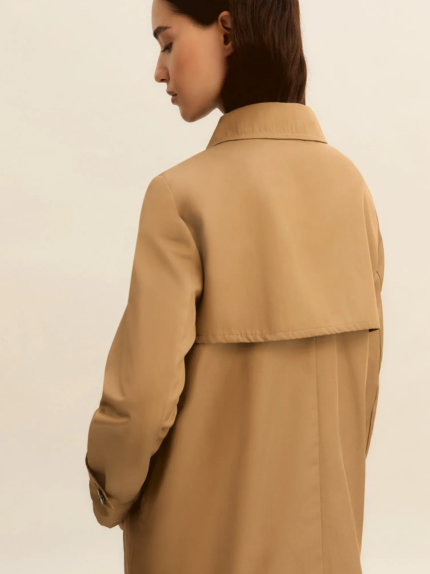 Impermeabile in gabardina antigoccia con collo con rever, abbottonatura a doppiopetto e bavoletta sul davanti, mantellina sul retro e alamari ai polsi e tasche laterali con filettone.