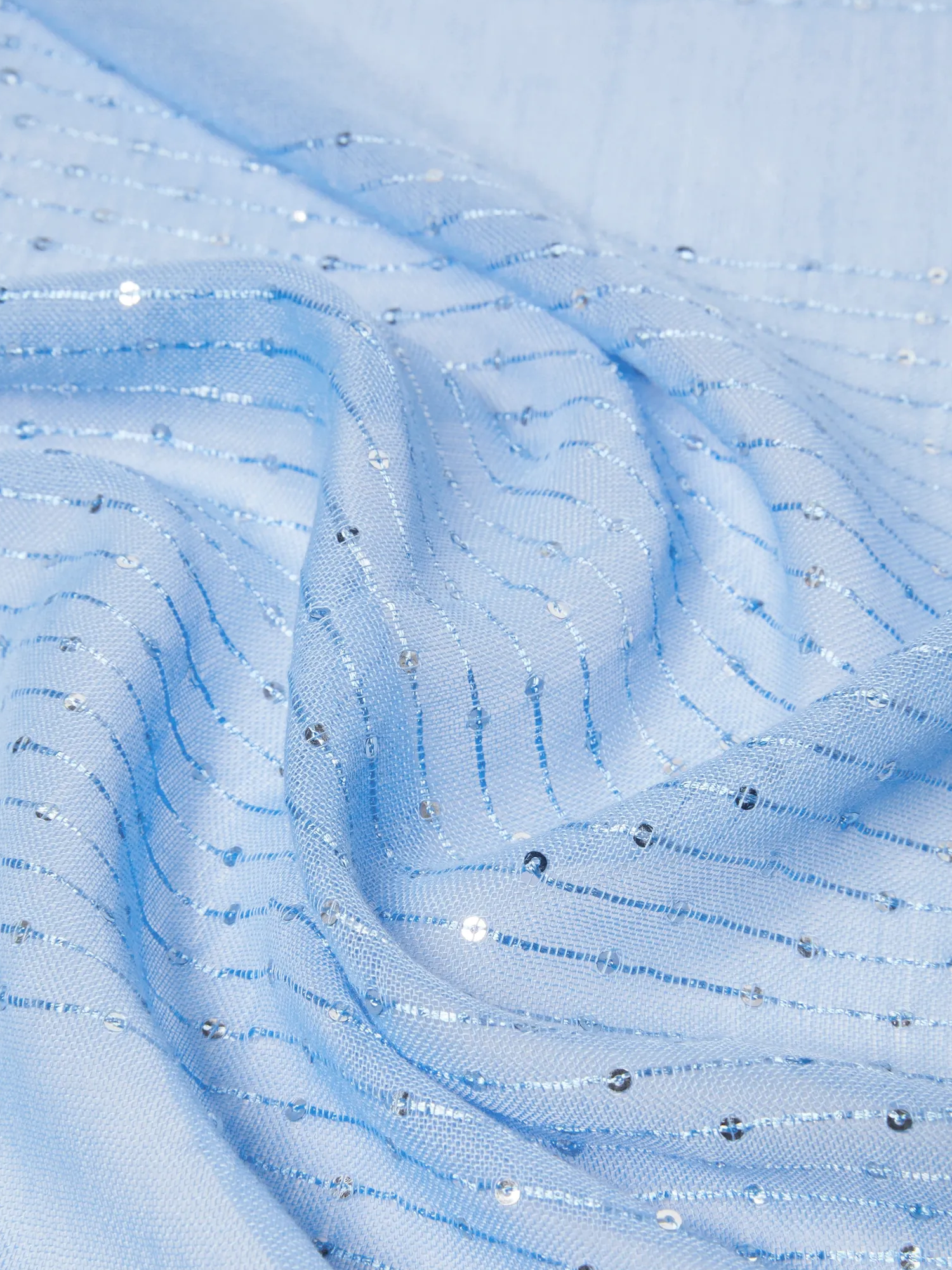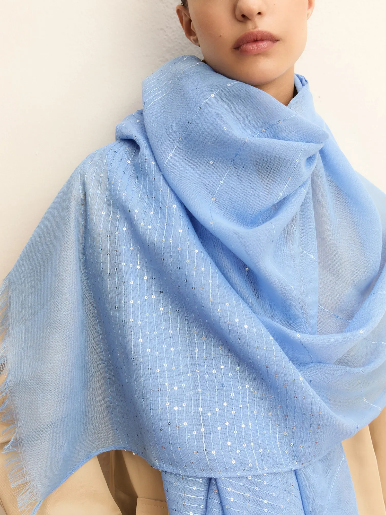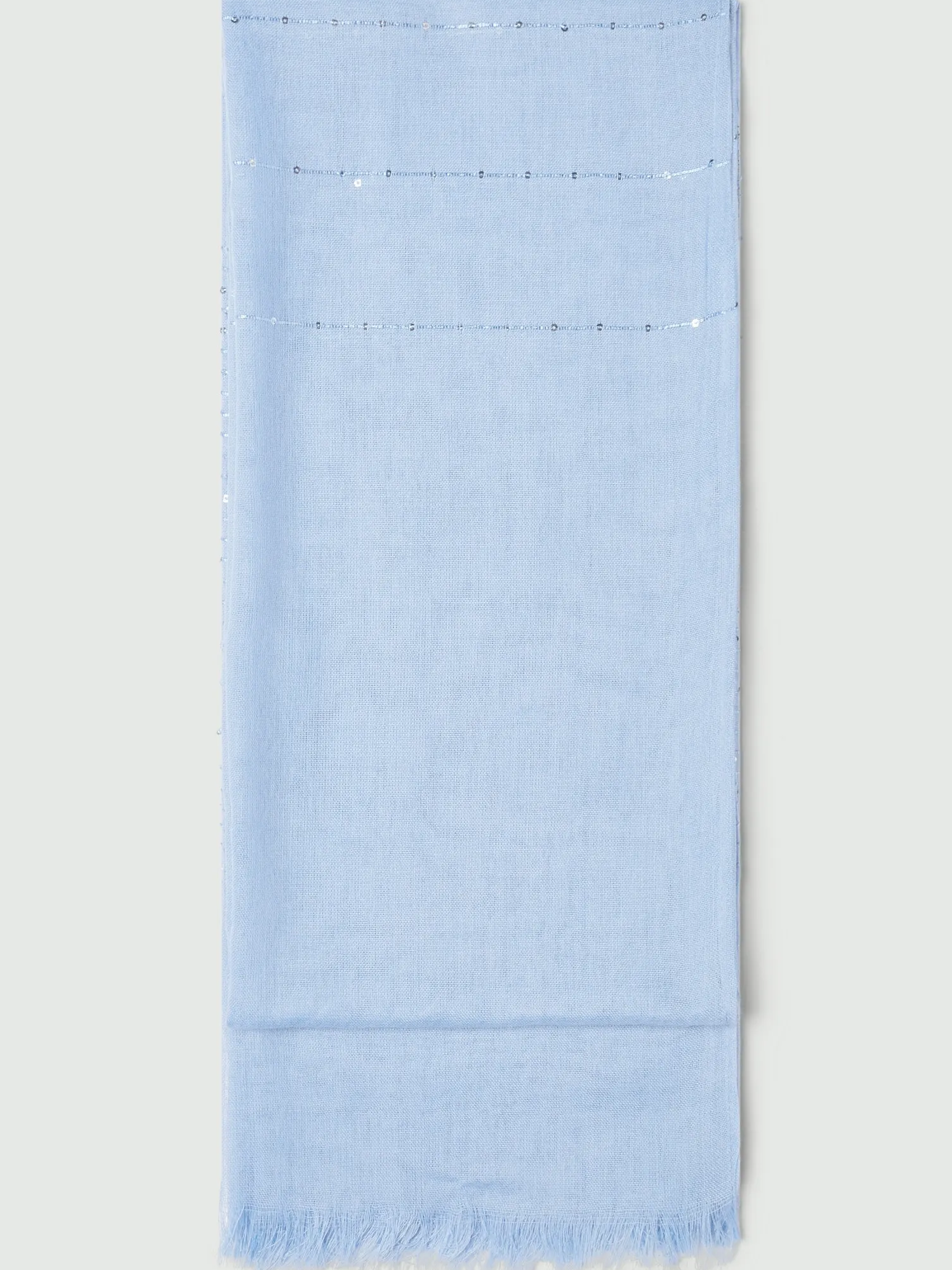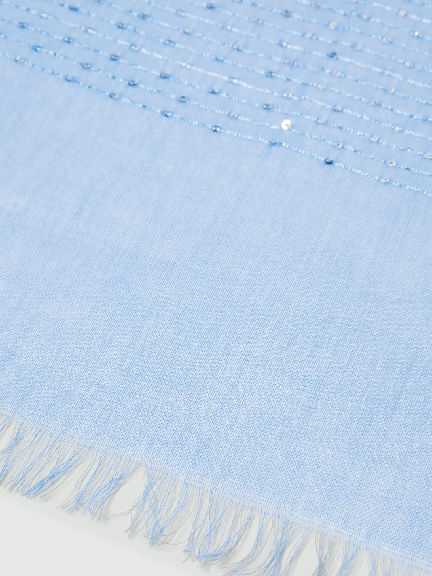 Sciarpain misto cotone leggero con paillette, motivo di righe orizzontali e frangiacorta al fondo.