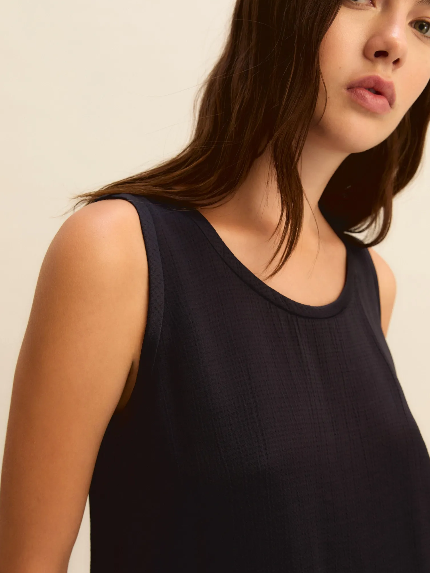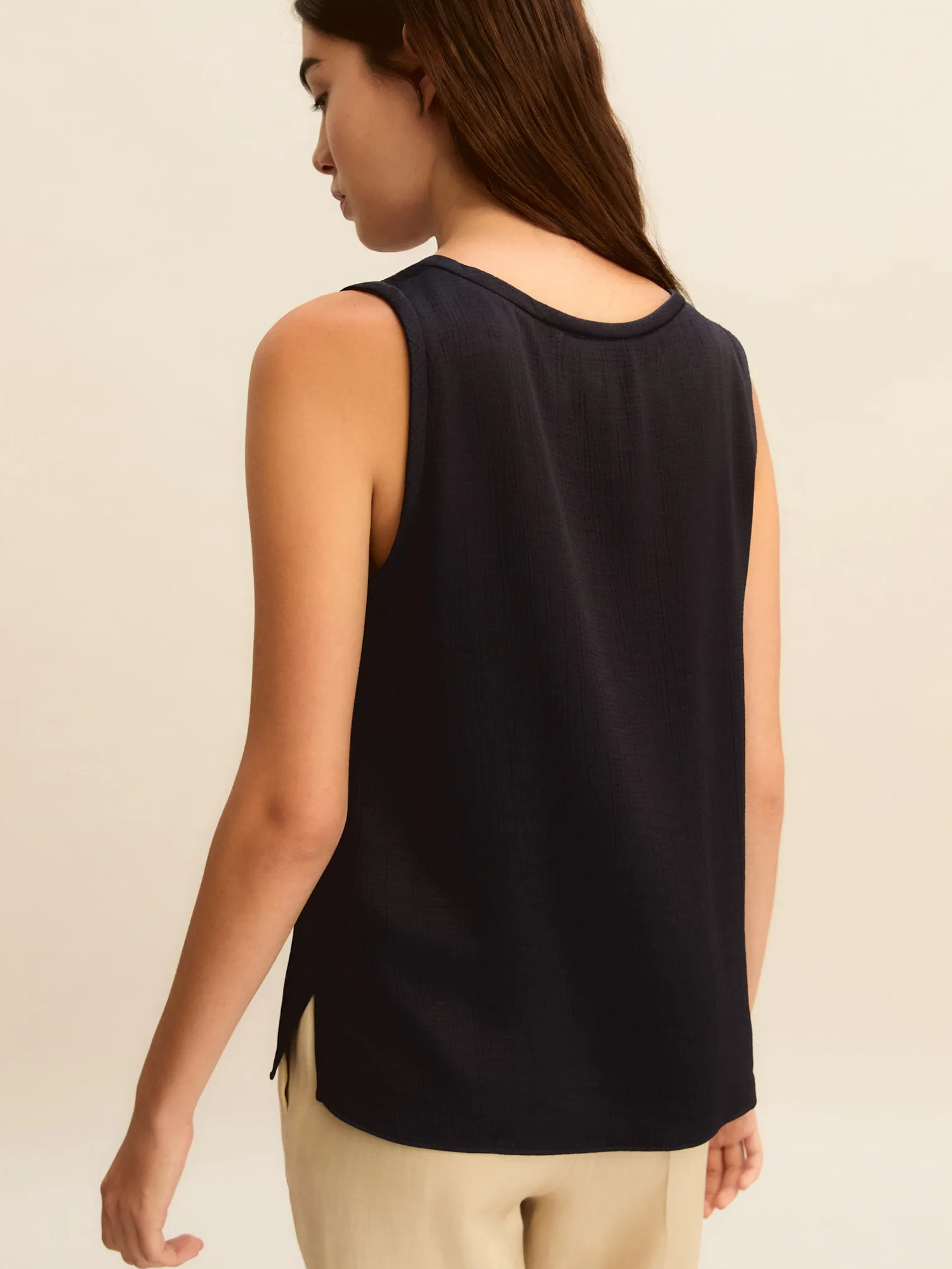 Top in acetato di viscosa lavato con effetto martellato, scollo stondato e spacchetti laterali.