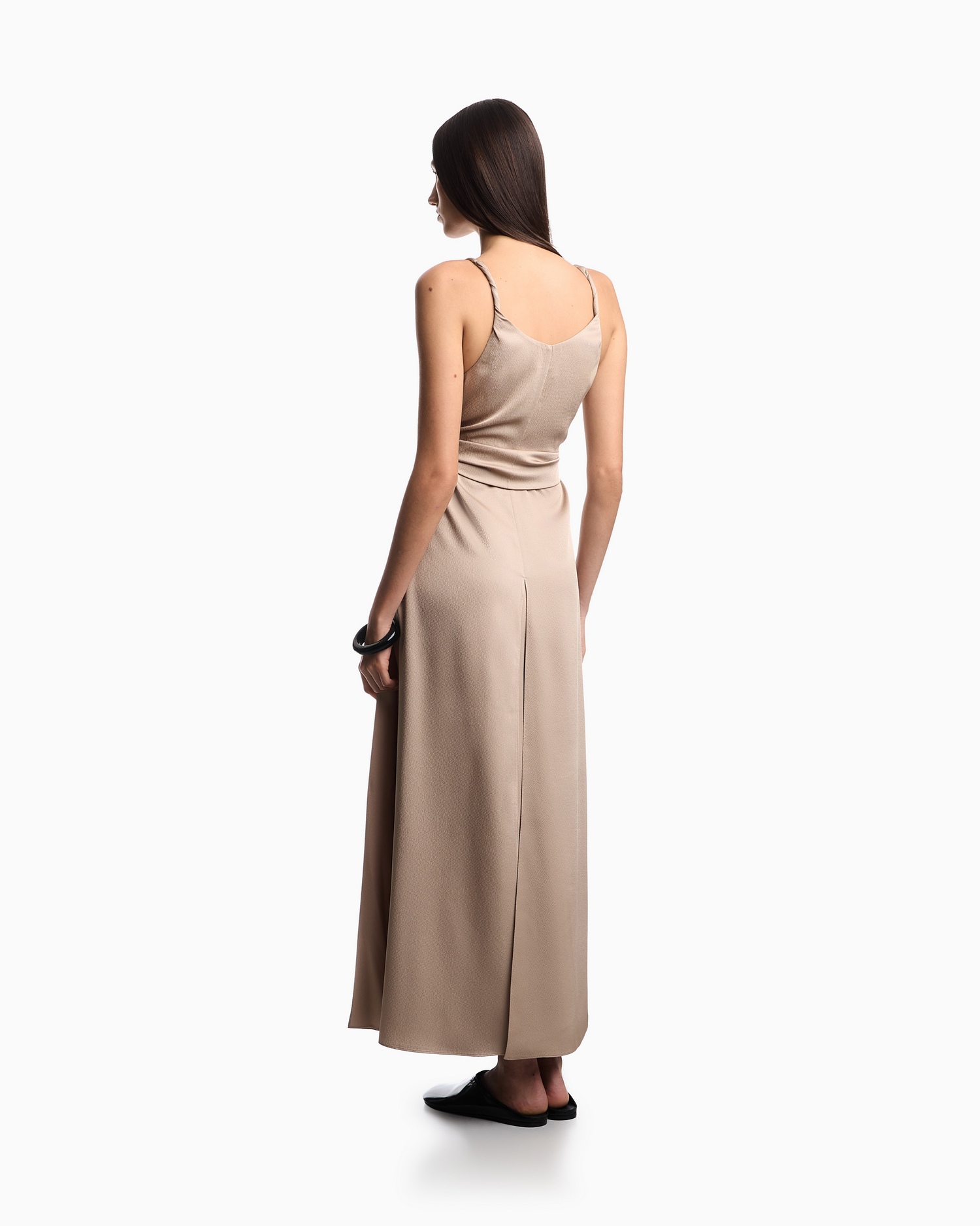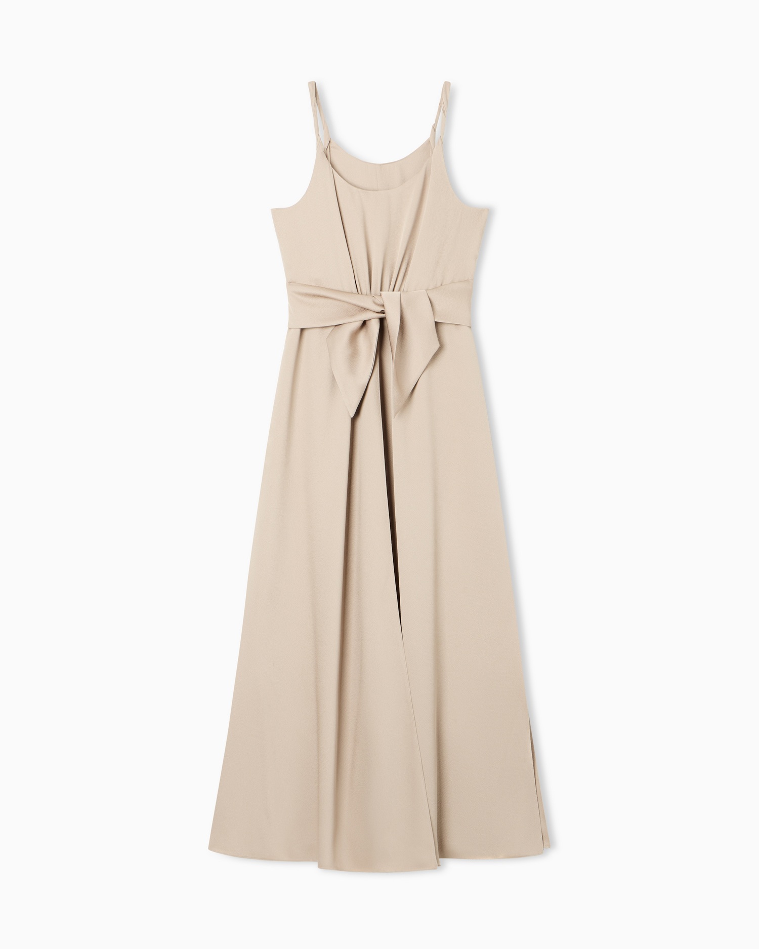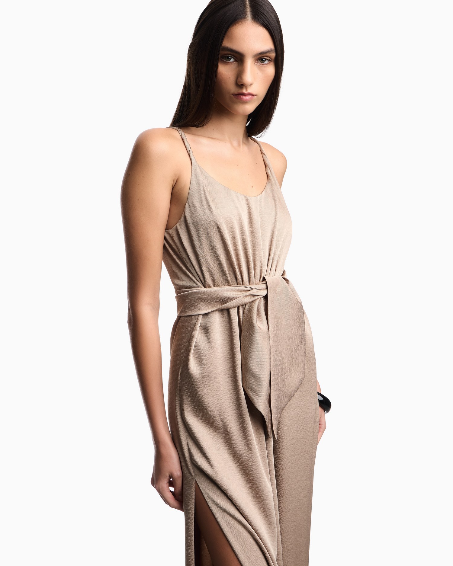 Abito lungo dal design essenziale e raffinato, caratterizzato da spalline sottili e corpetto con delicati drappeggi. La fascia annodata in vita valorizza la silhouette, mentre la linea fluida e morbida accompagna il movimento con eleganza. Perfetto per occasioni formali ed eventi speciali.