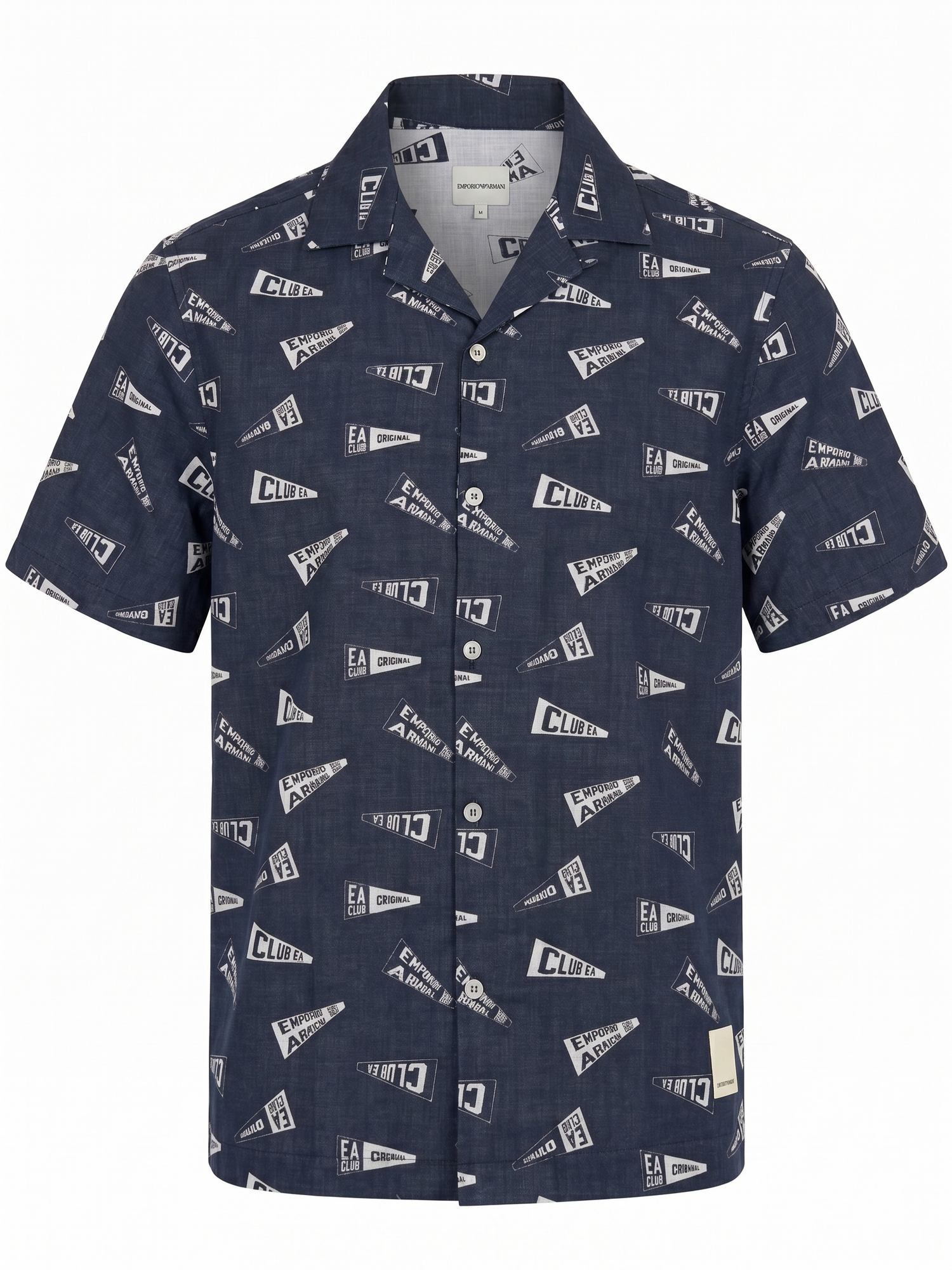 Camicia a maniche corte con motivo logo, colletto a punta, chiusura frontale con abbottonatura e tasca applicata.