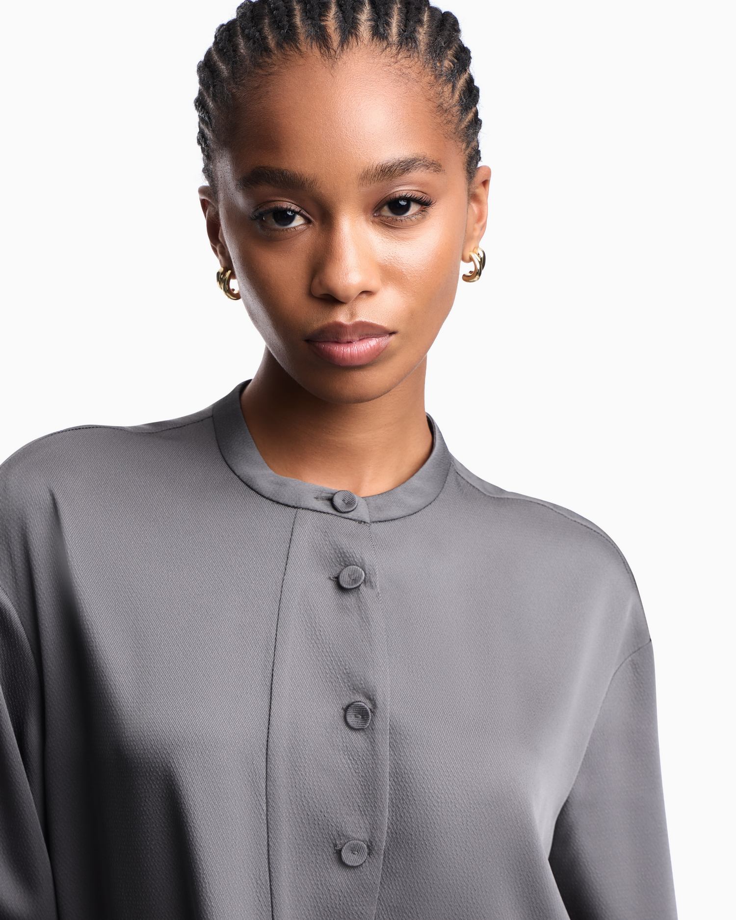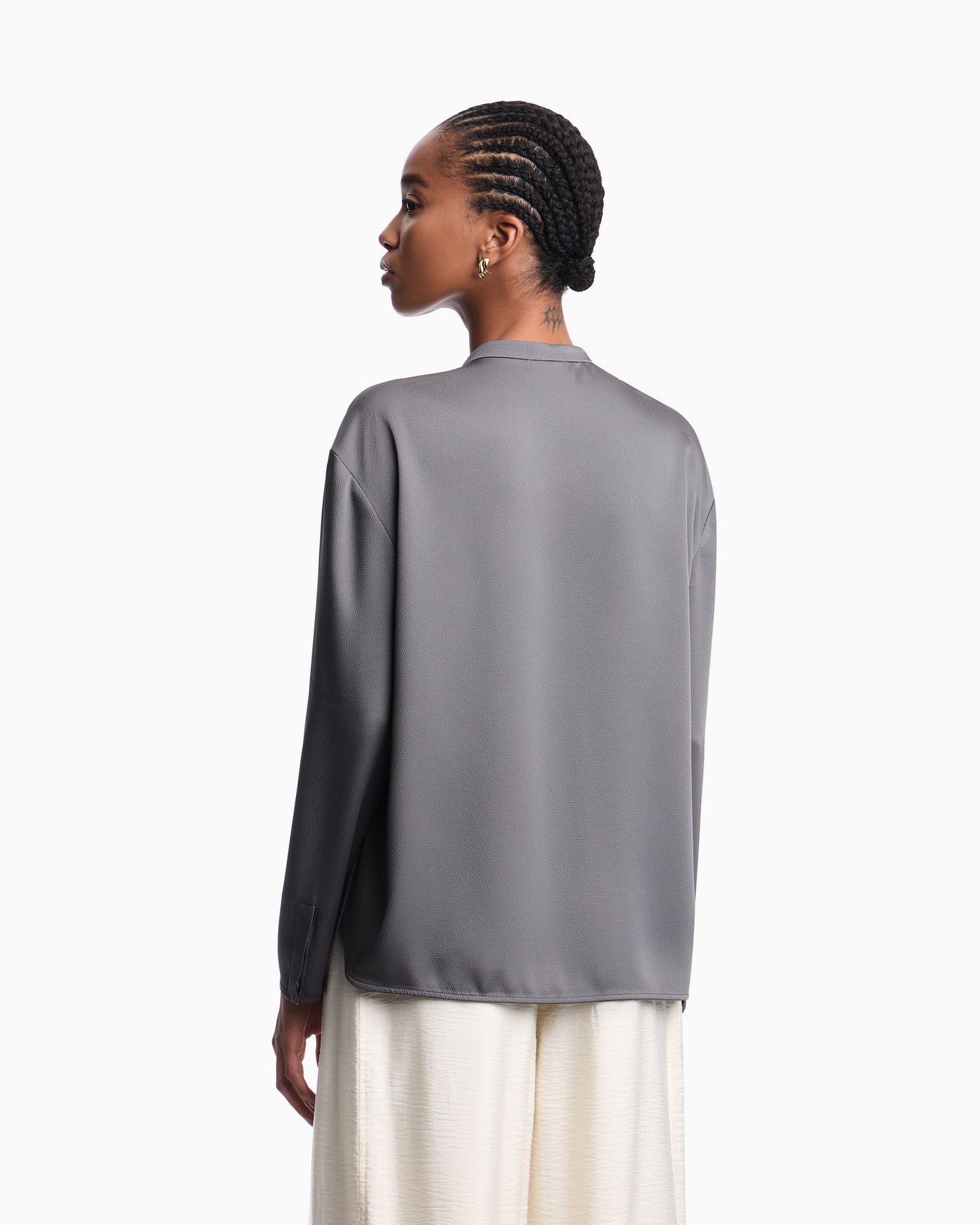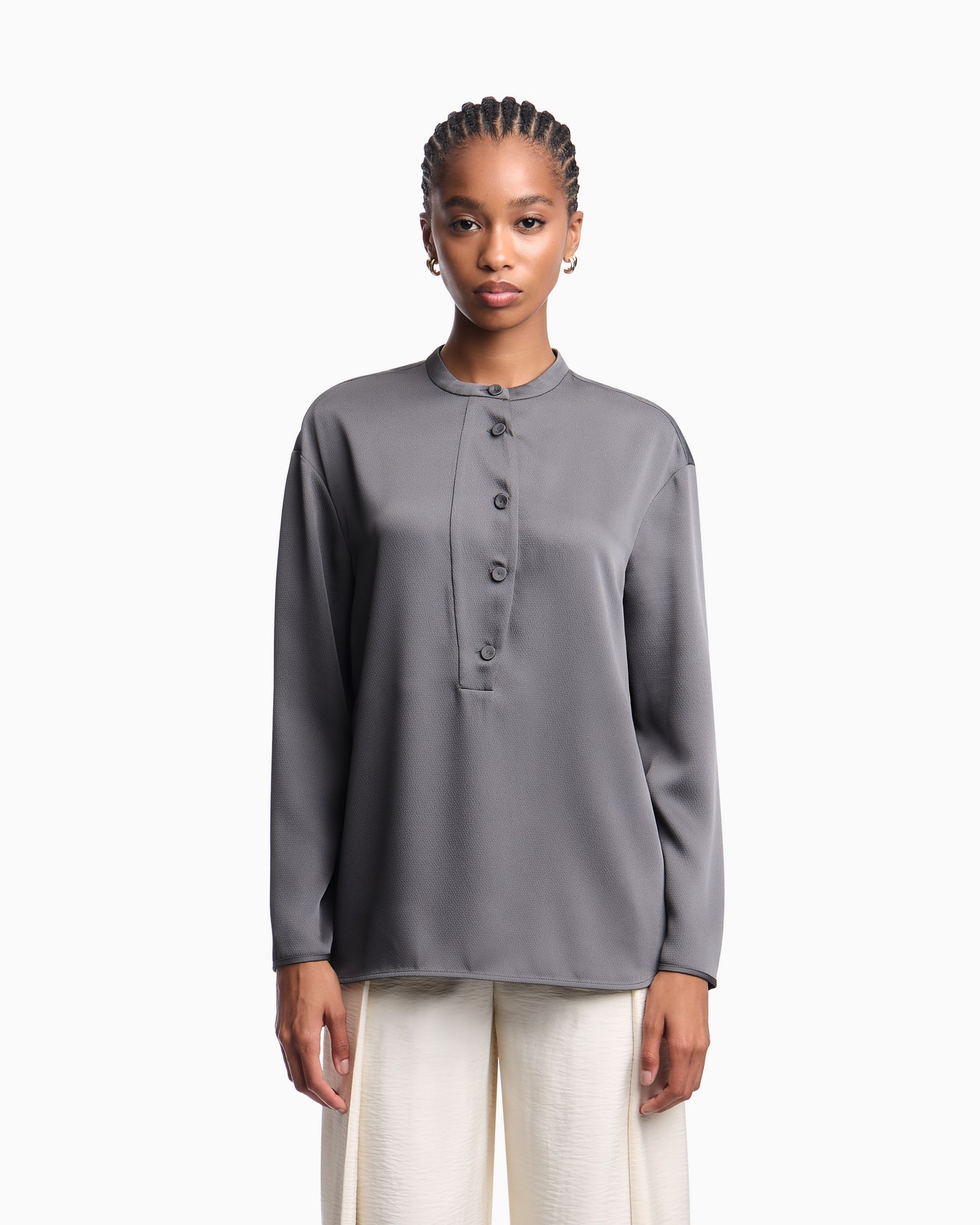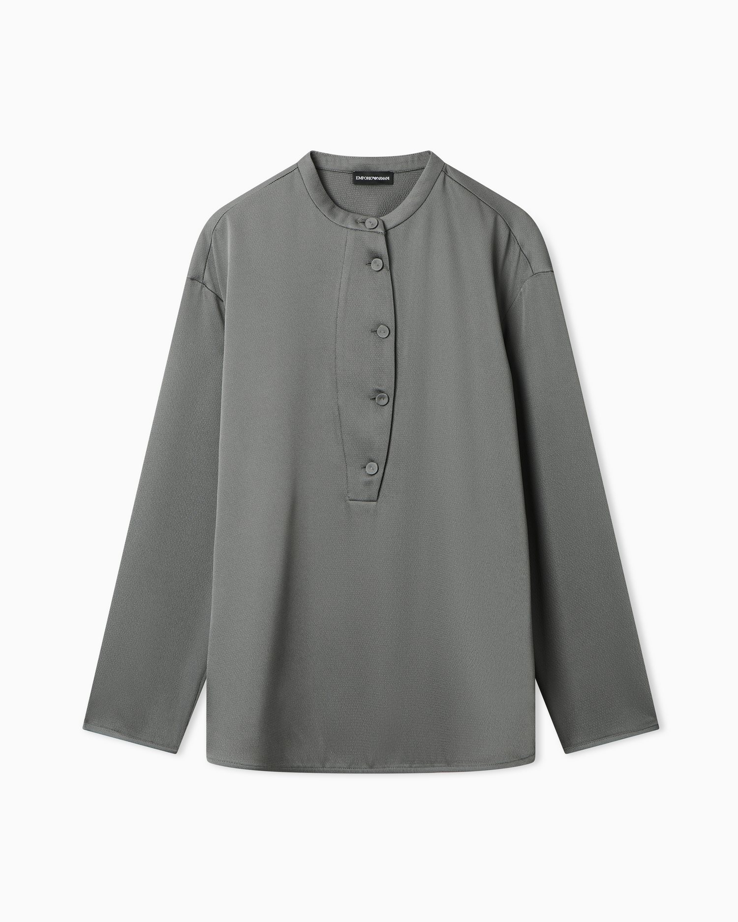 Camicia in twill crepe con collo guru, abbottonatura frontale, bottoni rivestiti, polsini con spacco e bottoni nascosti e spacchi laterali sul fondo.