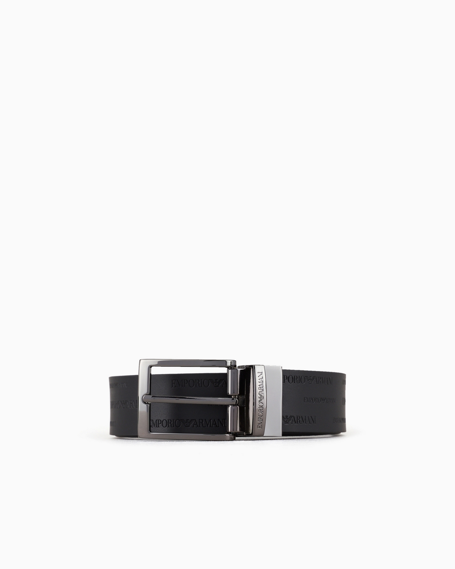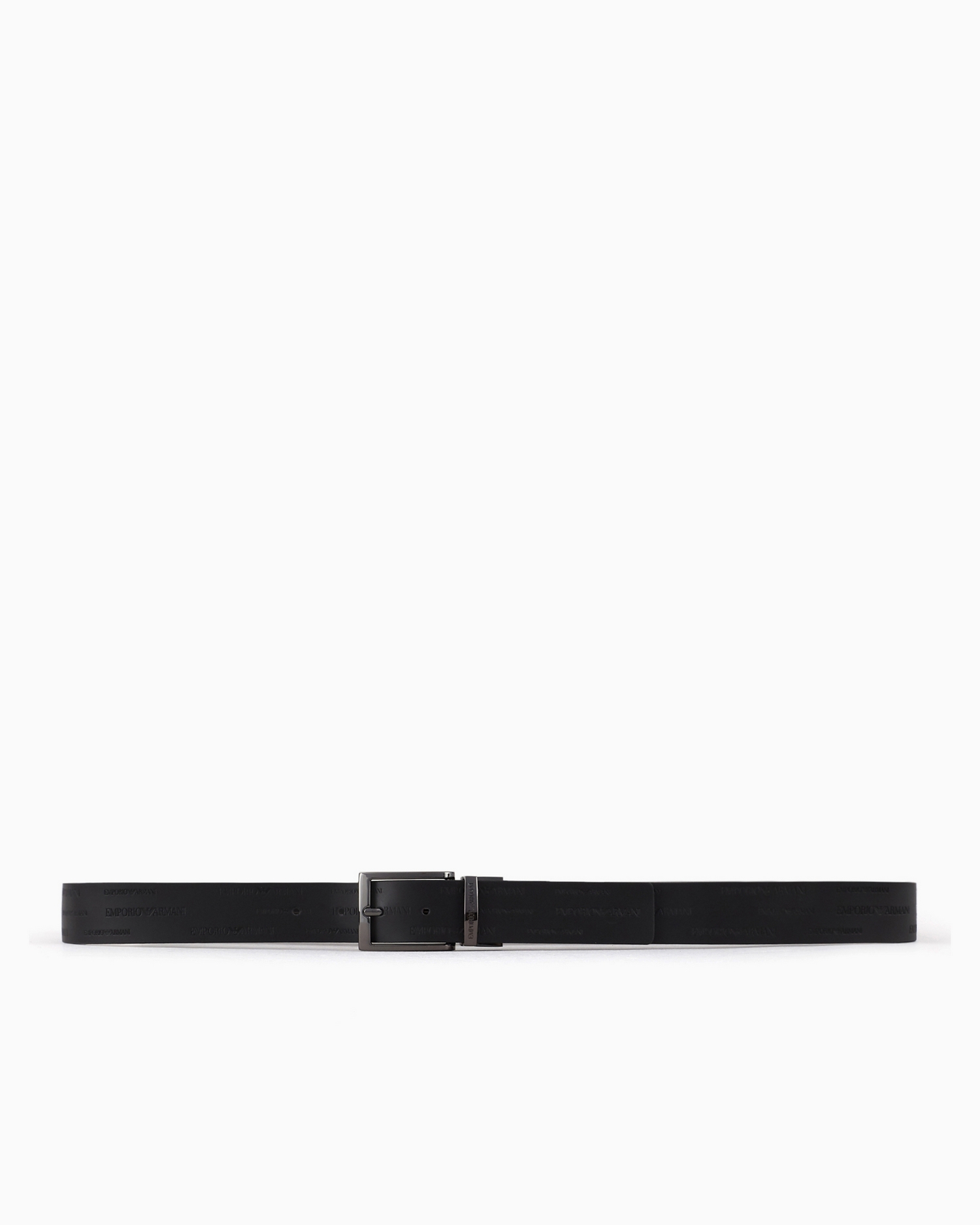 Cintura in pelle mostra finish liscio da lato esterno, mentre si caratterizza per il lettering Emporio Armani impresso all over dal lato interno e fibbia in metallo.