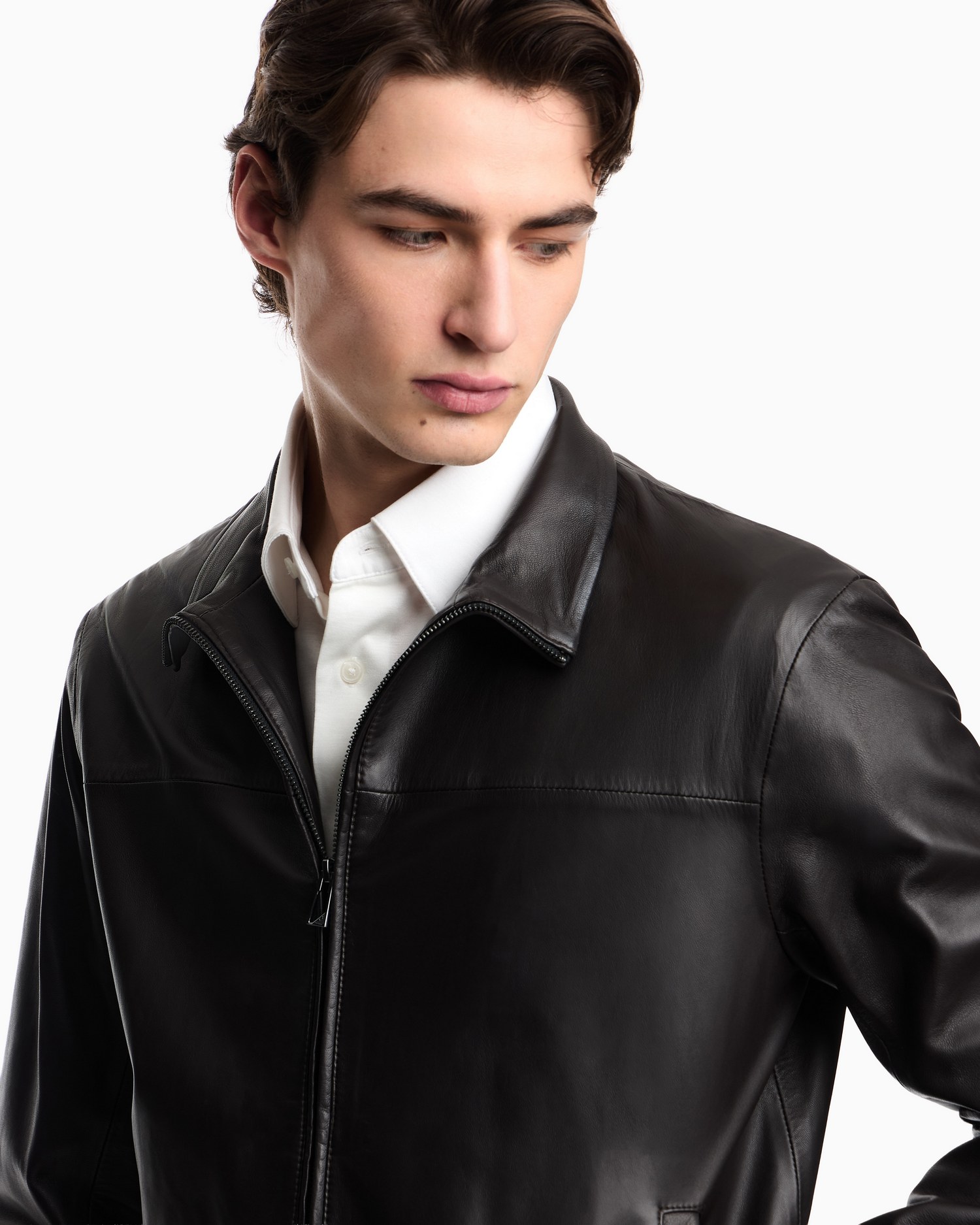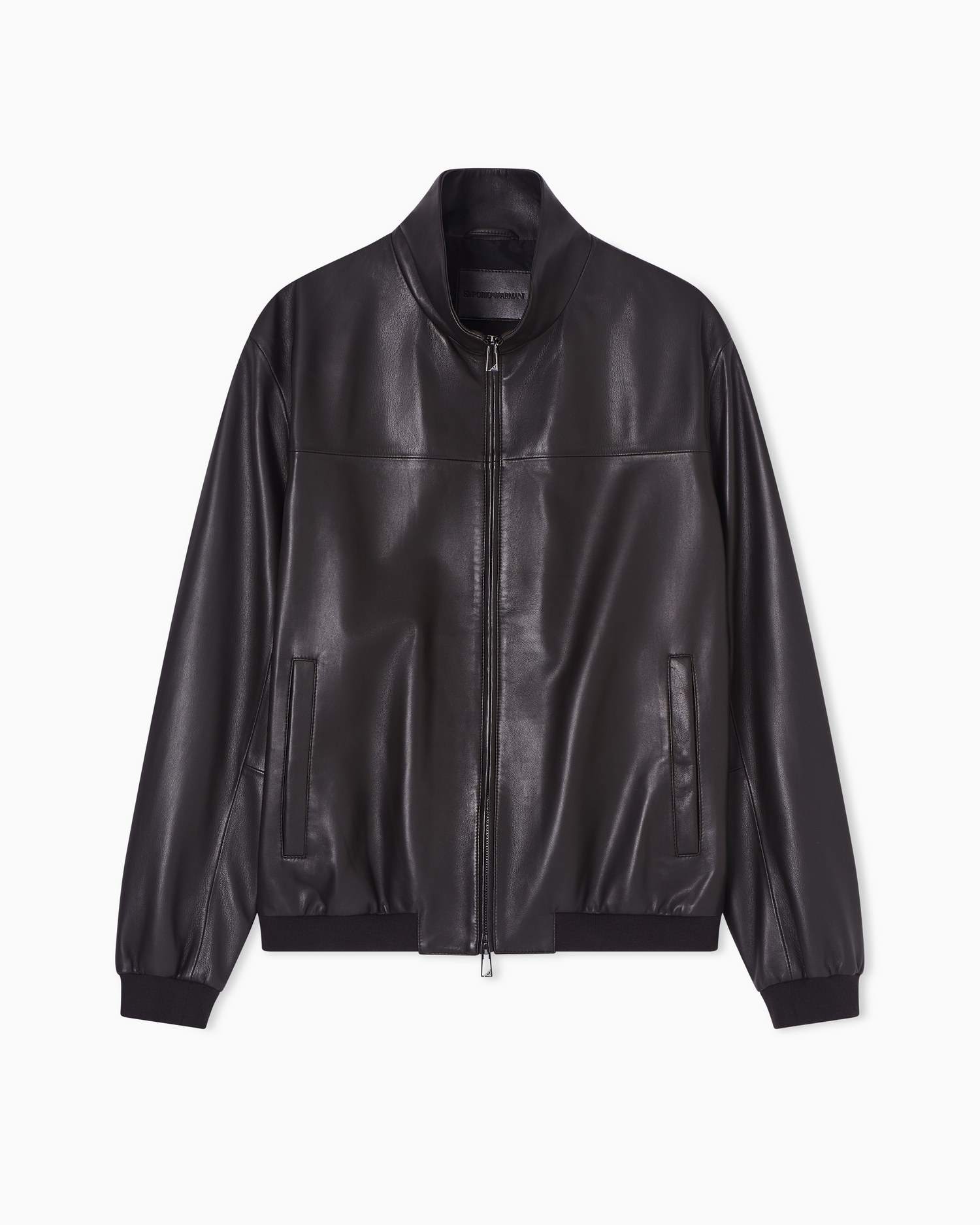 Giacca in nappa di agnello con chiusura full zip, polsini in maglia tecnica, tasche laterali, fondo in maglia tecnica, patch logo in pelle interno su schiena e tasca interna a filetto con profilo in pelle.